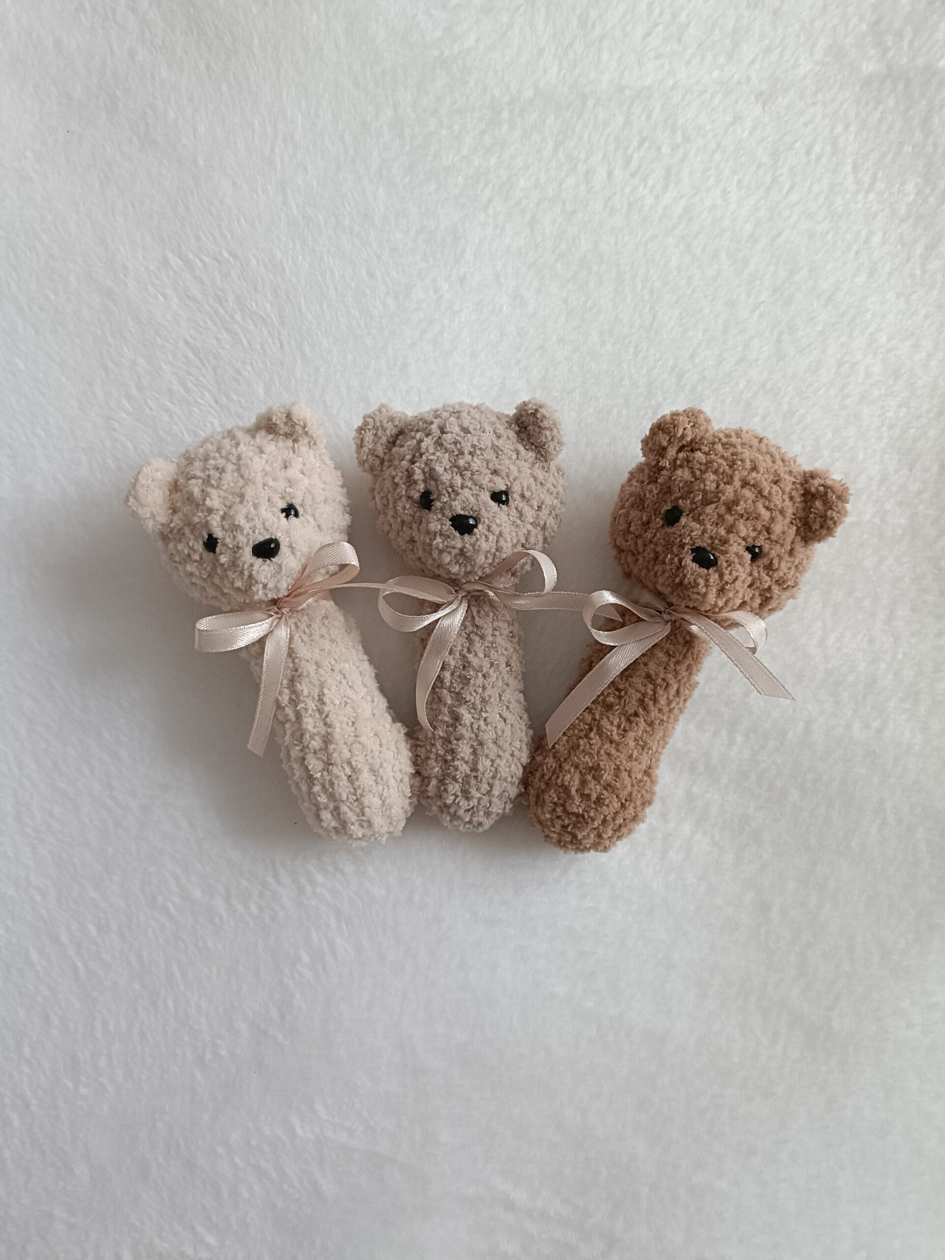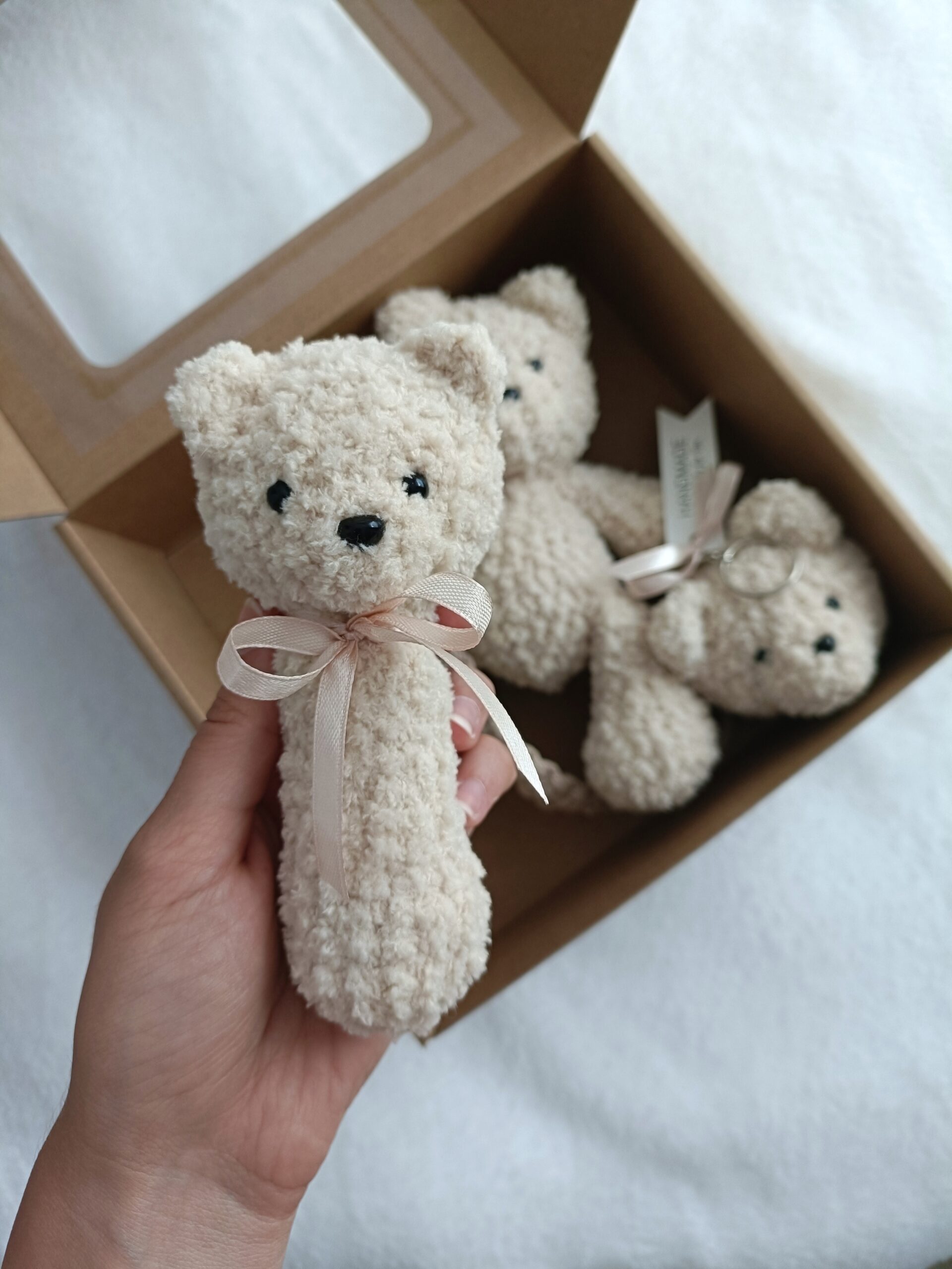 Grzechotka miś z kolekcji Boucle Bear wykonana na szydełku z certyfikowanych materiałów. Wypełniona antyalergiczną kulką silikonową. Mierzy ok. 13 cm. Ozdobiona delikatną kokardką. Kolor jasny beż nr 310.
