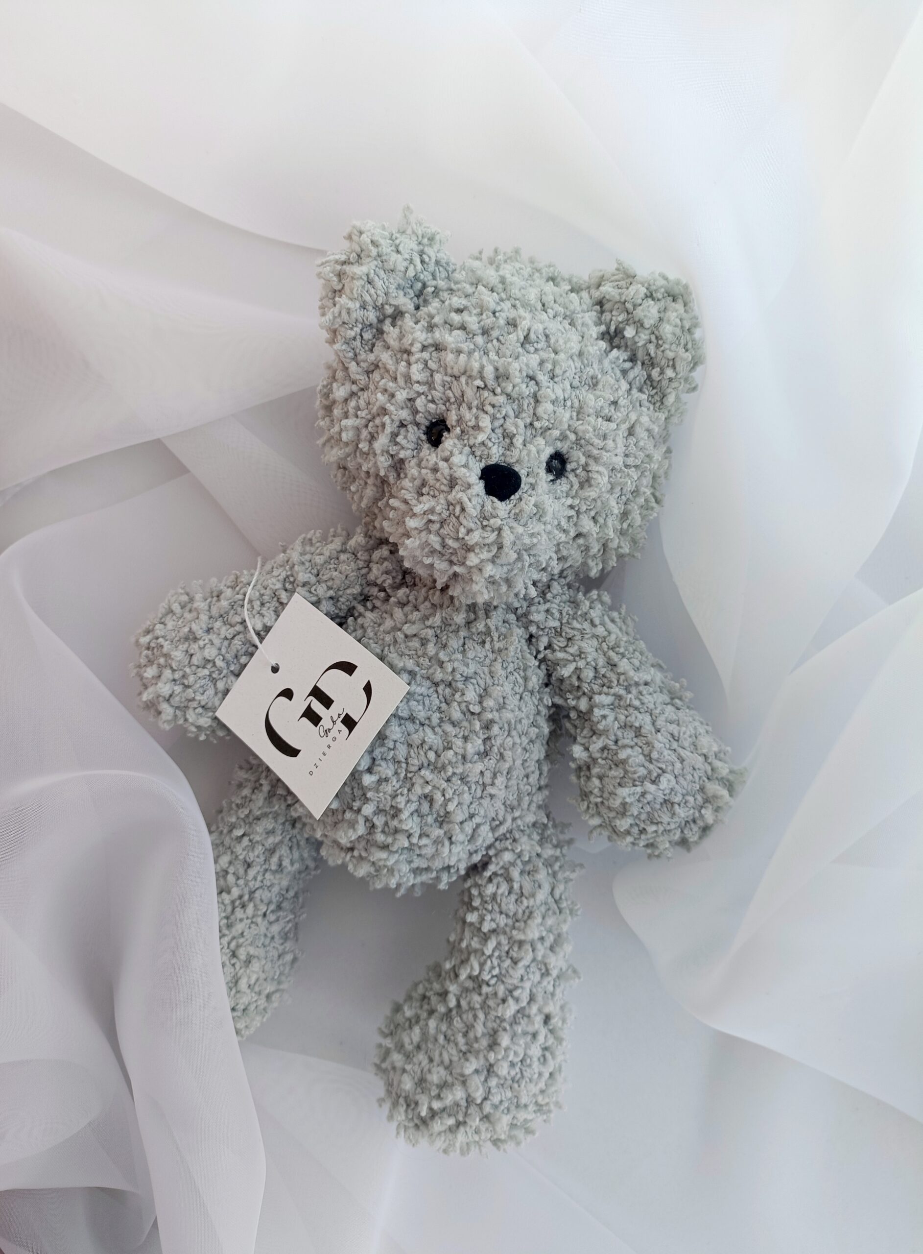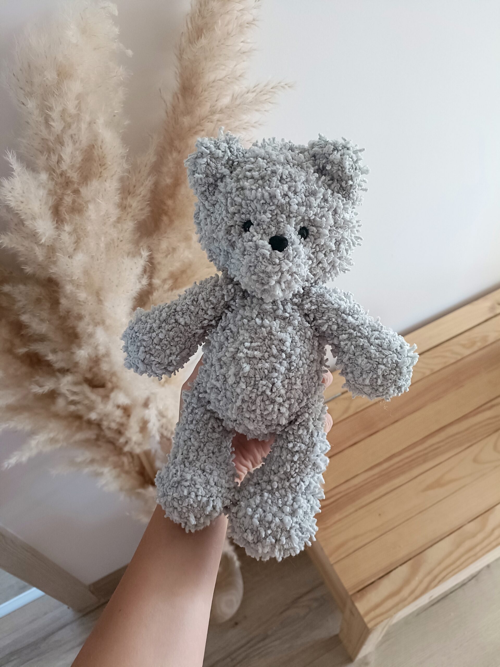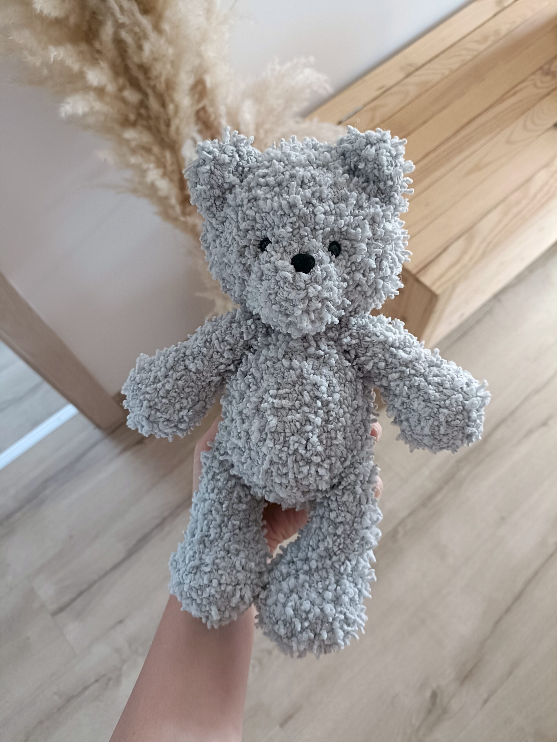 Kudłaty miś wykonany na szydełku z wyjątkowo milutkiej włóczki posiadającej ciekawą strukturę. Wypełniony antyalergiczną kulką silikonową przeznaczoną do maskotek. Miś mierzy ok. 26 cm.