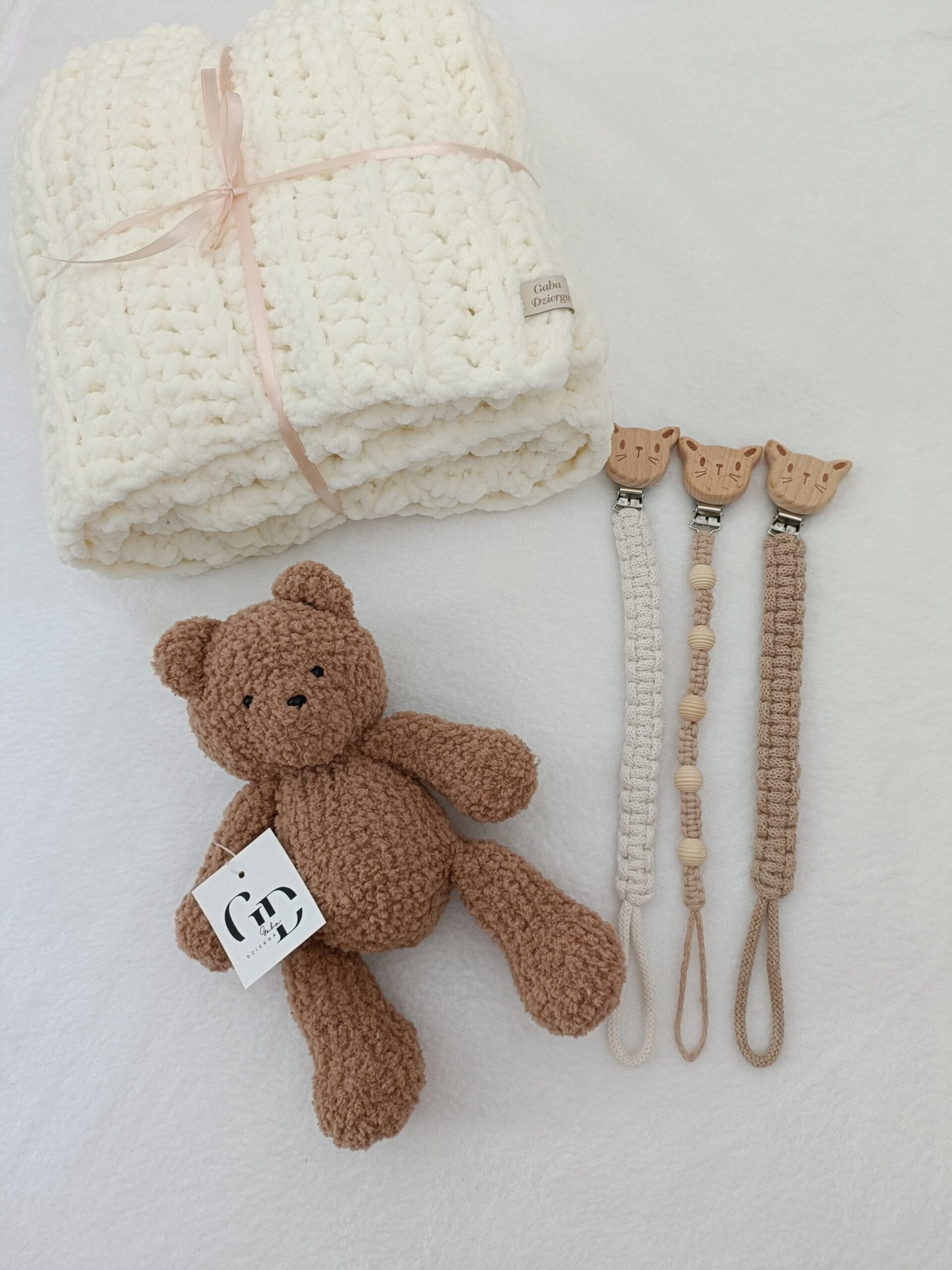 Miś z kolekcji Boucle Bear wykonany na szydełku z wyjątkowo milutkiej włóczki posiadającej certyfikat jakości OEKO-TEX Standard 100. Wypełniony antyalergiczną kulką silikonową przeznaczoną do maskotek. Miś mierzy ok. 24 cm. Kolor brązowy nr 199.