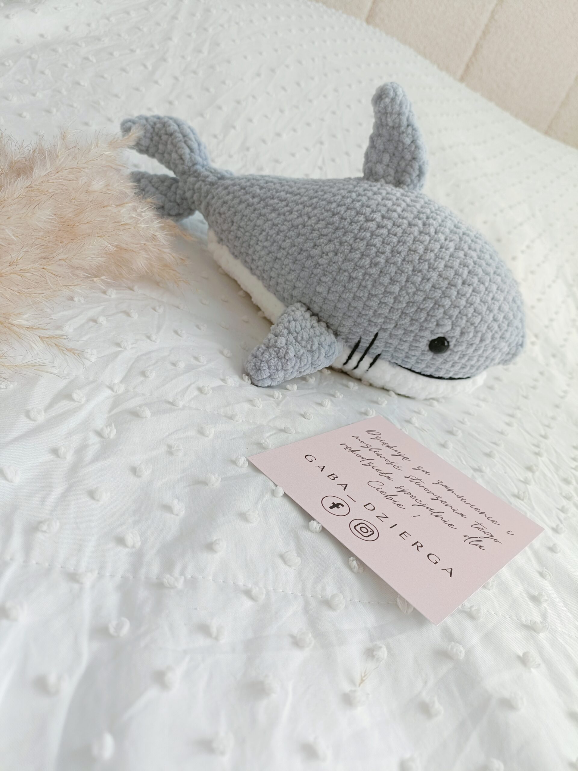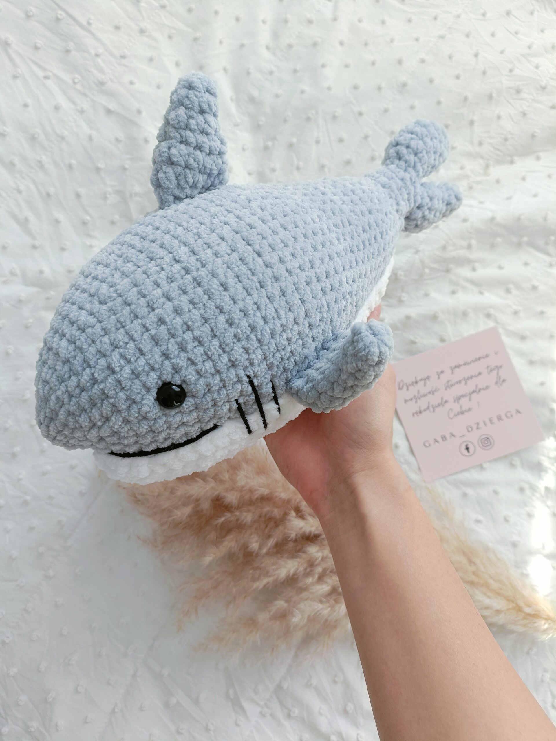 Szydełkowy rekin to wyjątkowa maskotka stworzona ręcznie z dbałością o każdy detal. Została wykonana z miękkiej pluszowej włóczki, która posiada certyfikat OEKO-TEX Standard 100, potwierdzający jakość materiału.