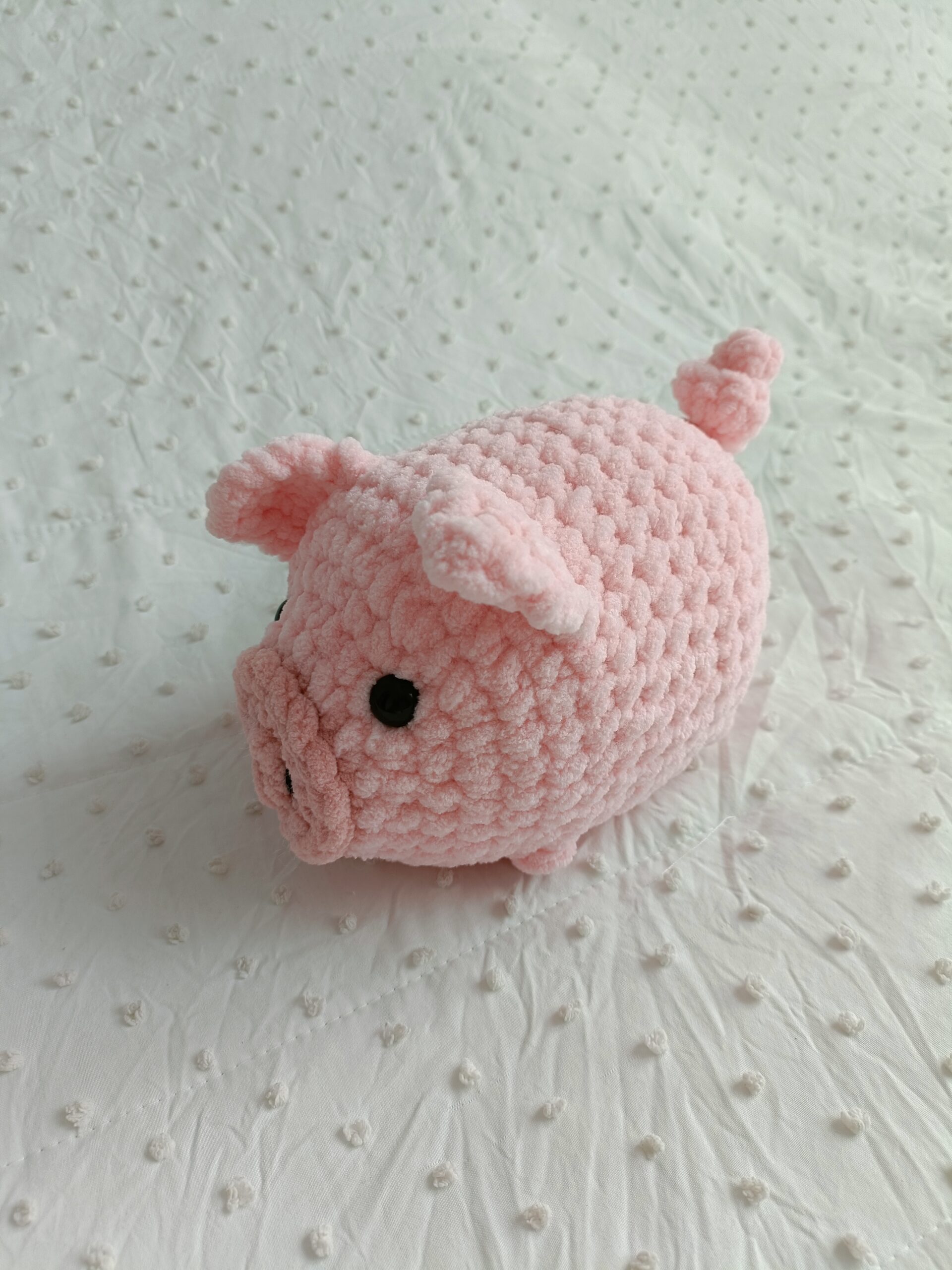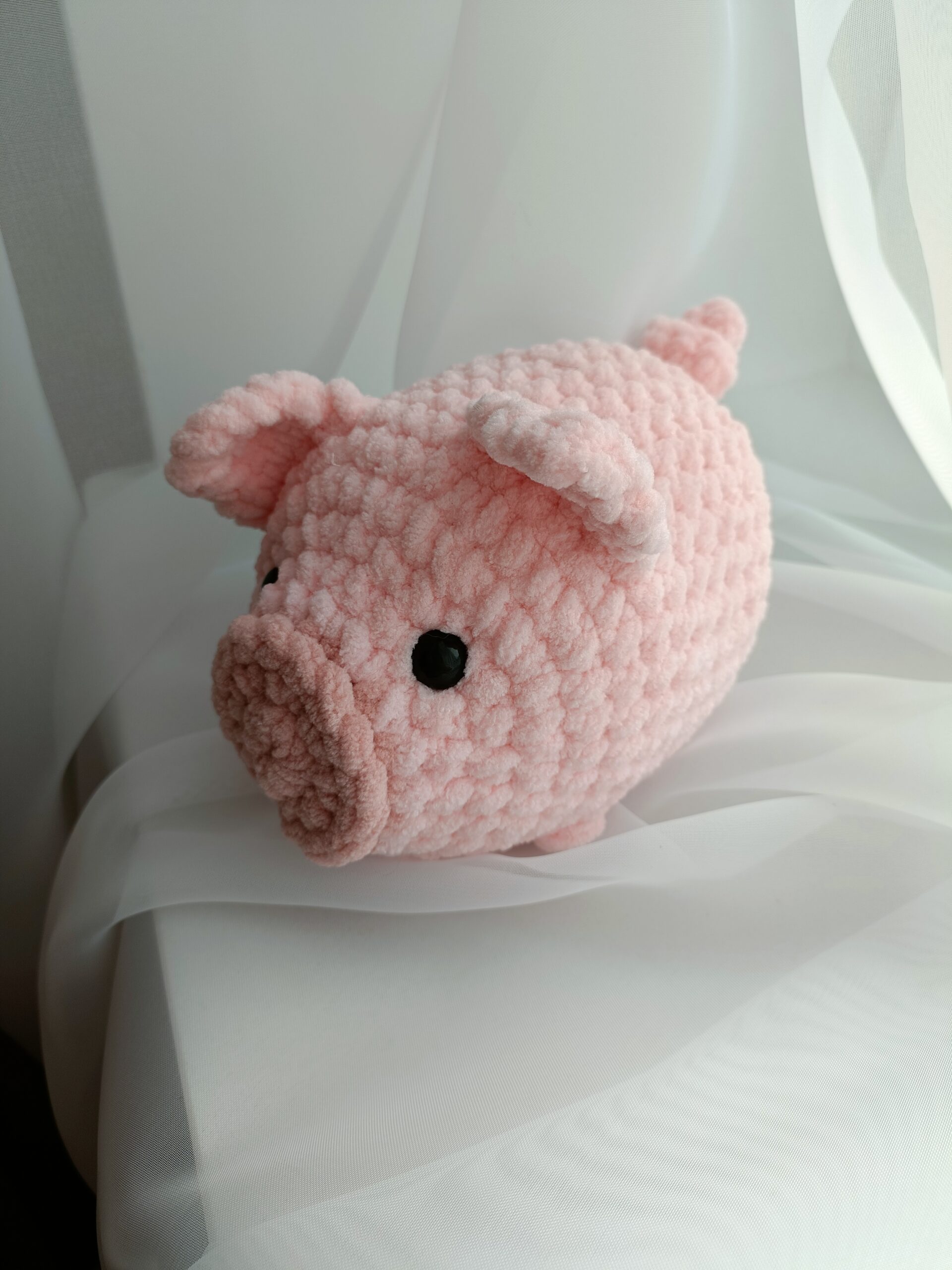 Świnka wyróżnia się uroczym wyglądem i starannym wykonaniem, dlatego świetnie sprawdzi się jako dekoracja wnętrza, element kolekcji maskotek lub wyjątkowy prezent handmade.