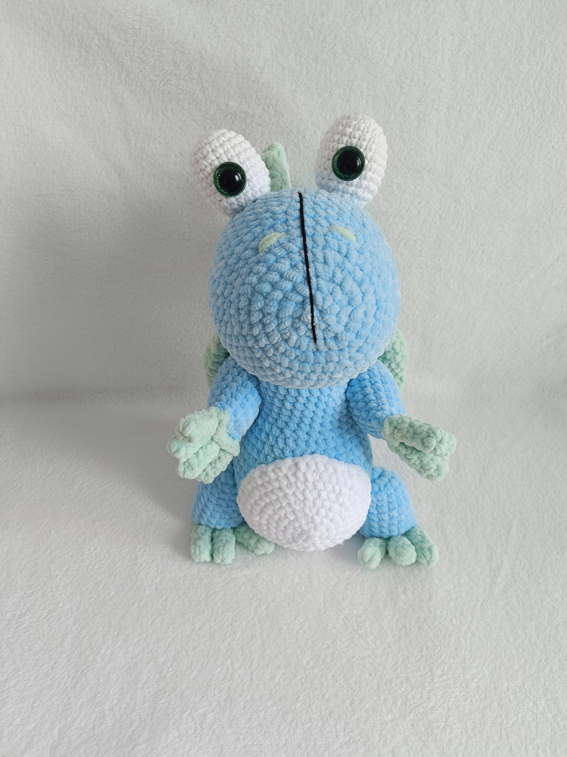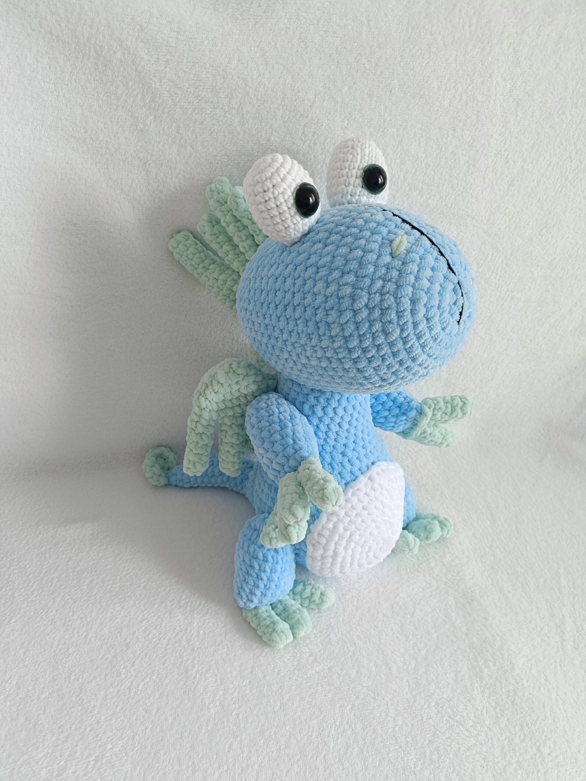 Szydełkowy smok to wyjątkowa maskotka stworzona ręcznie z dbałością o każdy detal. Została wykonana z miękkiej pluszowej włóczki, która posiada certyfikat OEKO-TEX Standard 100, potwierdzający jakość materiału.