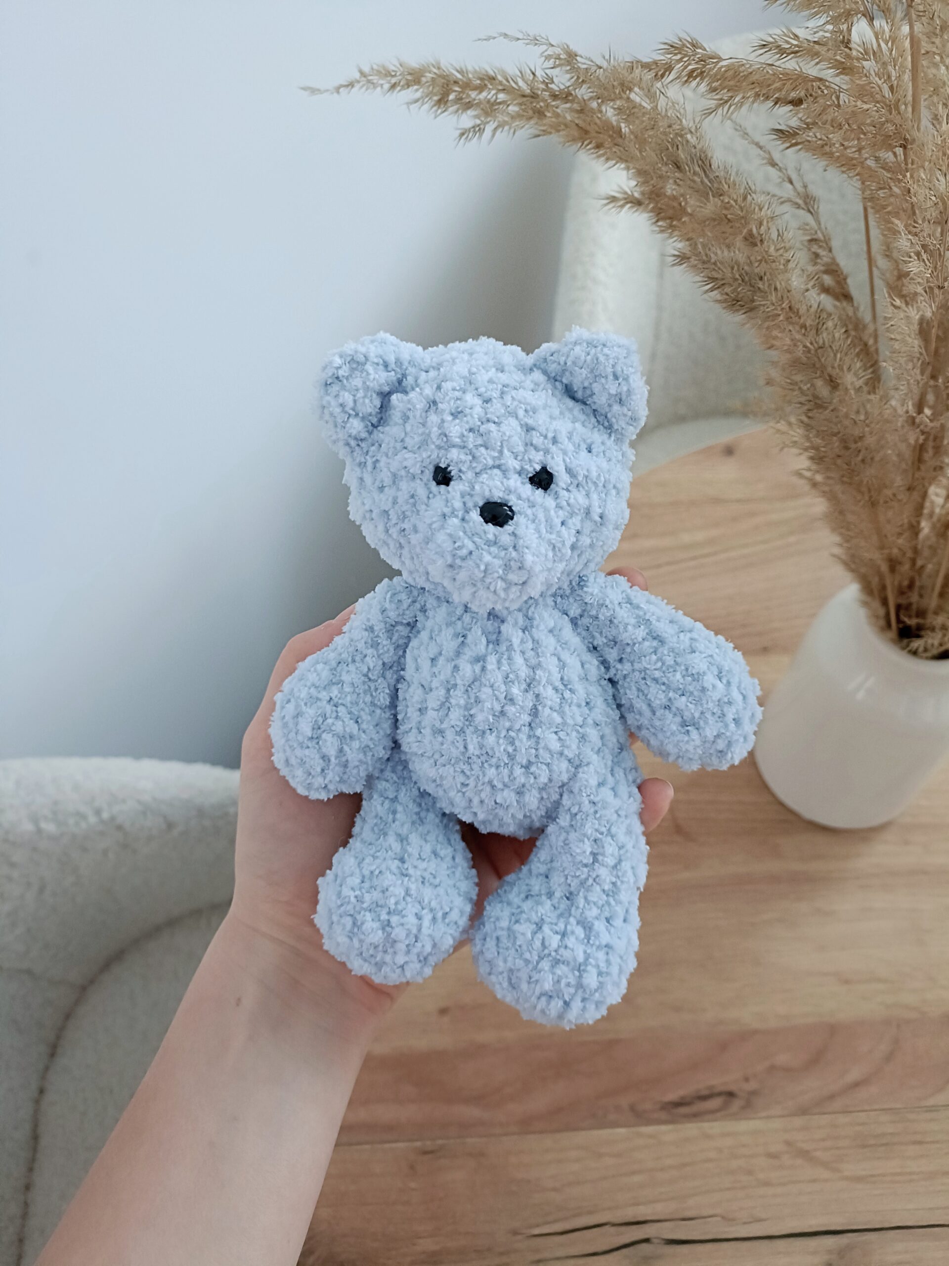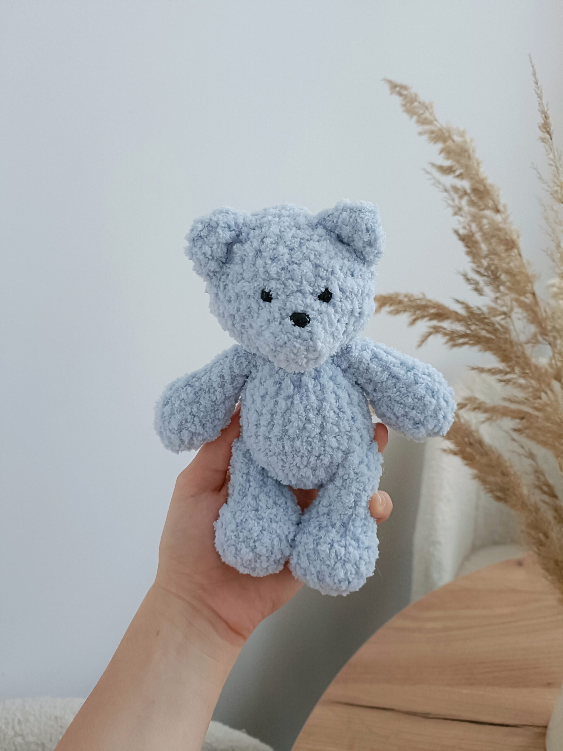 Miś z kolekcji Boucle Bear wykonany na szydełku z wyjątkowo milutkiej włóczki posiadającej certyfikat jakości OEKO-TEX Standard 100. Wypełniony antyalergiczną kulką silikonową przeznaczoną do maskotek. Miś mierzy ok. 18 cm. Kolor jasny błękitny nr 500.