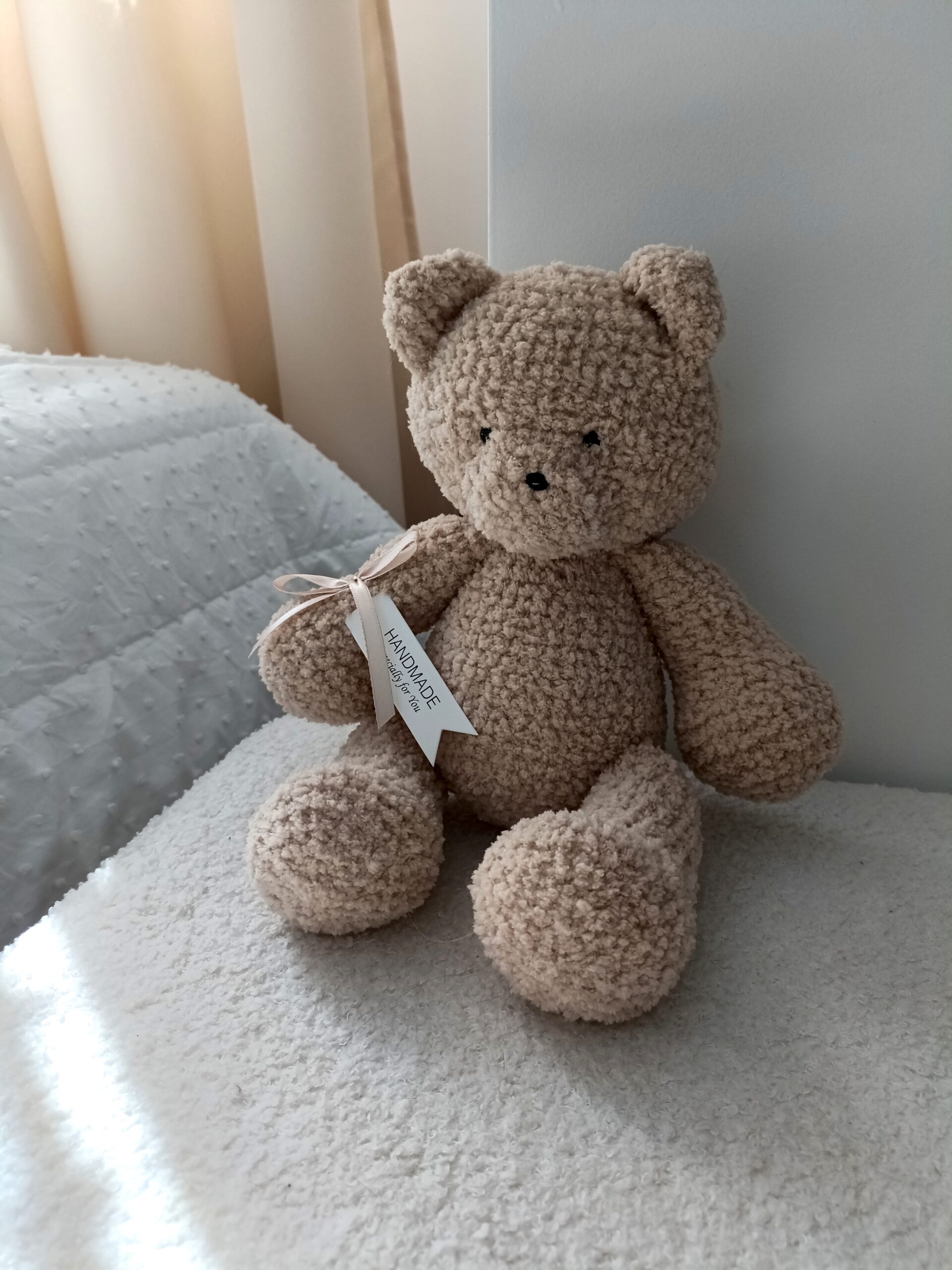 Miś z kolekcji Boucle Bear wykonany na szydełku z wyjątkowo milutkiej włóczki posiadającej certyfikat jakości OEKO-TEX Standard 100. Wypełniony antyalergiczną kulką silikonową przeznaczoną do maskotek. Miś mierzy ok. 30 cm. Kolor beżowy nr 382.