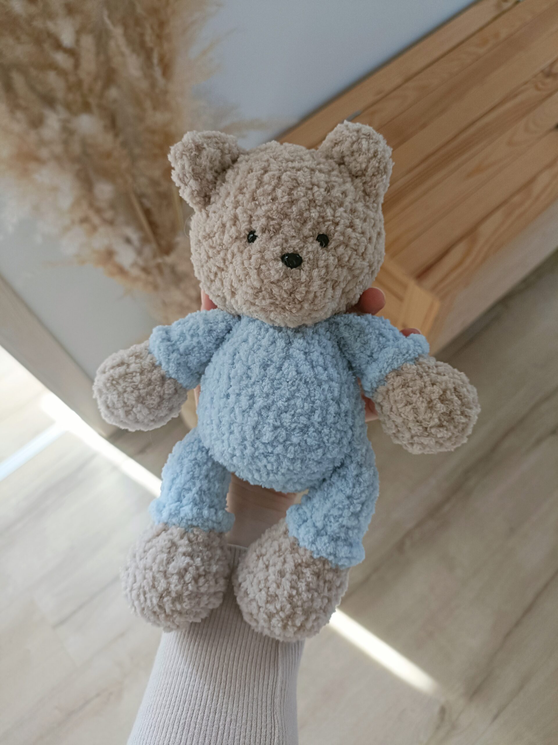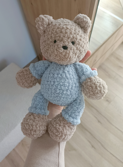 Miś z kolekcji Boucle Bear wykonany na szydełku z wyjątkowo milutkiej włóczki posiadającej certyfikat jakości OEKO-TEX Standard 100. Wypełniony antyalergiczną kulką silikonową przeznaczoną do maskotek. Miś mierzy ok. 22 cm. Kolor beżowy 115 i jasny błękit nr 500.