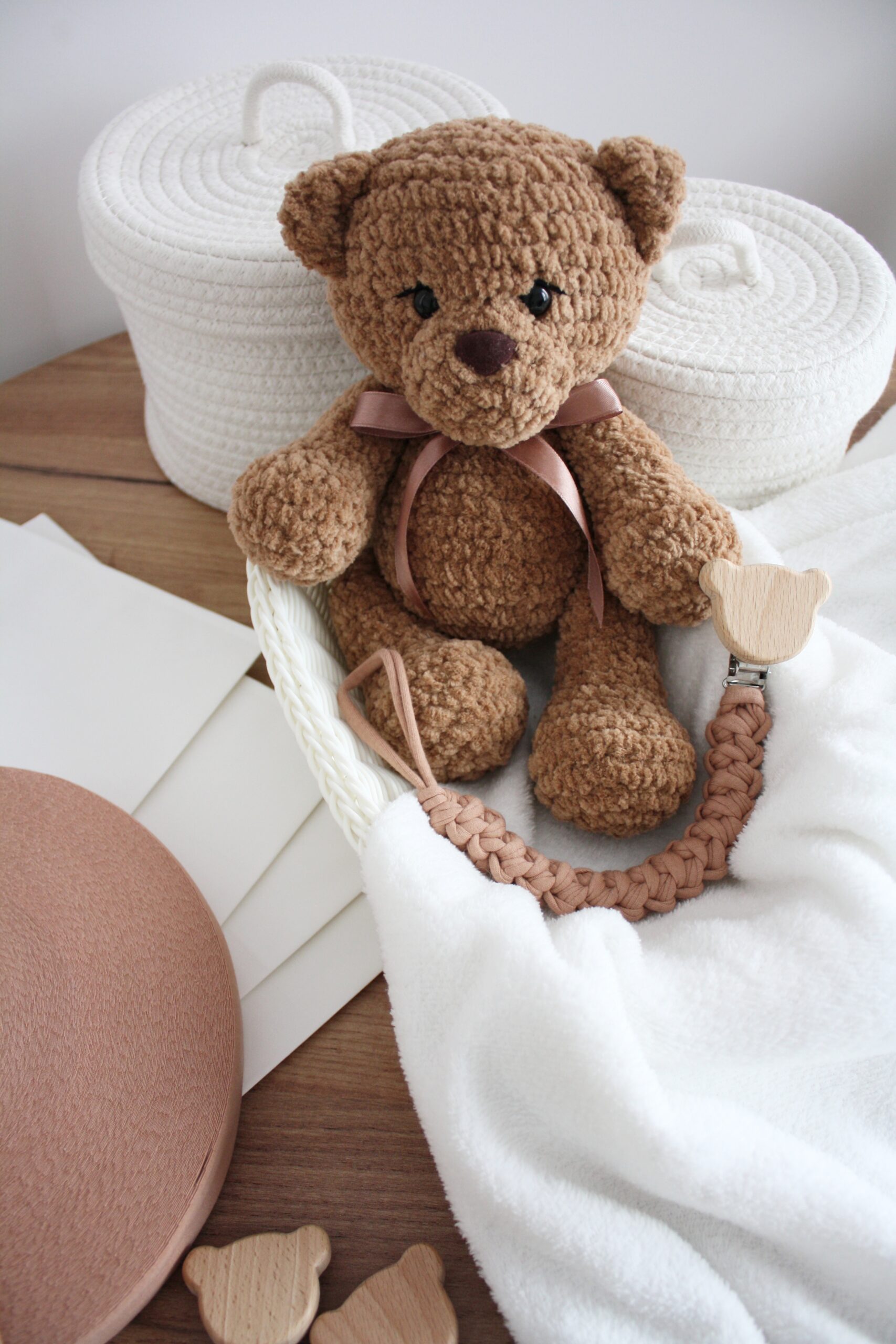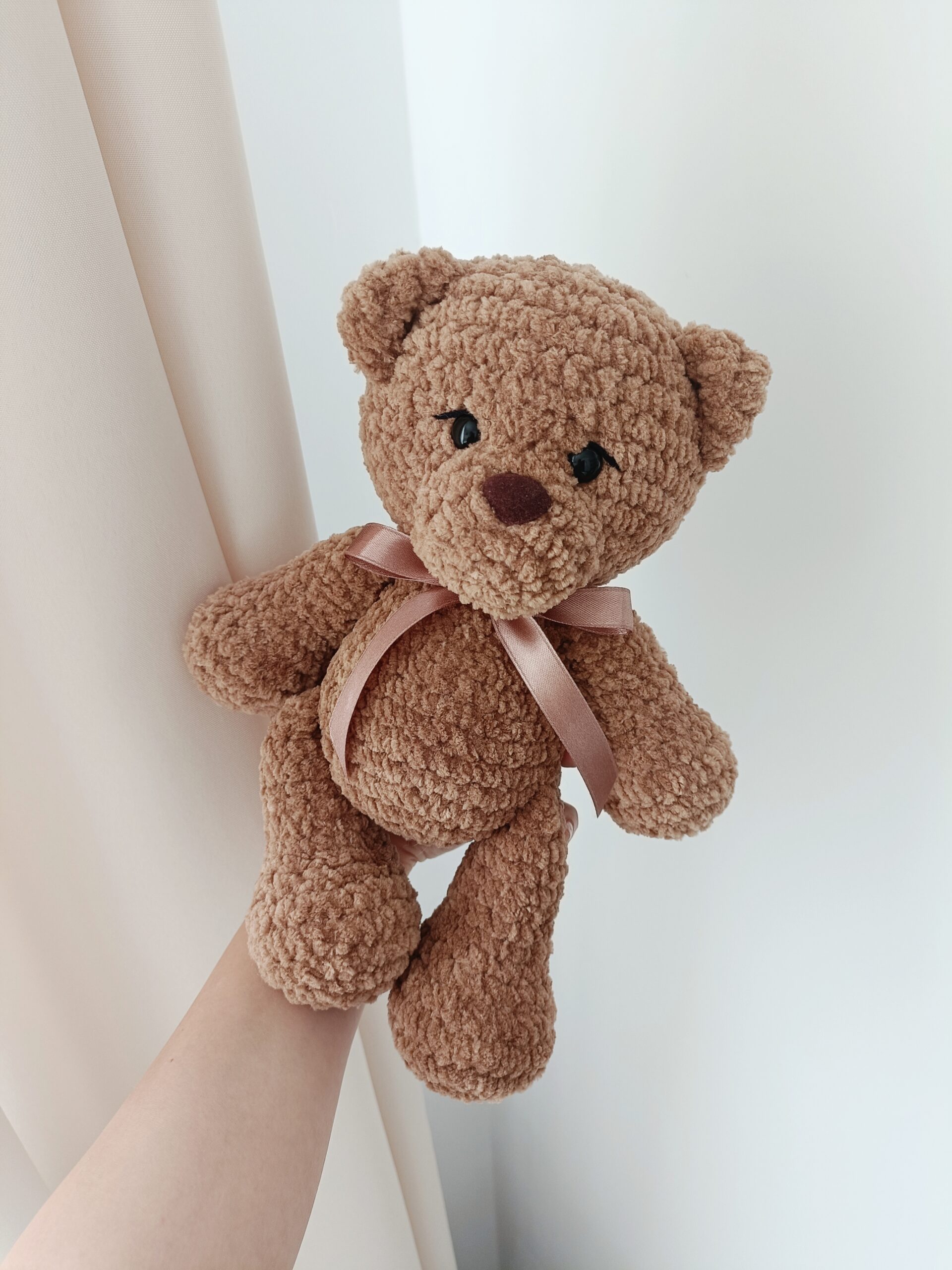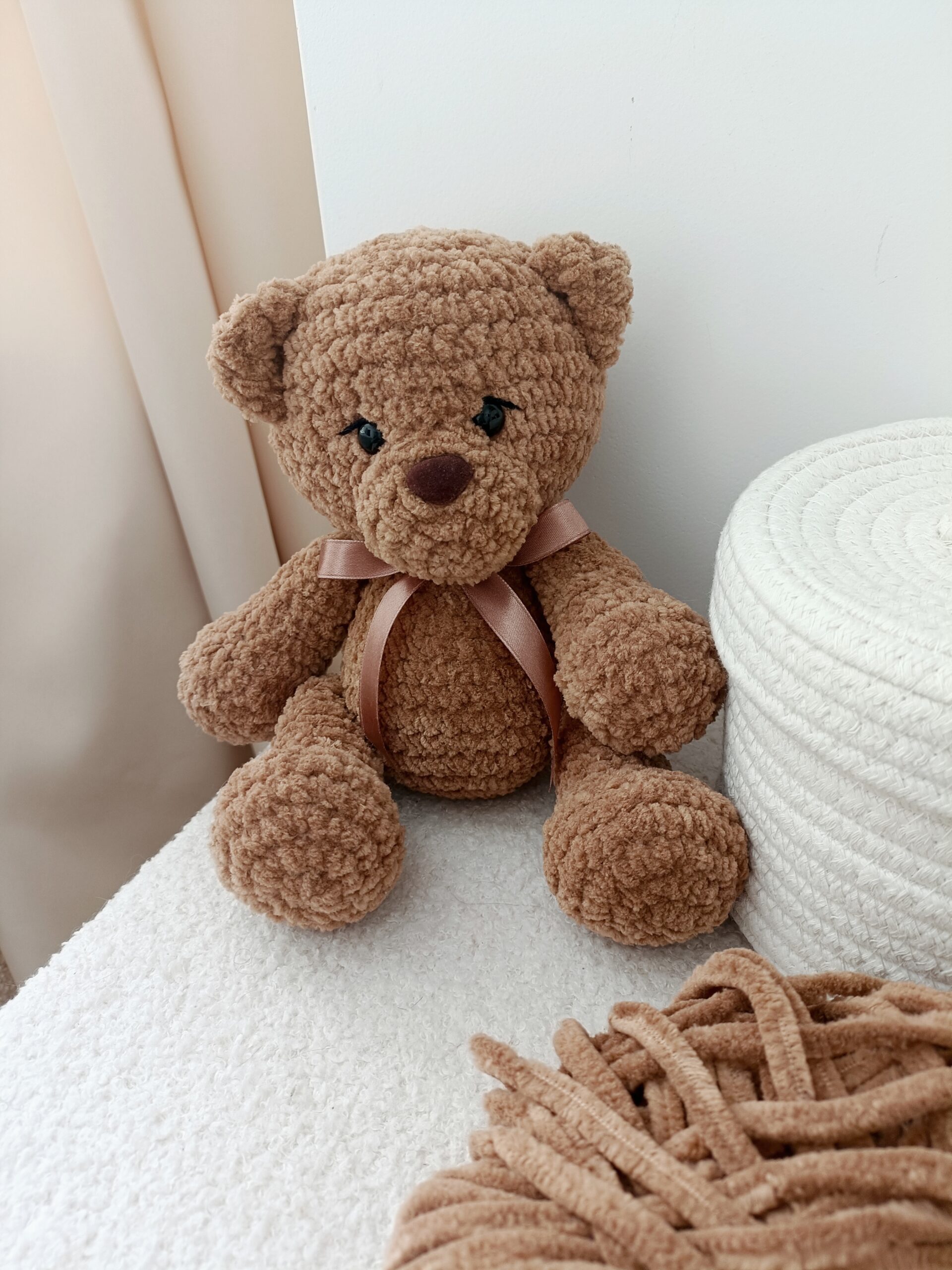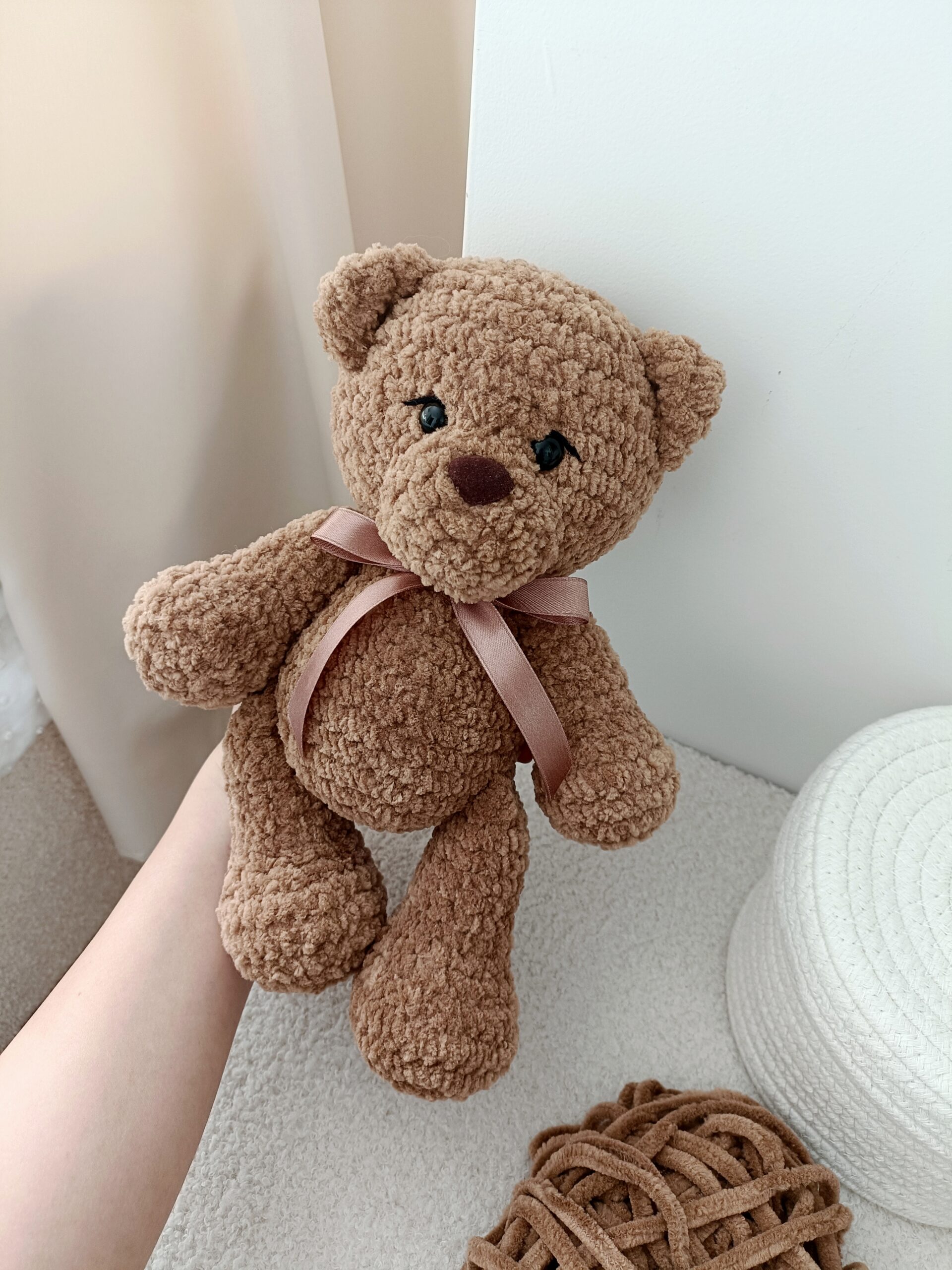 Ten uroczy miś wykonany na szydełku to wyjątkowa maskotka stworzona ręcznie z dbałością o każdy detal. Została wykonana z miękkiej pluszowej włóczki, która posiada certyfikat OEKO-TEX Standard 100, potwierdzający jakość materiału.