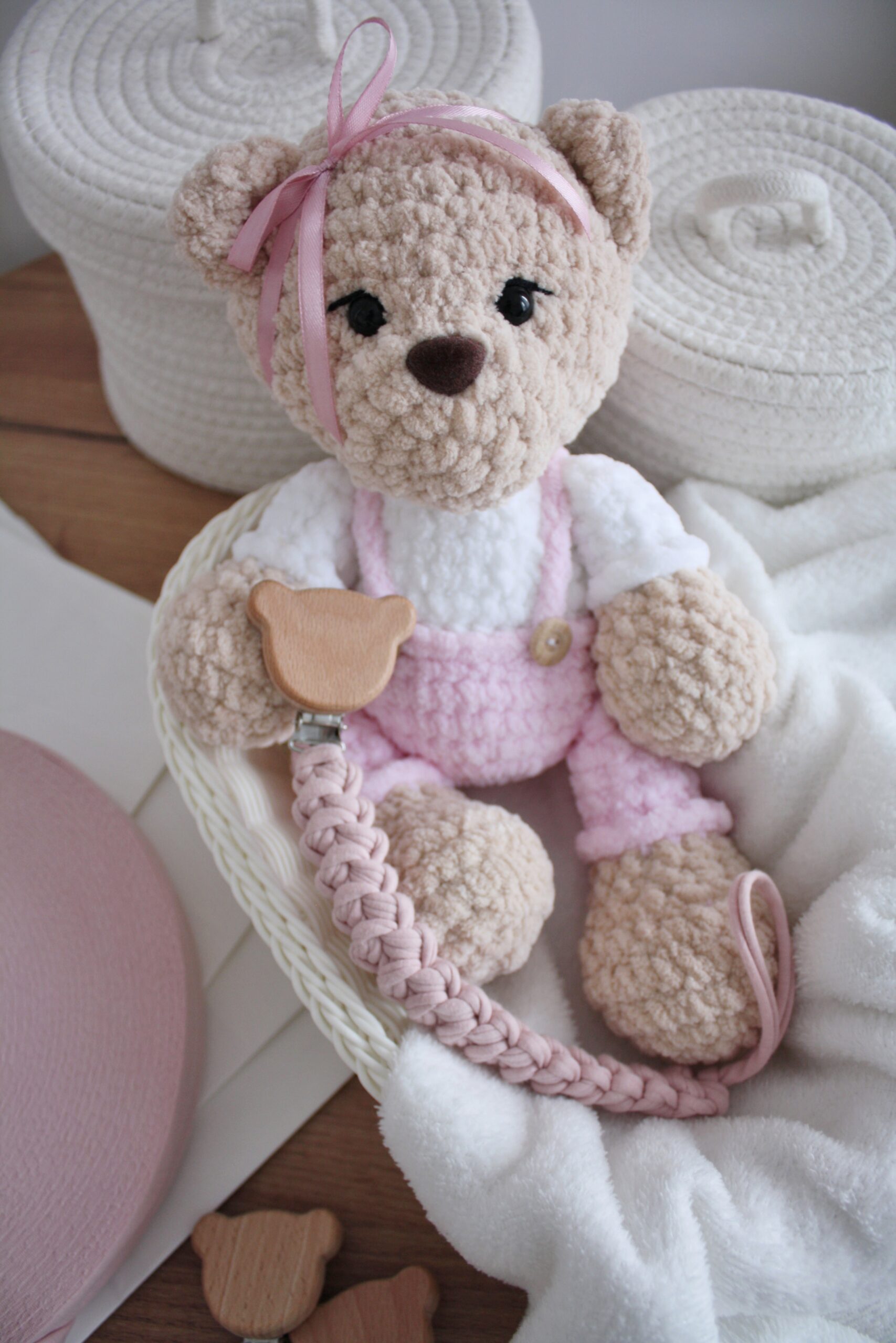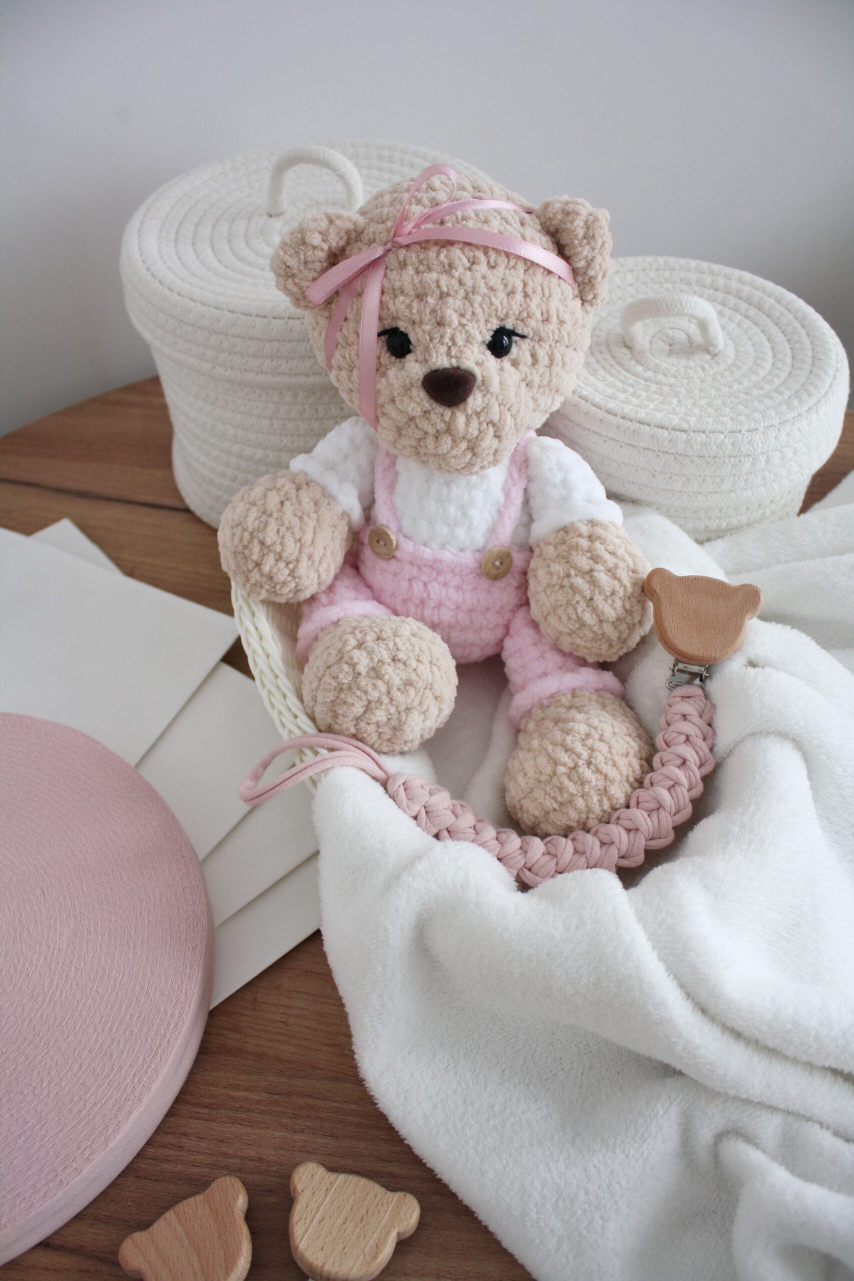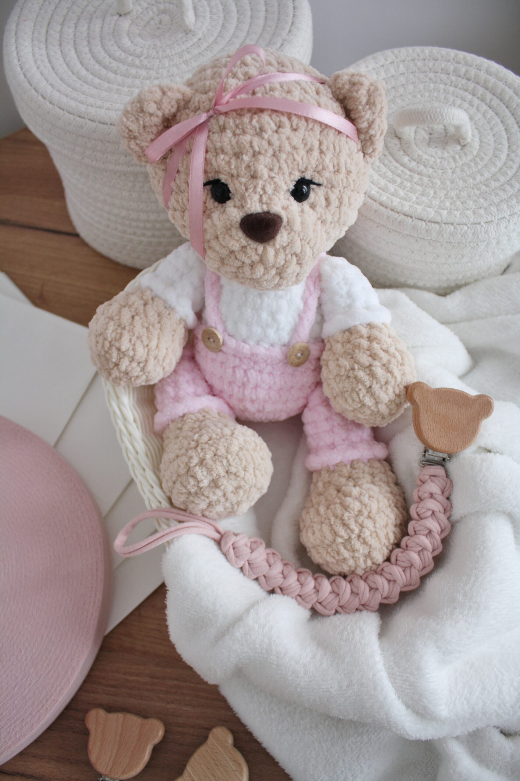 Ten uroczy miś wykonany na szydełku to wyjątkowa maskotka stworzona ręcznie z dbałością o każdy detal. Została wykonana z miękkiej pluszowej włóczki, która posiada certyfikat OEKO-TEX Standard 100, potwierdzający jakość materiału.