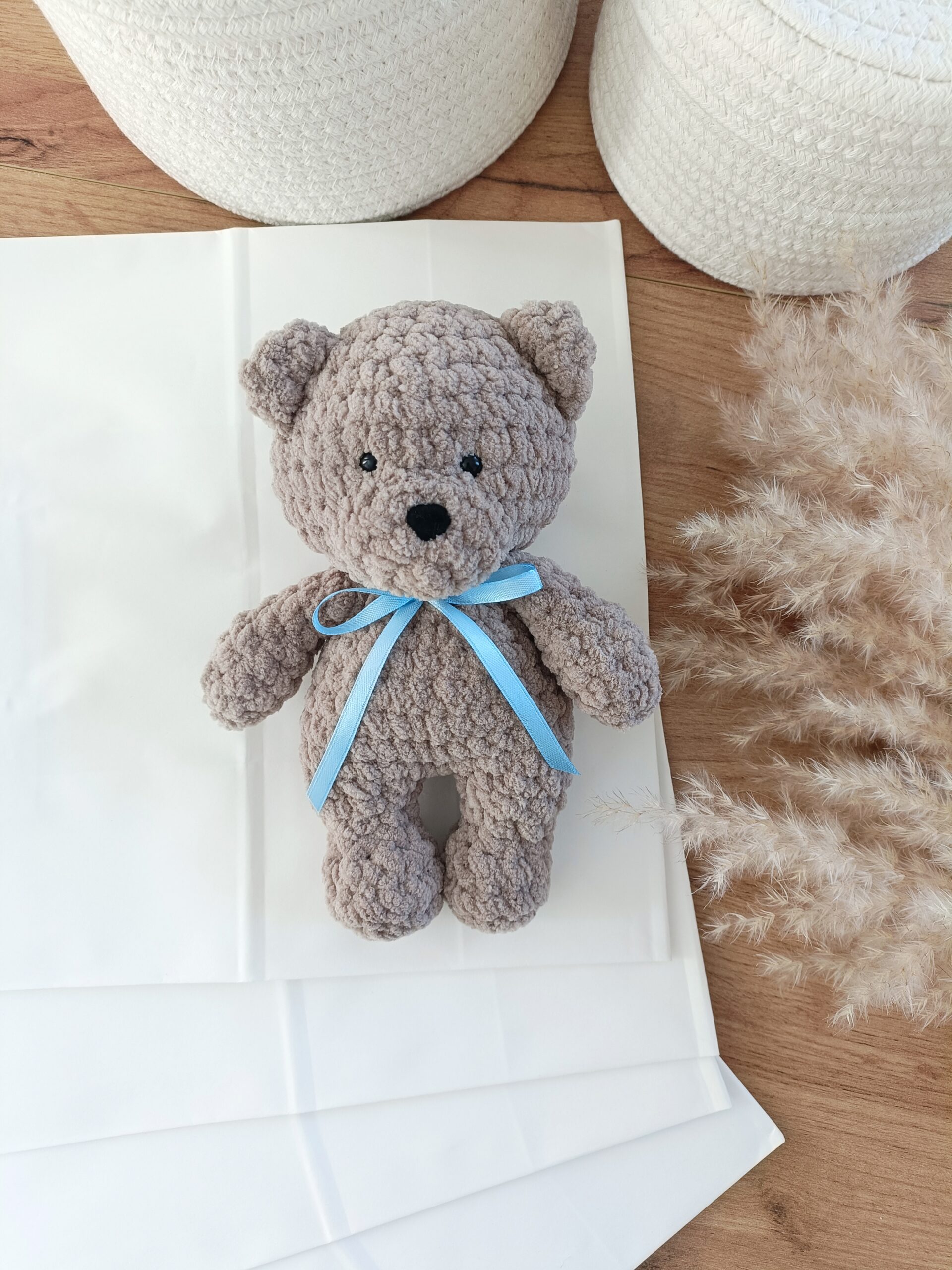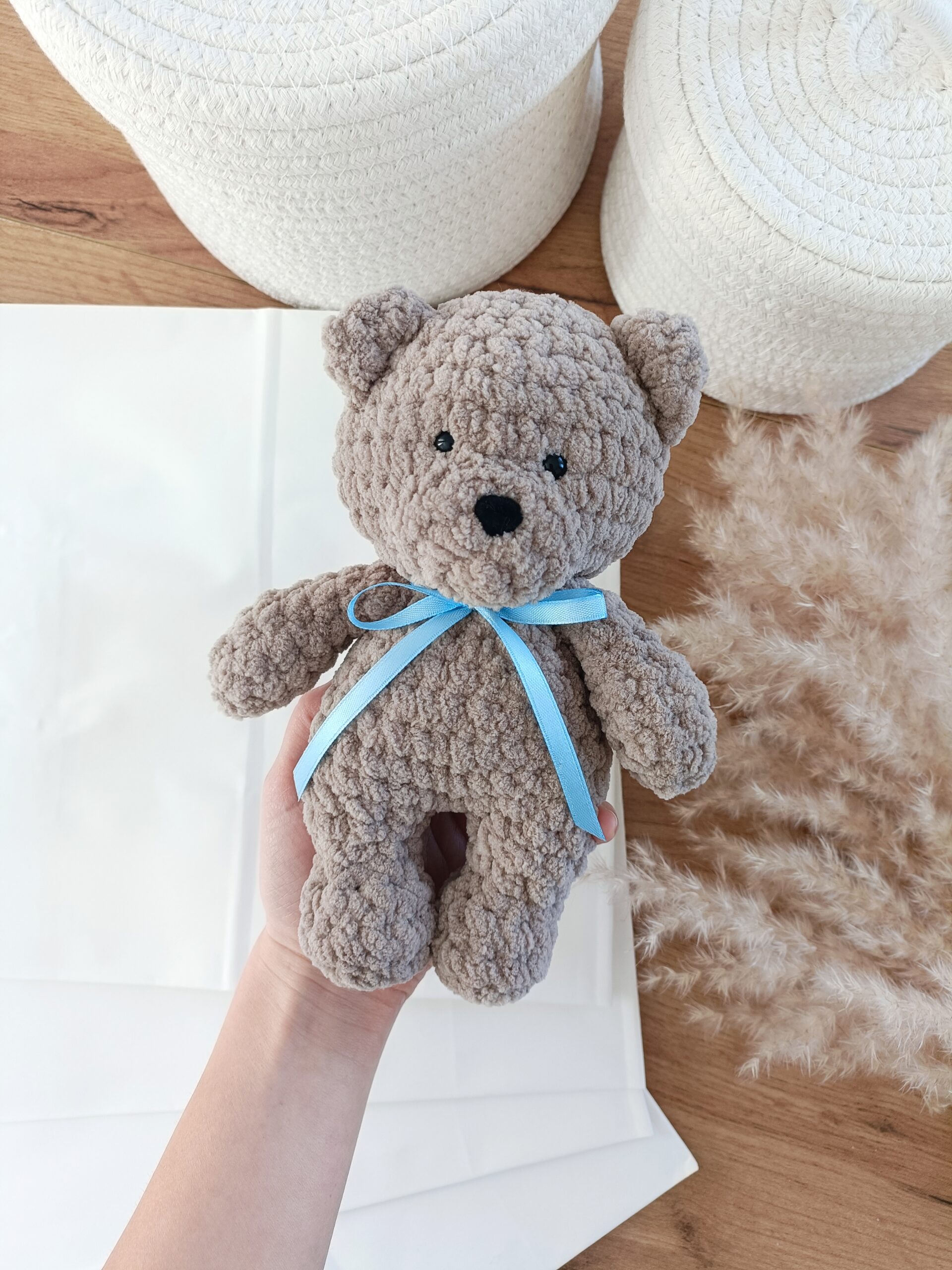 Ten uroczy miś wykonany na szydełku to wyjątkowa maskotka stworzona ręcznie z dbałością o każdy detal. Została wykonana z miękkiej pluszowej włóczki, która posiada certyfikat OEKO-TEX Standard 100, potwierdzający jakość materiału.