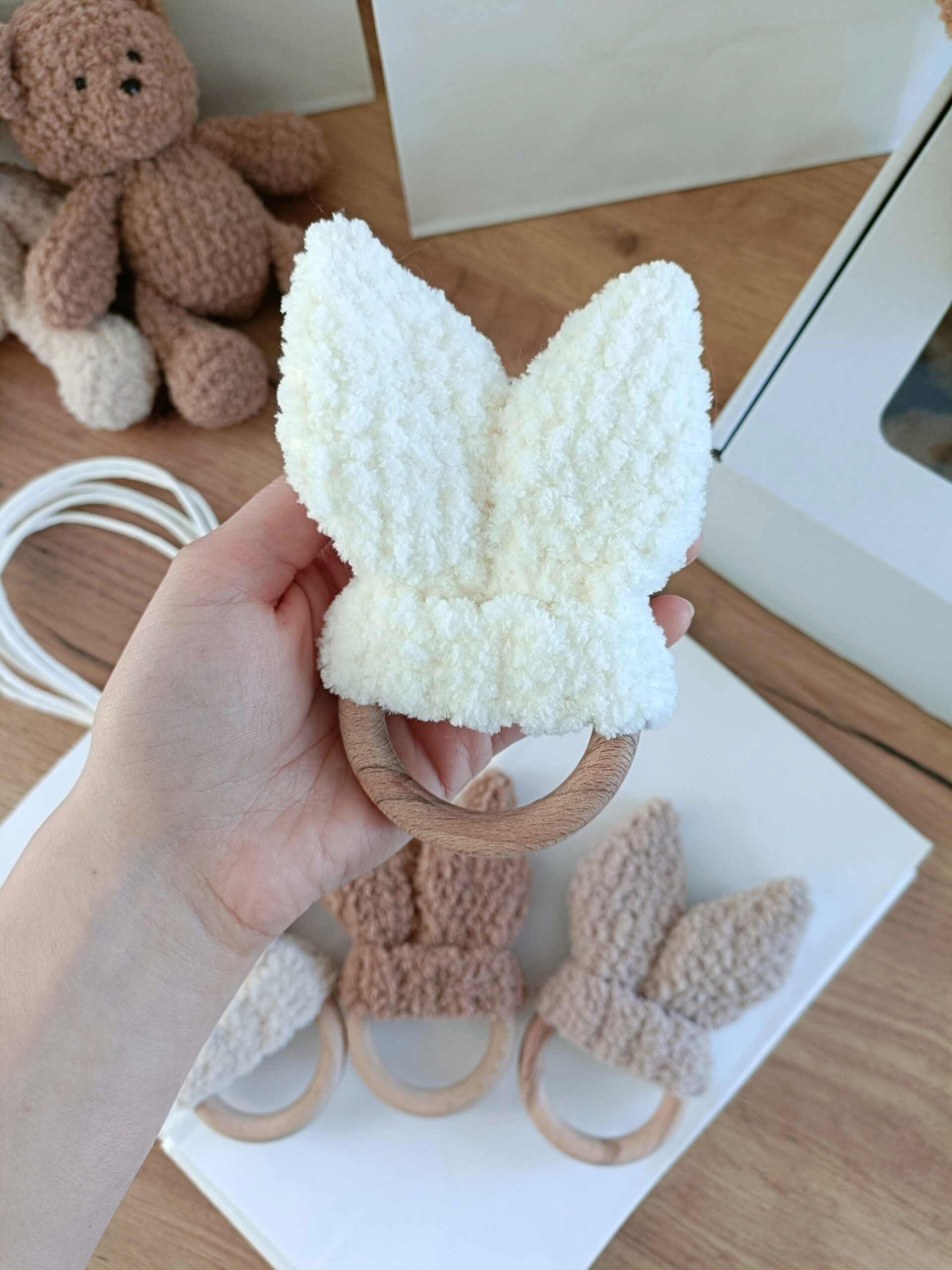 Delikatnie szeleszczące uszy królika na drewnianym kółku wykonane na szydełku z wyjątkowo milutkiej, certyfikowanej włóczki. Wygodne do chwytania przez małe rączki. Kolor ecru nr 62.