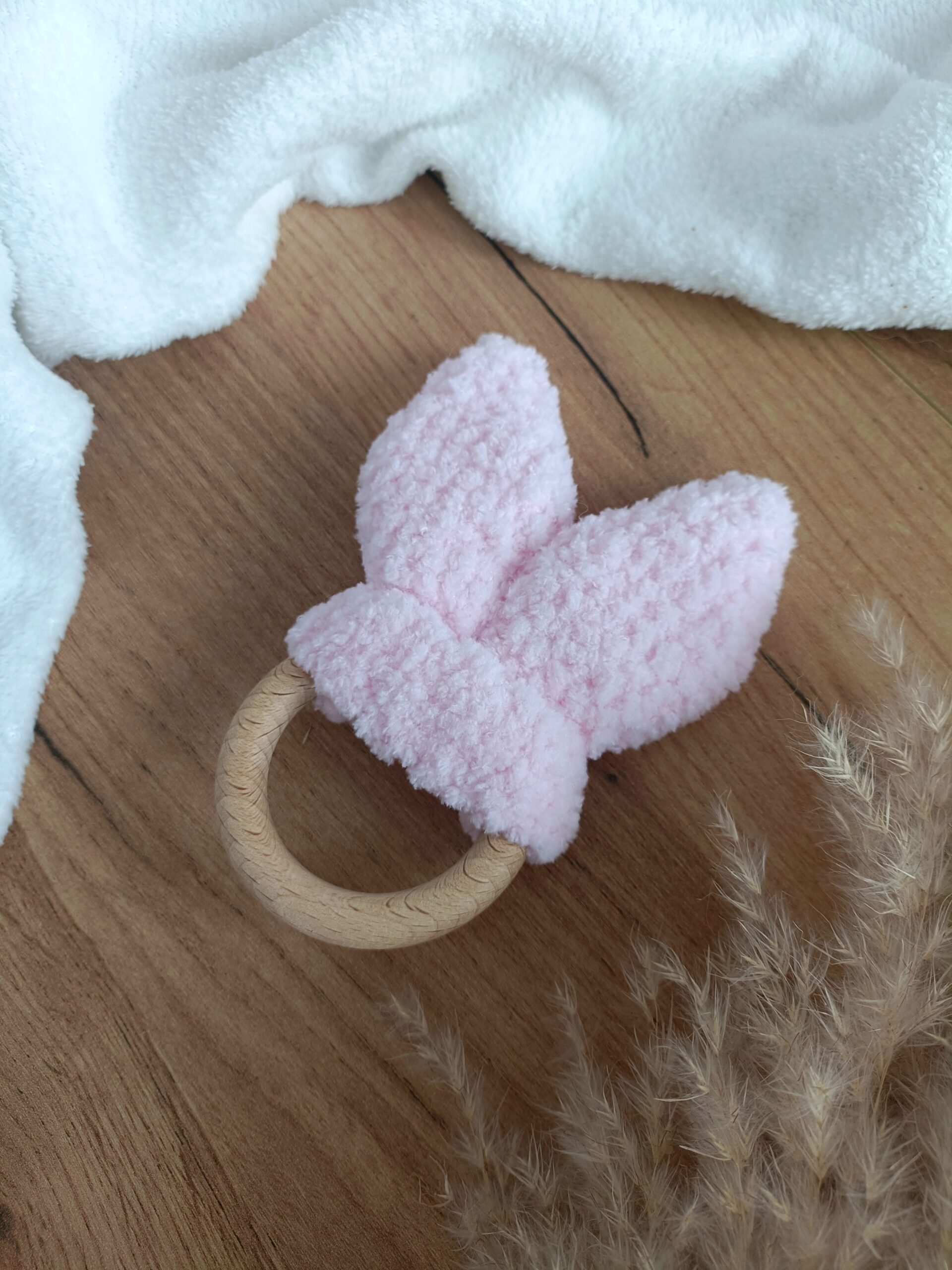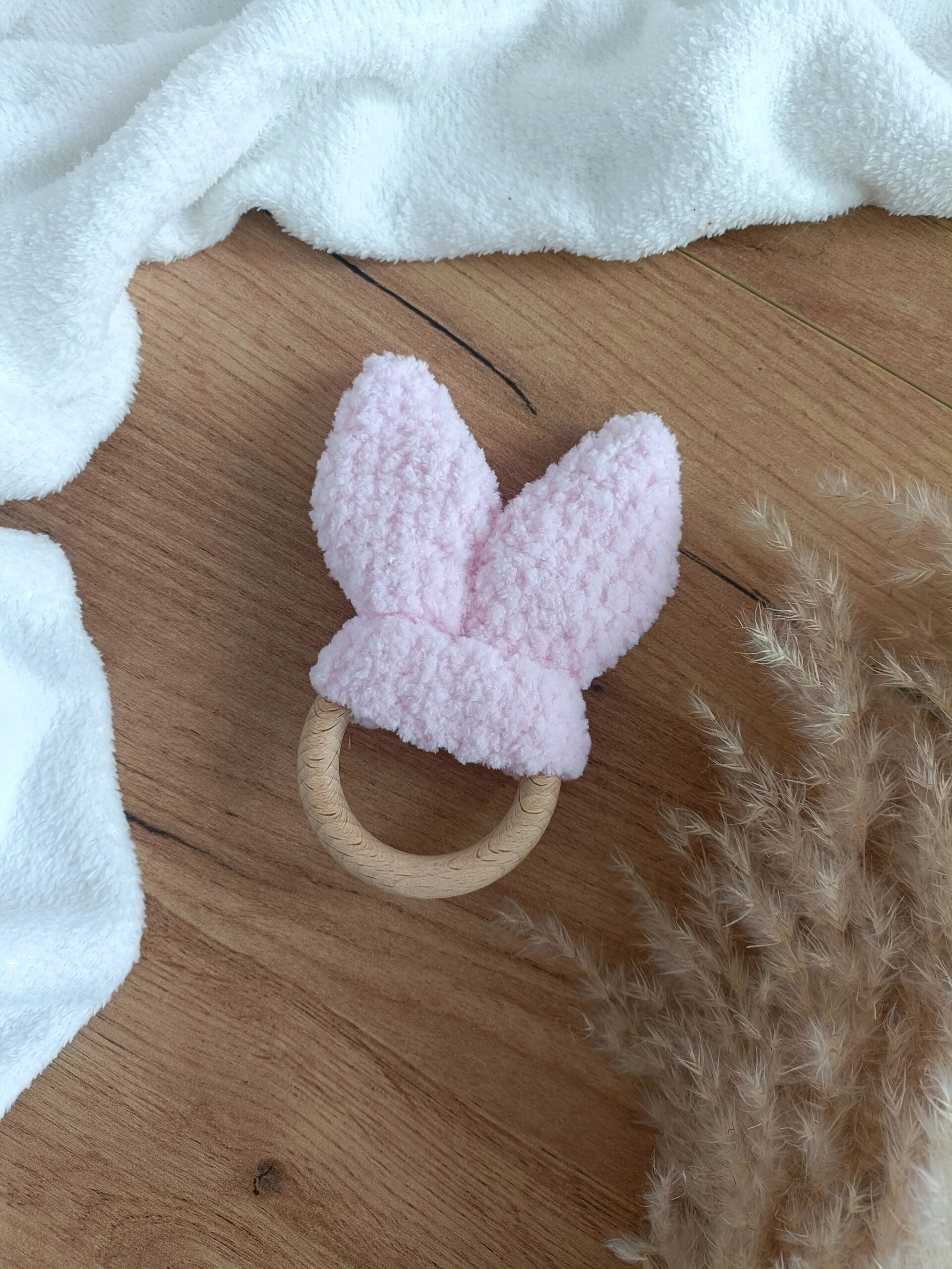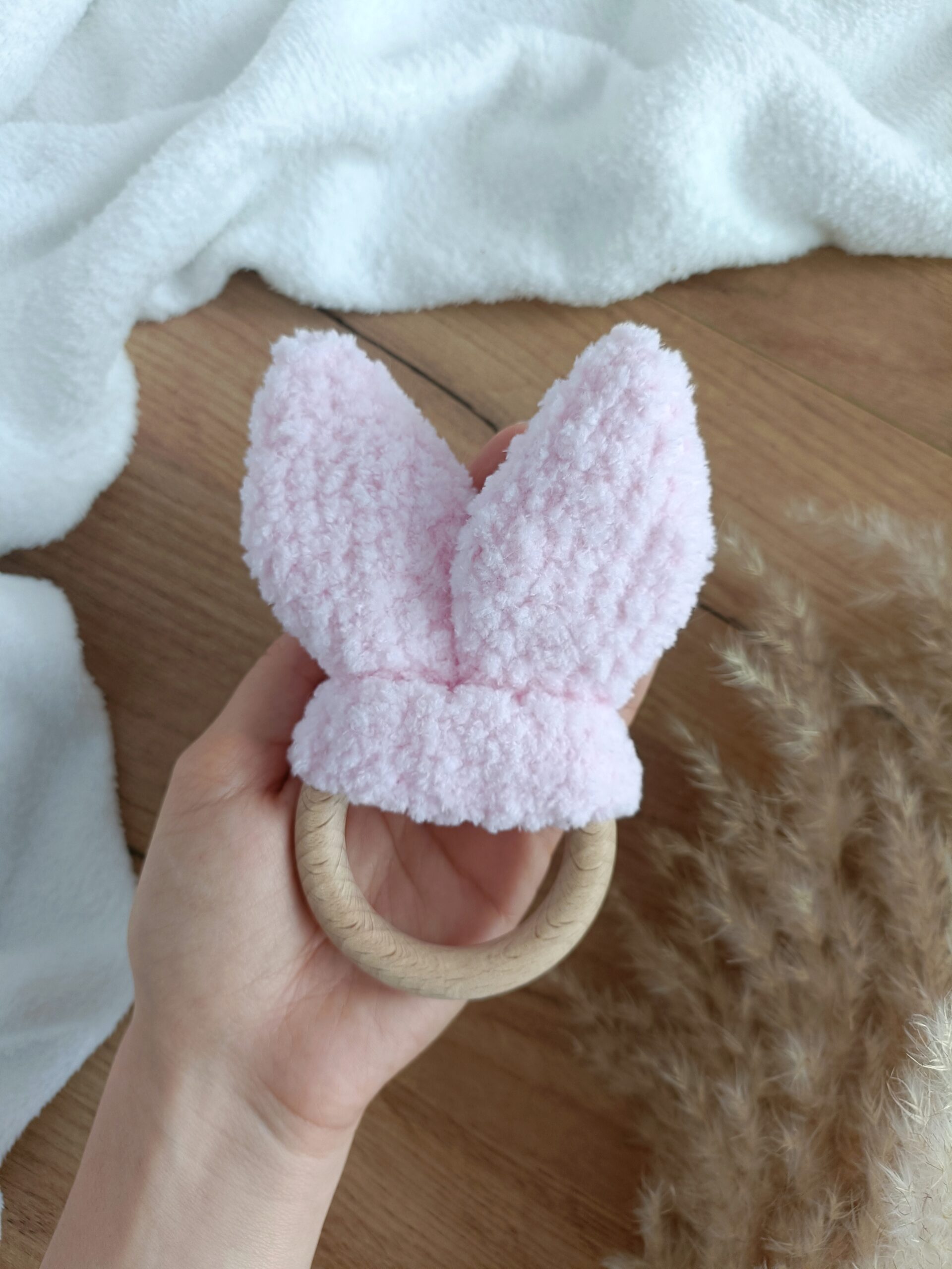 Delikatnie szeleszczące uszy królika na drewnianym kółku wykonane na szydełku z wyjątkowo milutkiej, certyfikowanej włóczki. Wygodne do chwytania przez małe rączki. Kolor jasny róż nr 31.