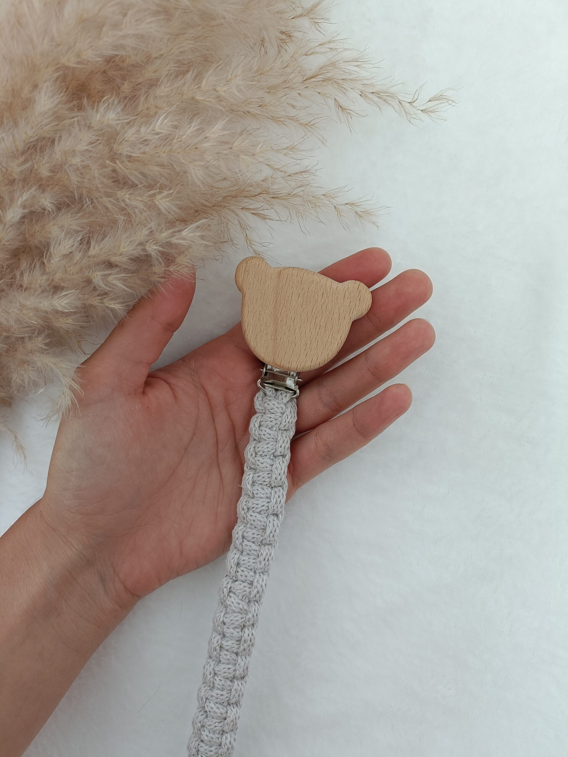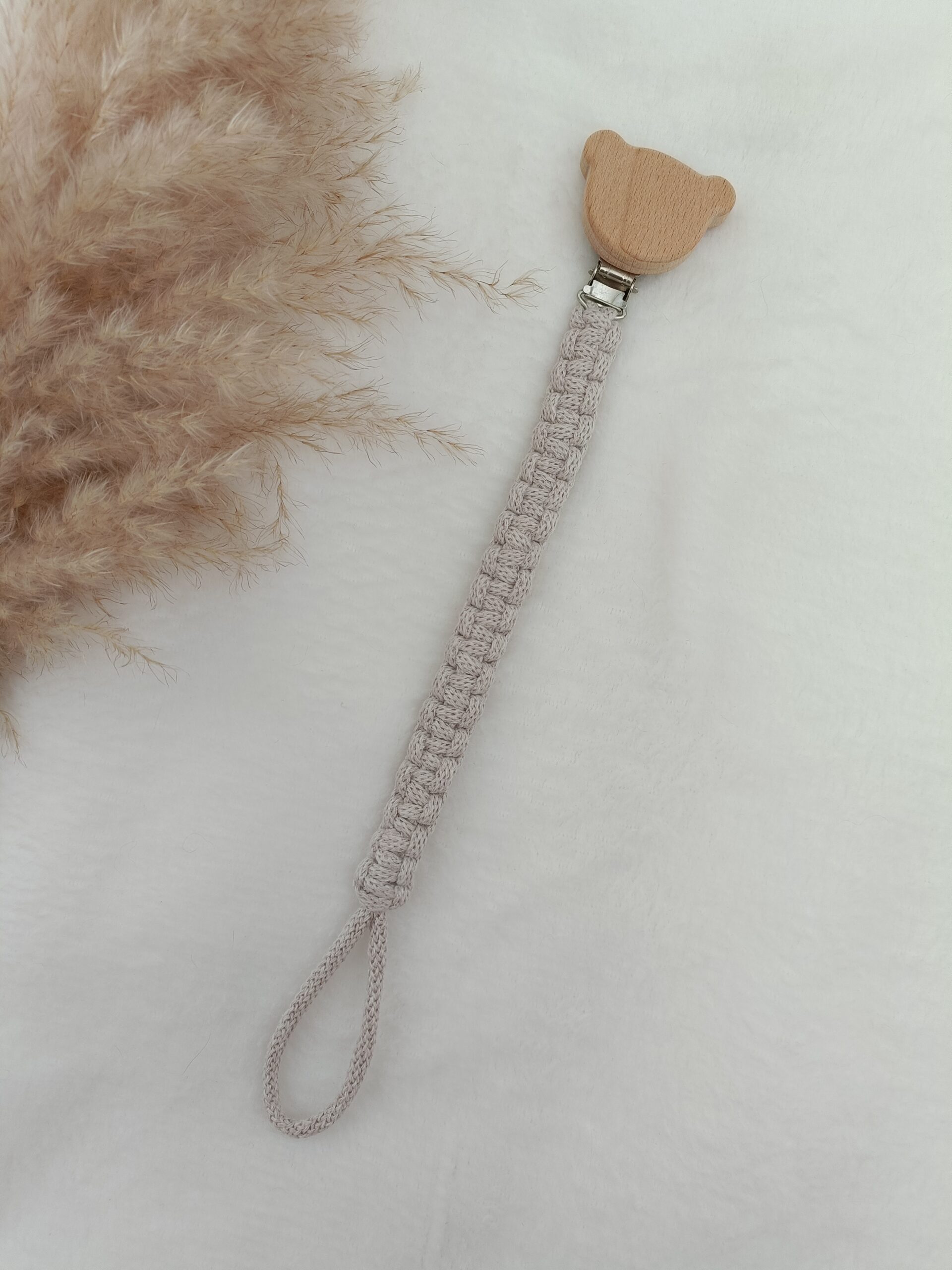 Zawieszka do smoczka wykonana ze sznurka bawełnianego, metodą makramy. Drewniany klips w kształcie misia umożliwia łatwe i praktyczne przypięcie do ubranka dziecka zapobiegając zgubieniu smoczka. To bardzo wygodne rozwiązanie podczas spacerów, podróży czy codziennych chwil z maluszkiem.