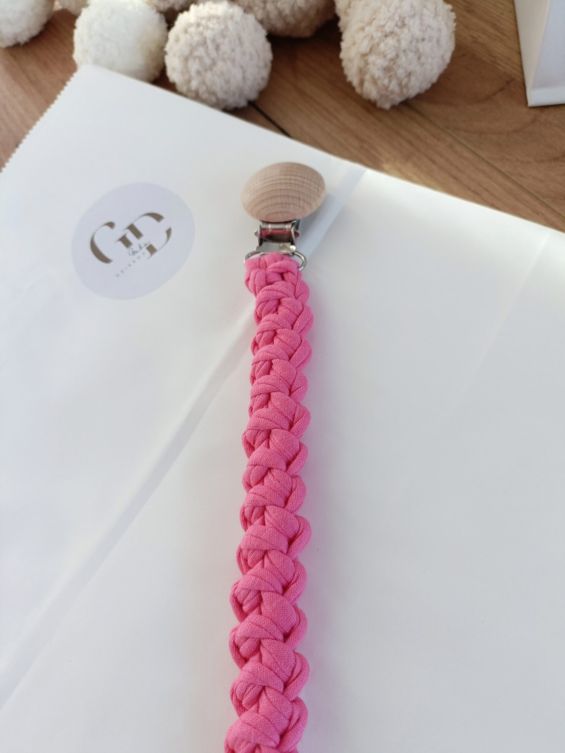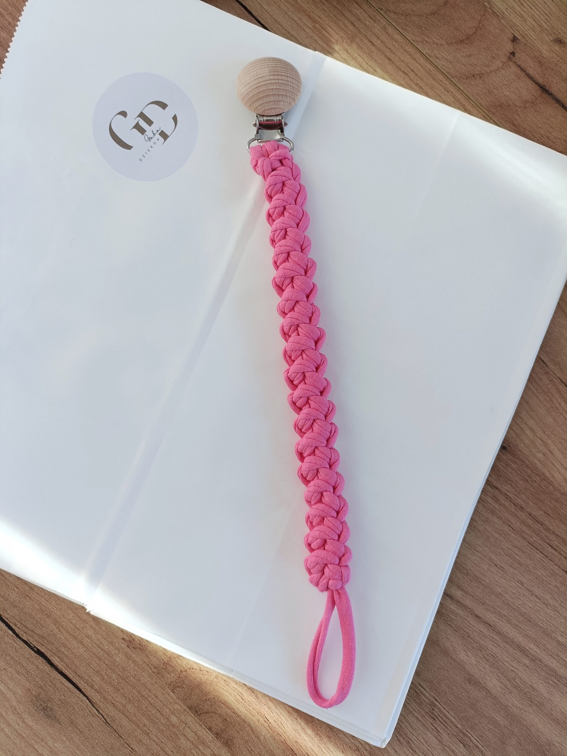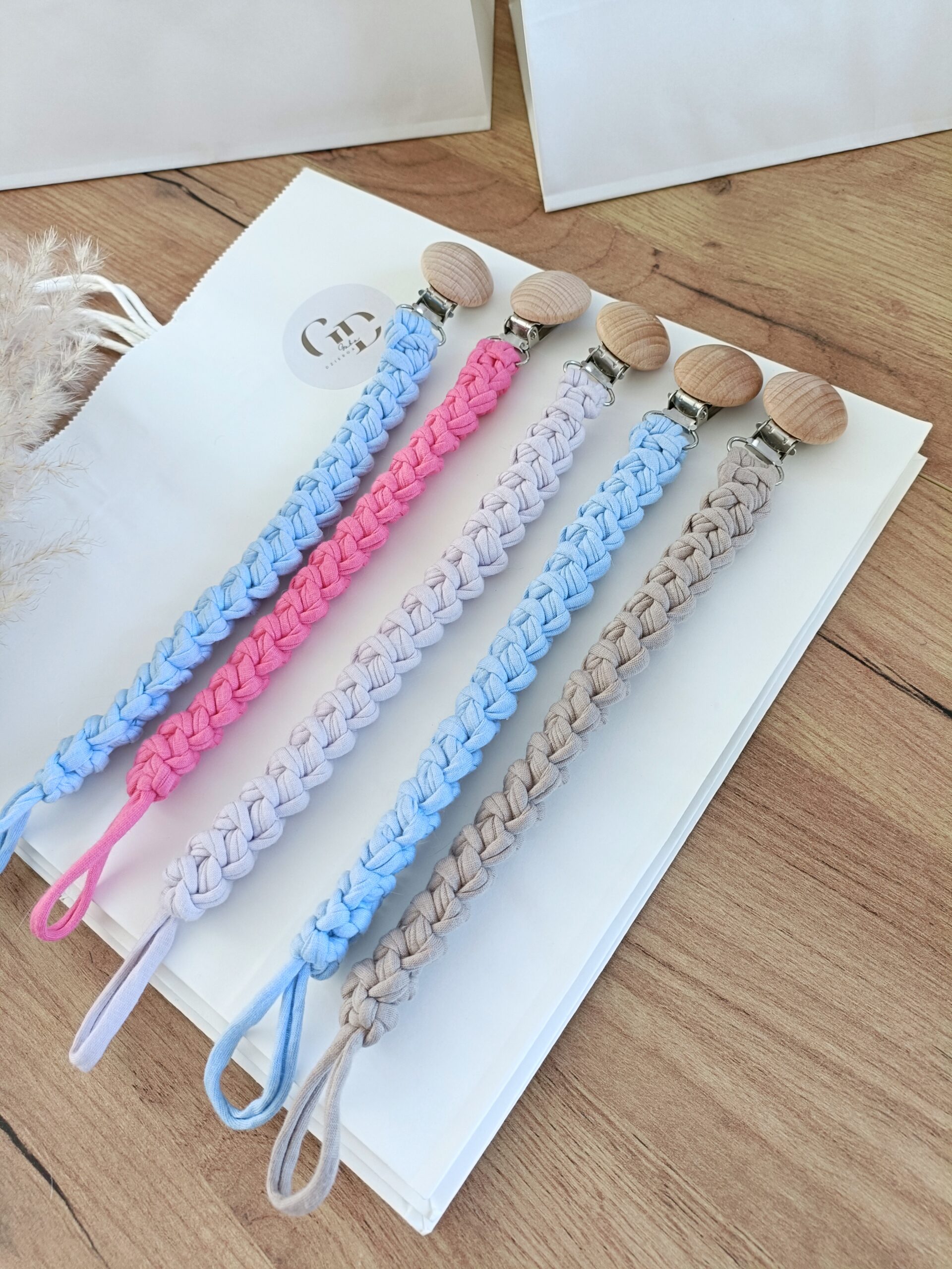 Zawieszka do smoczka wykonana na szydełku z taśmy bawełnianej. Drewniany klips umożliwia łatwe i praktyczne przypięcie do ubranka dziecka zapobiegając zgubieniu smoczka.  To bardzo wygodne rozwiązanie podczas spacerów, podróży czy codziennych chwil z maluszkiem.