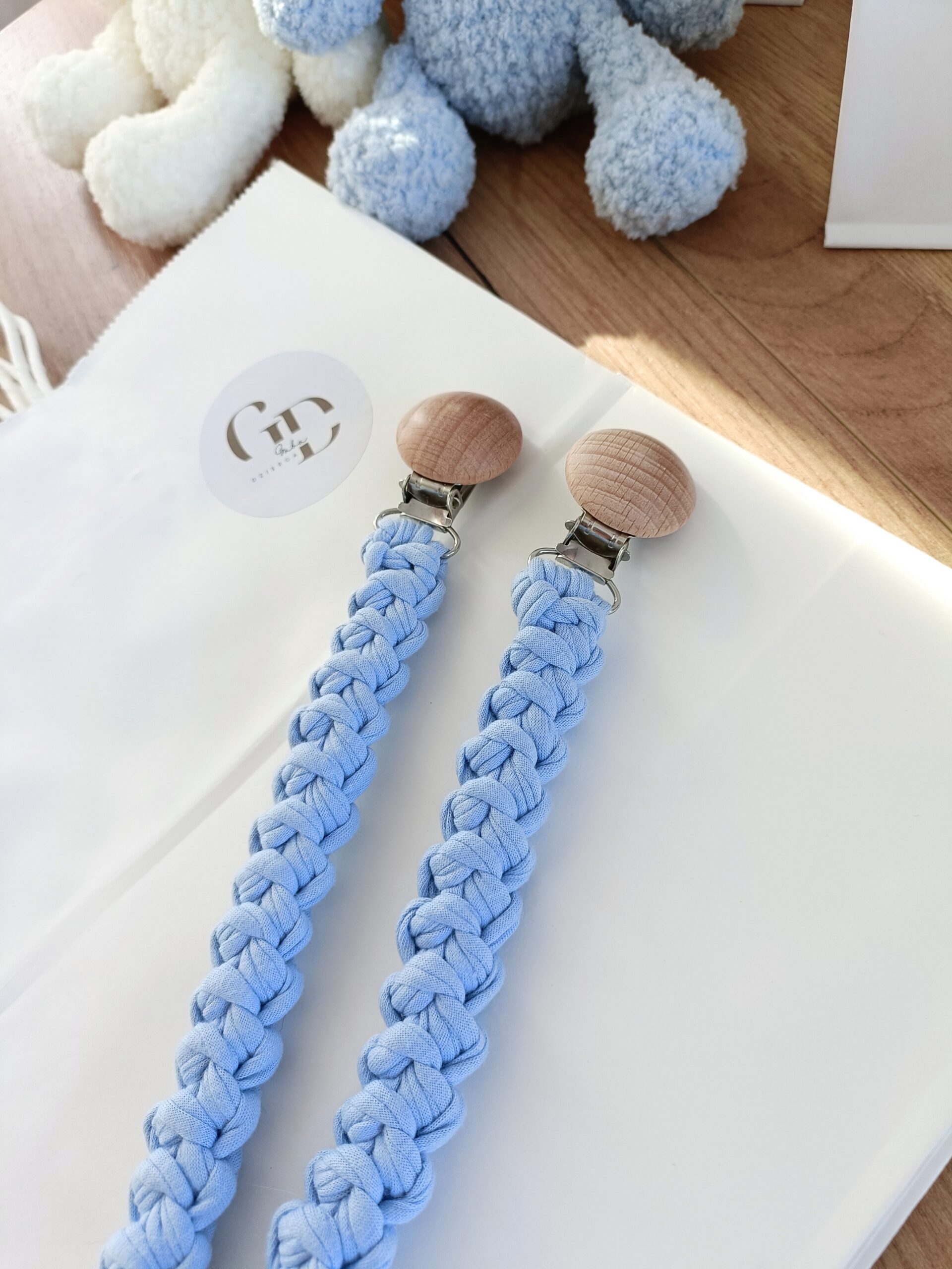 Zawieszka do smoczka wykonana na szydełku z taśmy bawełnianej. Drewniany klips umożliwia łatwe i praktyczne przypięcie do ubranka dziecka zapobiegając zgubieniu smoczka. To bardzo wygodne rozwiązanie podczas spacerów, podróży czy codziennych chwil z maluszkiem.