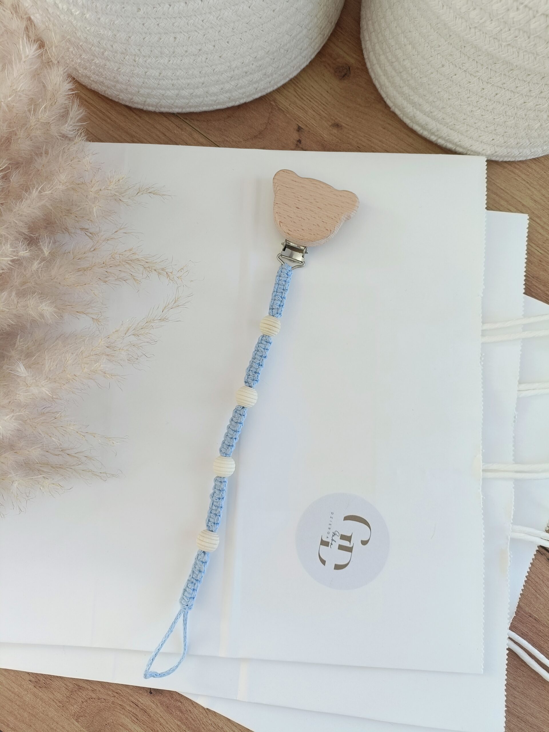 Zawieszka do smoczka z drewnianymi koralikami wykonana metodą makramy. Drewniany klips w kształcie misia umożliwia łatwe i praktyczne przypięcie do ubranka dziecka zapobiegając zgubieniu smoczka. To bardzo wygodne rozwiązanie podczas spacerów, podróży czy codziennych chwil z maluszkiem.