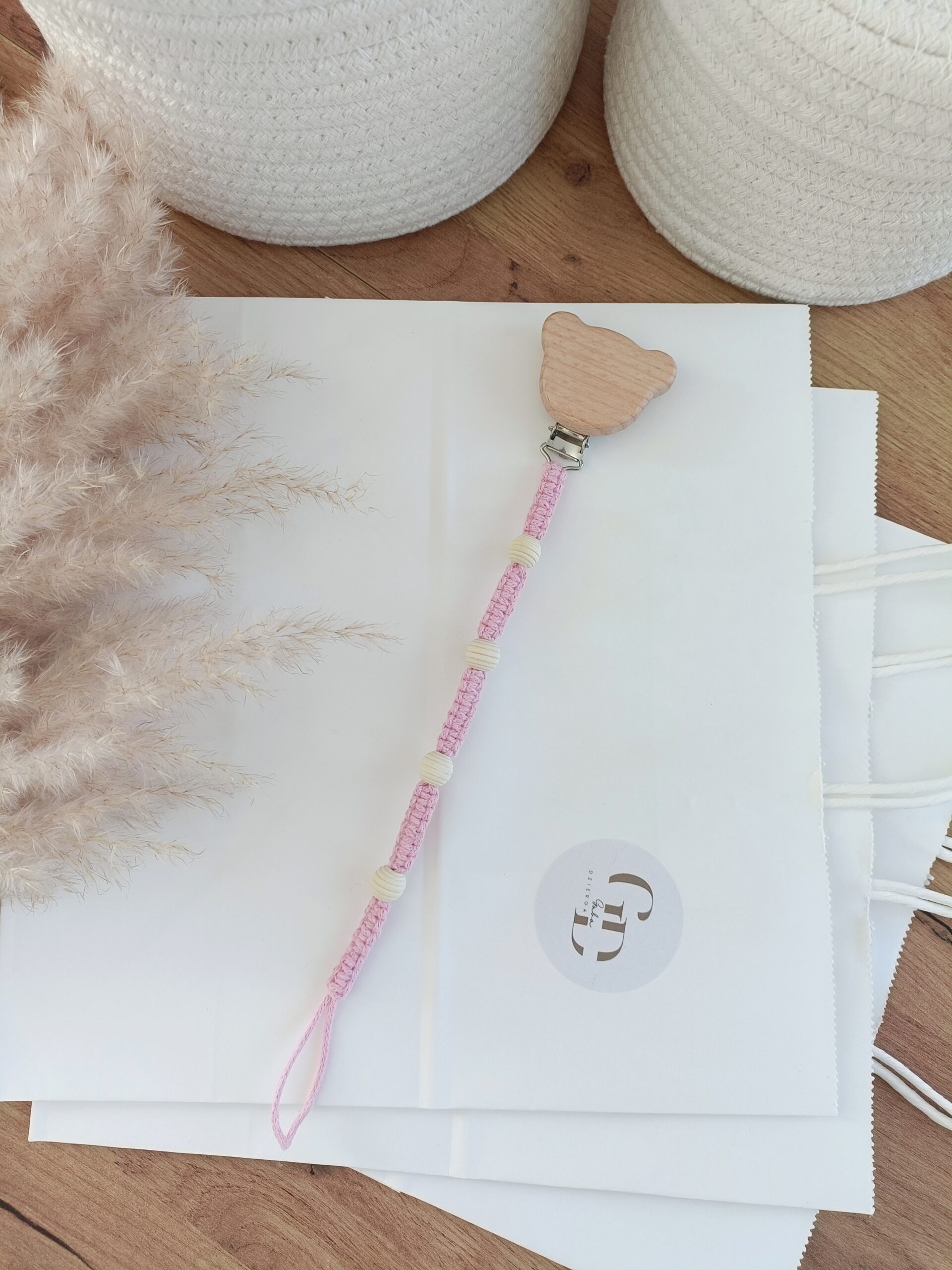 Zawieszka do smoczka z drewnianymi koralikami wykonana metodą makramy. Drewniany klips w kształcie misia umożliwia łatwe i praktyczne przypięcie do ubranka dziecka zapobiegając zgubieniu smoczka. To bardzo wygodne rozwiązanie podczas spacerów, podróży czy codziennych chwil z maluszkiem.