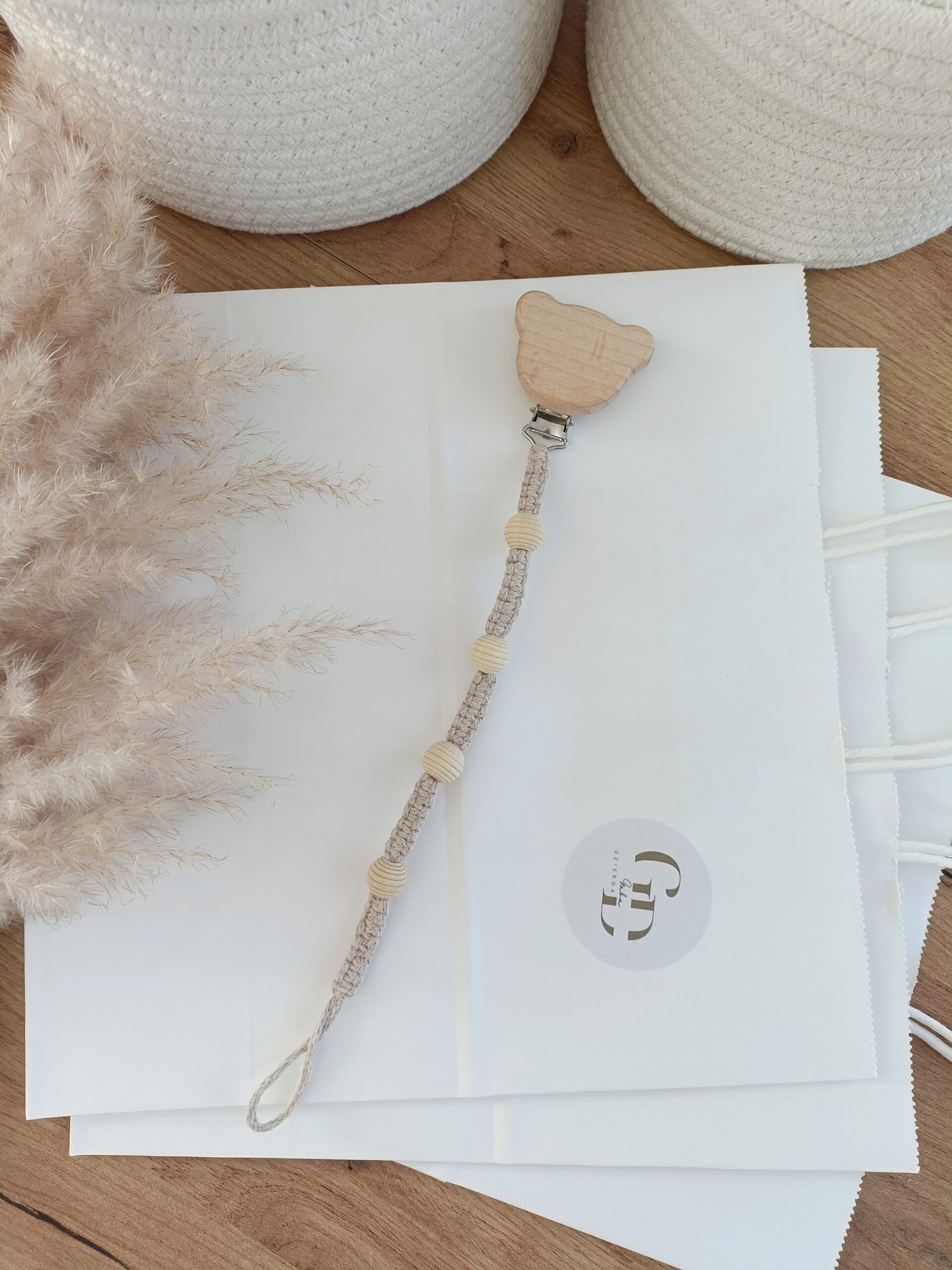 Zawieszka do smoczka z drewnianymi koralikami wykonana metodą makramy. Drewniany klips w kształcie misia umożliwia łatwe i praktyczne przypięcie do ubranka dziecka zapobiegając zgubieniu smoczka. To bardzo wygodne rozwiązanie podczas spacerów, podróży czy codziennych chwil z maluszkiem.