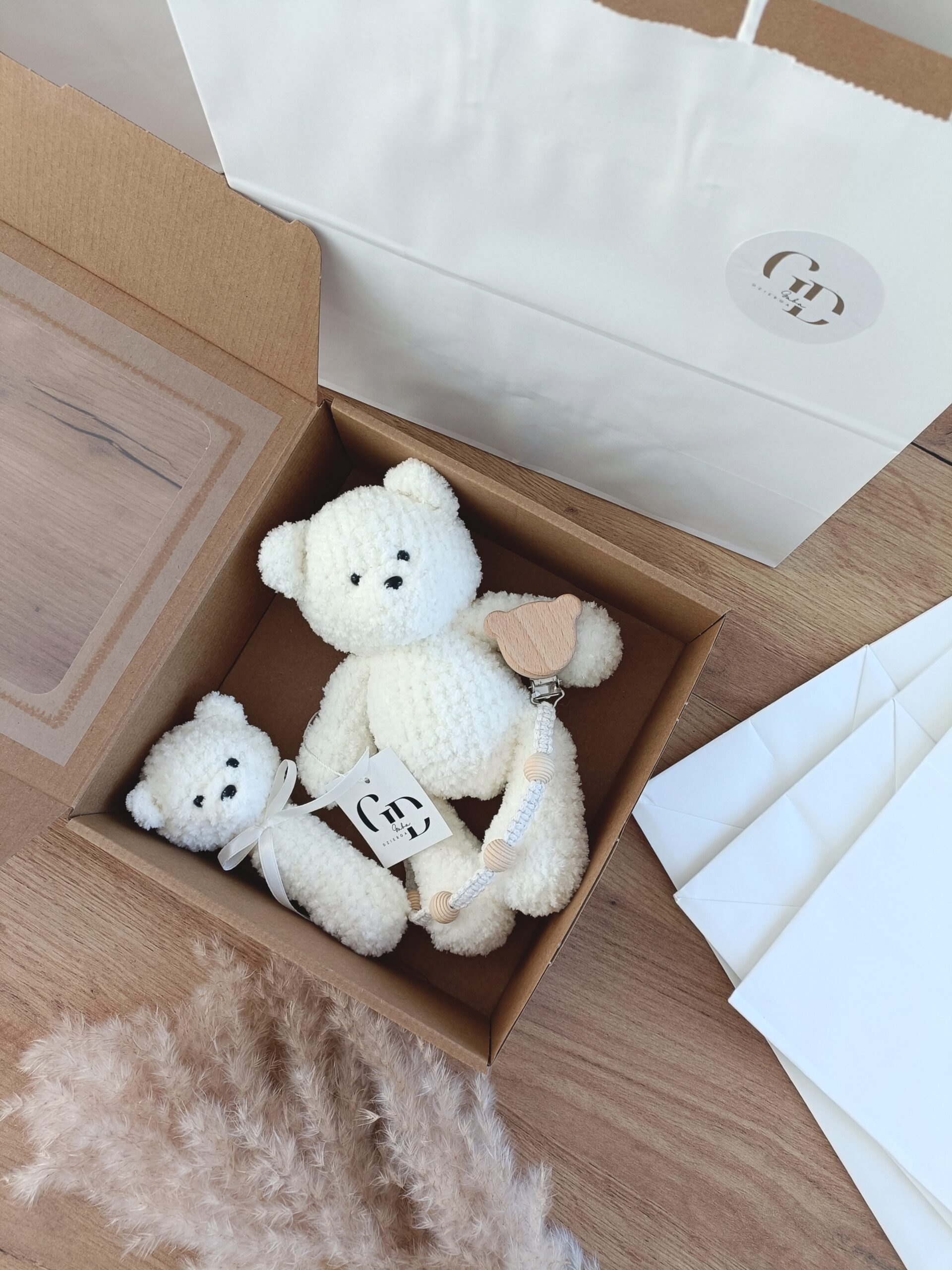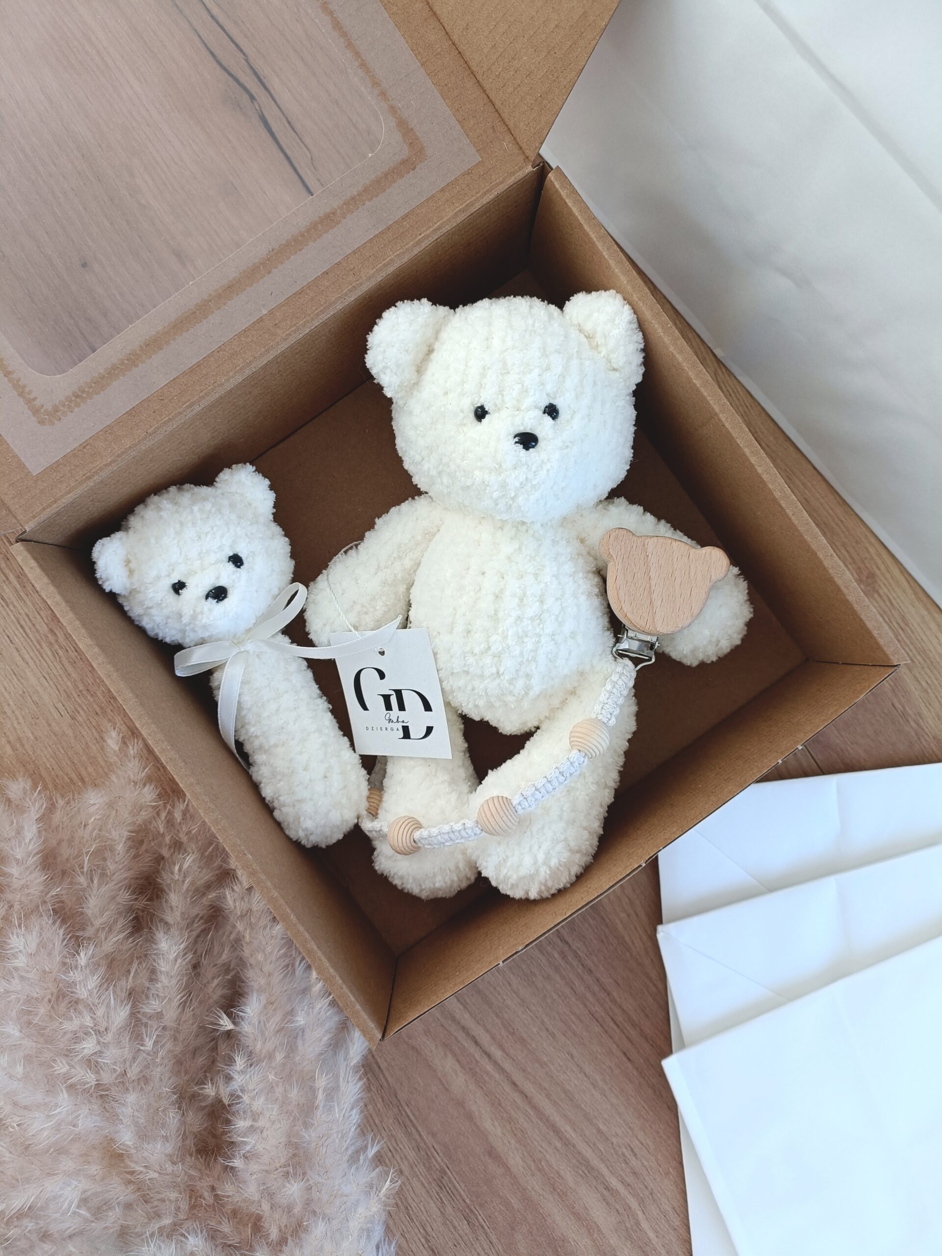 W eleganckim białym pudełku z okienkiem znajduje się miś mierzący ok. 22 cm, urocza grzechotka i zawieszka do smoczka.