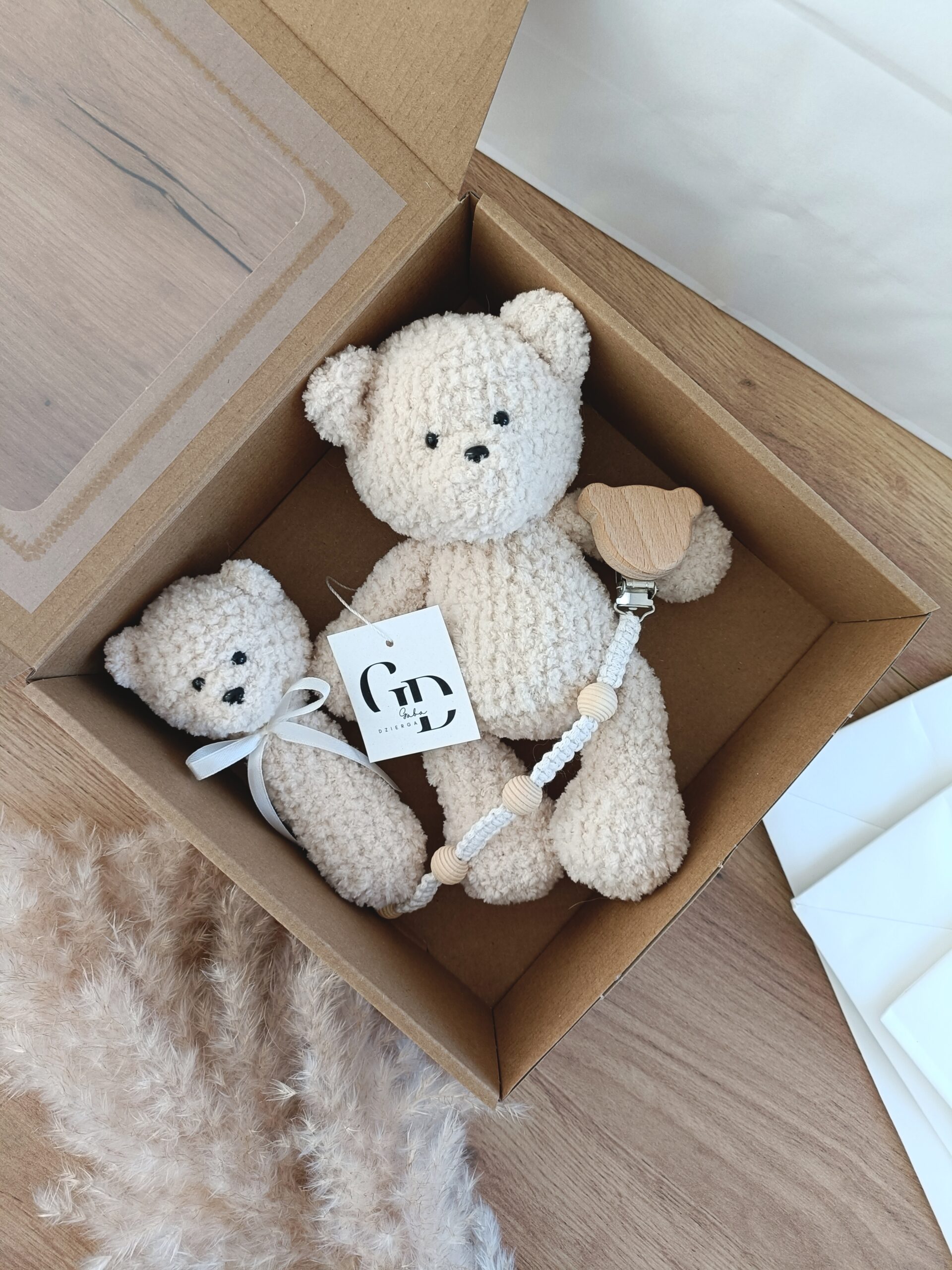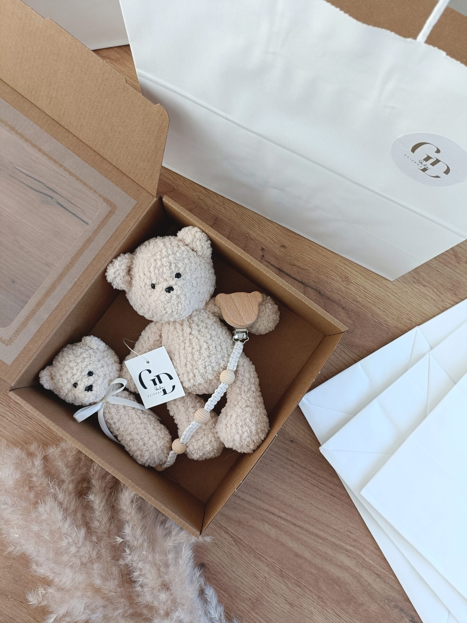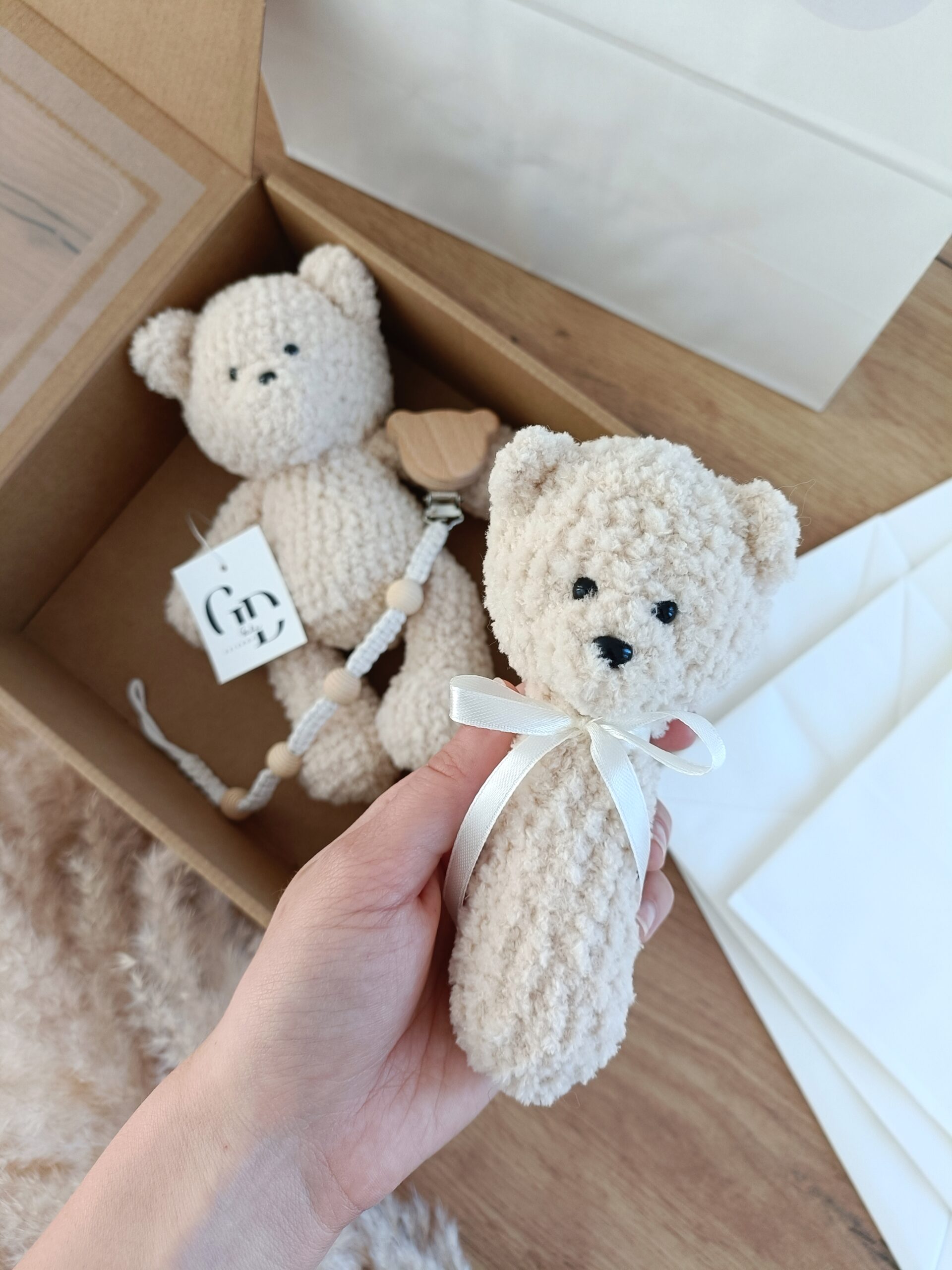 W eleganckim białym pudełku z okienkiem znajduje się miś mierzący ok. 22 cm, urocza grzechotka i zawieszka do smoczka.