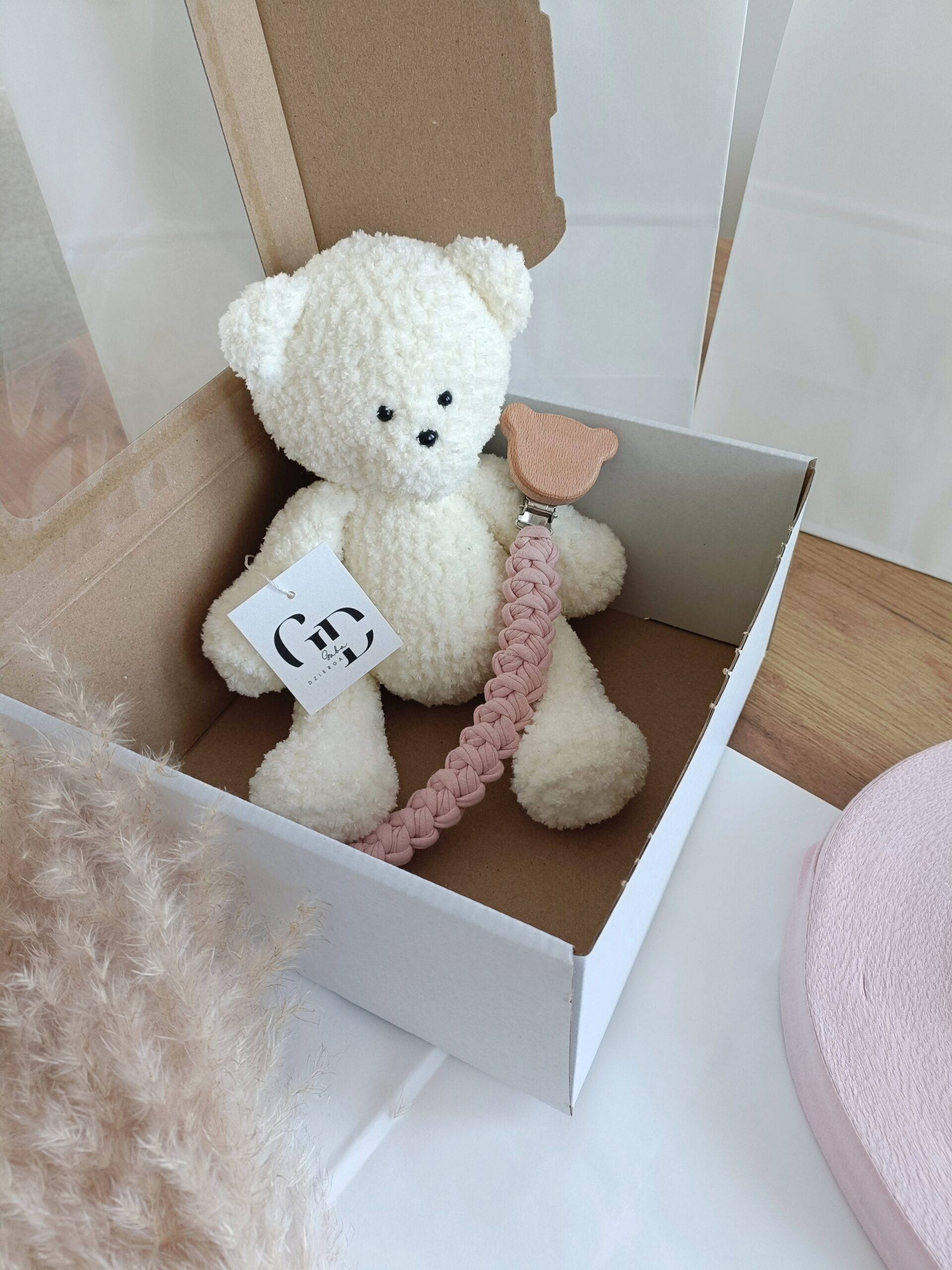 W eleganckim białym pudełku z okienkiem znajduje się miś o wysokości ok. 24 cm i zawieszka do smoczka z drewnianym klipsem w kształcie misia.