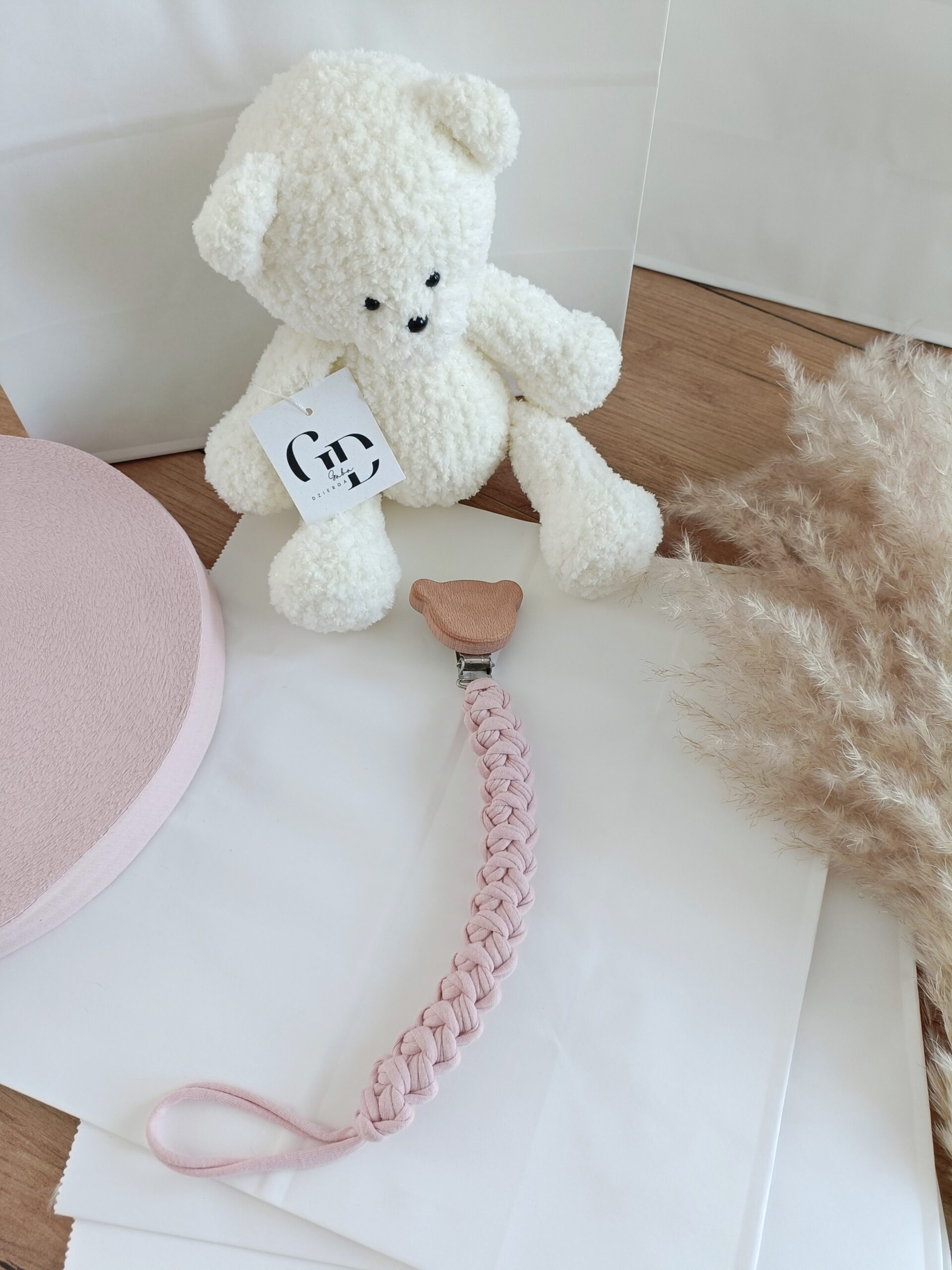 Zawieszka do smoczka z drewnianym klipsem w kształcie misia została wykonana z taśmy bawełnianej.
