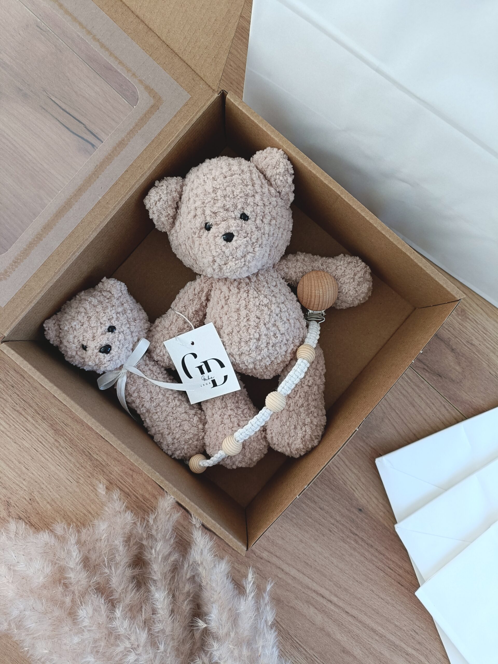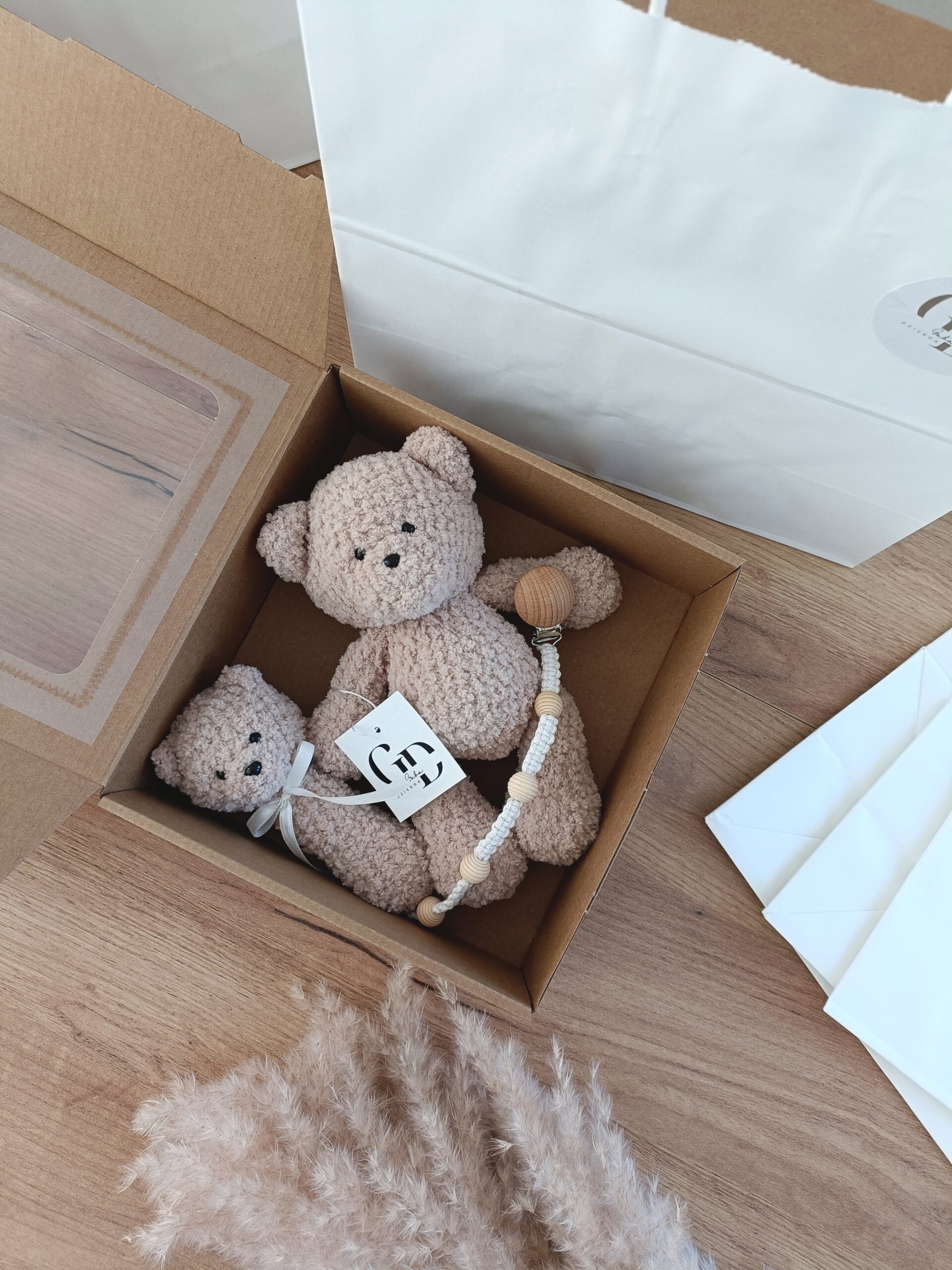 W eleganckim białym pudełku z okienkiem znajduje się miś mierzący ok. 22 cm, urocza grzechotka i zawieszka do smoczka.