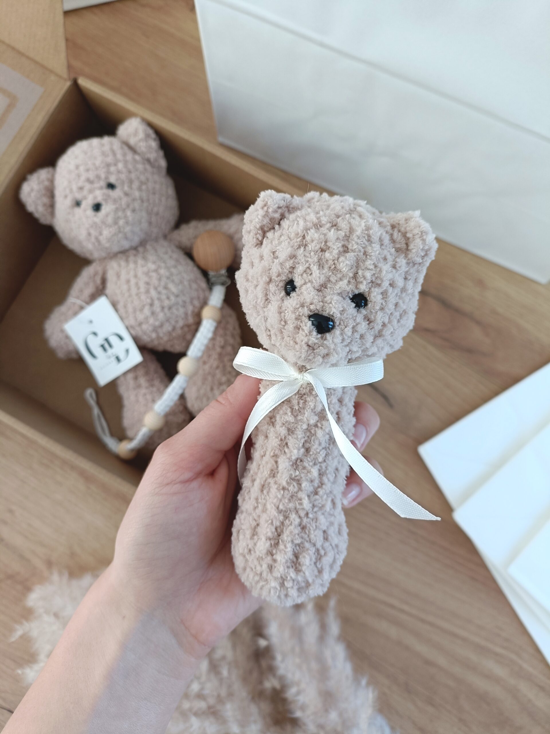 Miś i grzechotka wykonane na szydełku z wyjątkowo milutkiej włóczki posiadającej certyfikat jakości OEKO-TEX Standard 100, wypełnione specjalnym wypełnieniem do maskotek. Kolor beżowy nr 115.