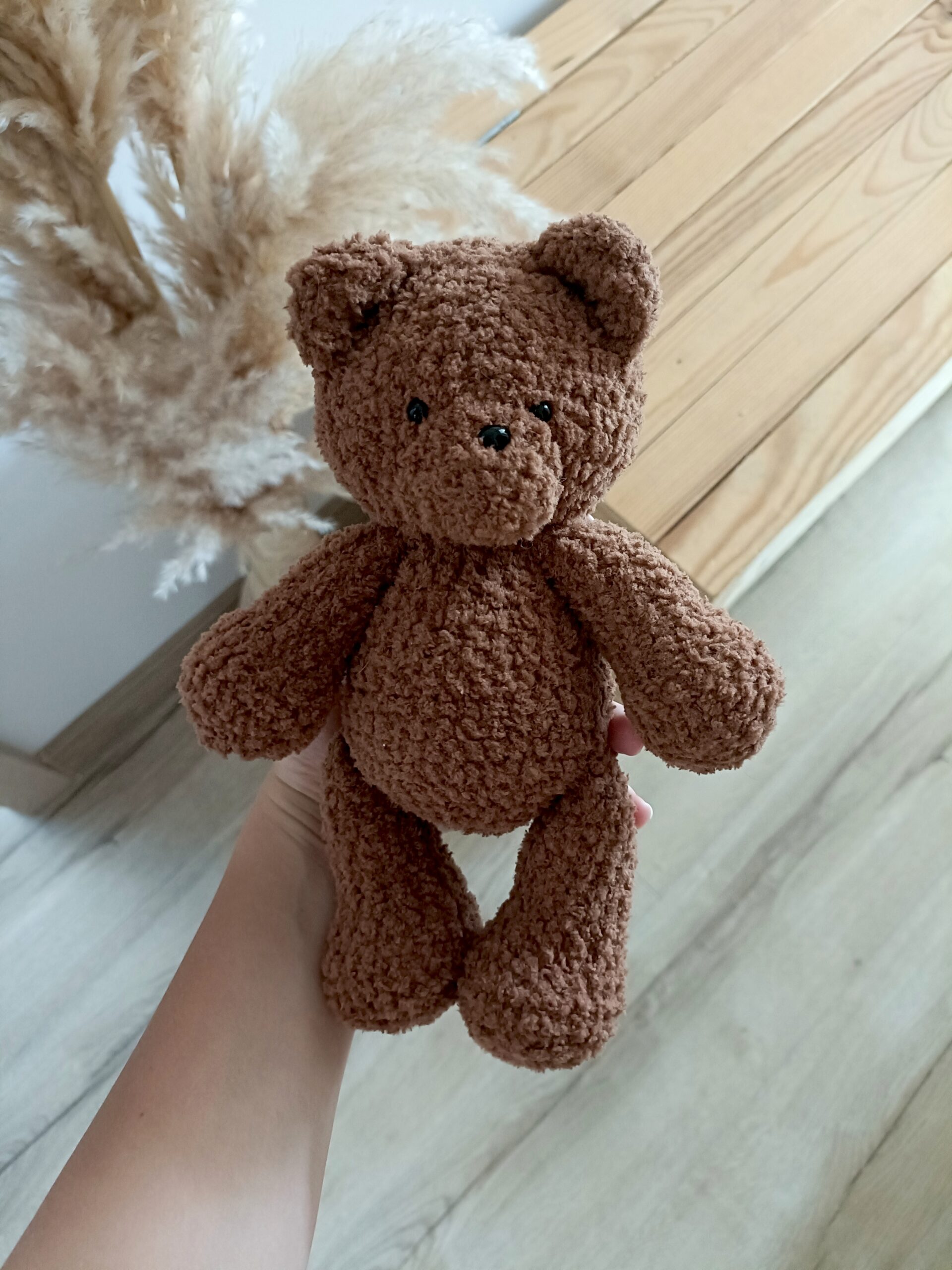 Miś i grzechotka wykonane na szydełku z wyjątkowo milutkiej włóczki posiadającej certyfikat jakości OEKO-TEX Standard 100, wypełnione specjalnym wypełnieniem do maskotek. Kolor ciemny brąz nr 321.