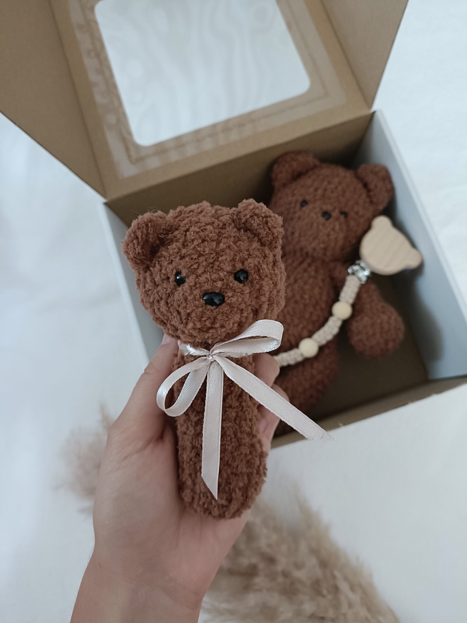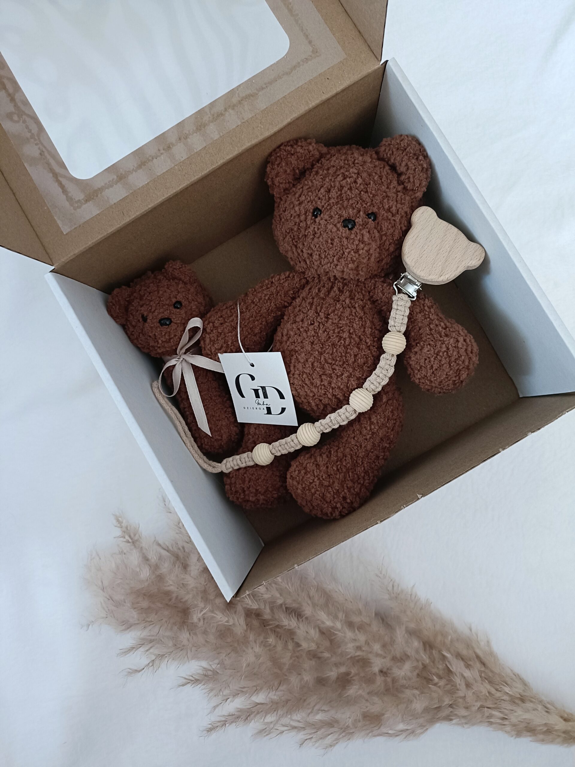 W eleganckim białym pudełku z okienkiem znajduje się miś mierzący ok. 24 cm, urocza grzechotka i zawieszka do smoczka.
