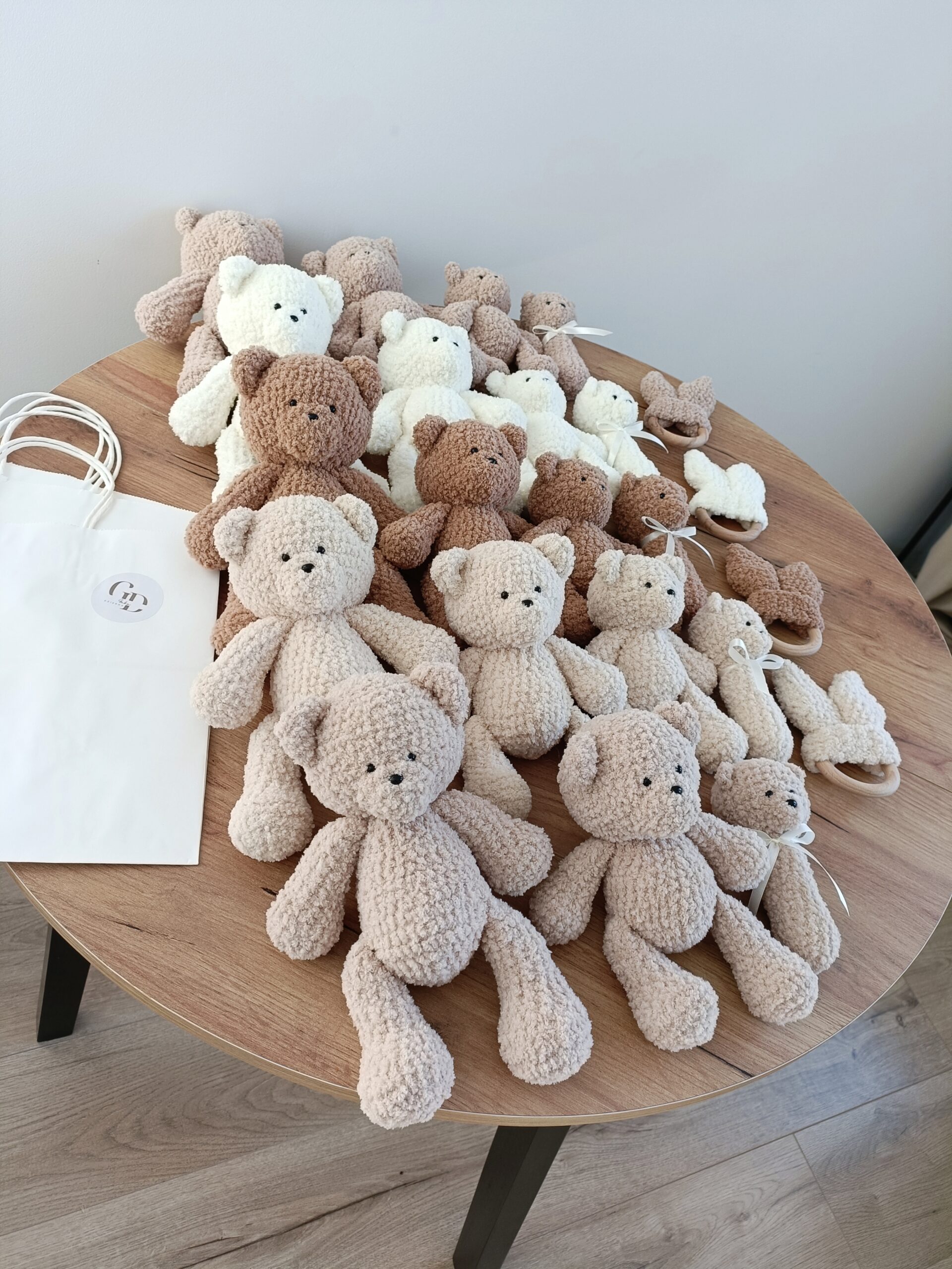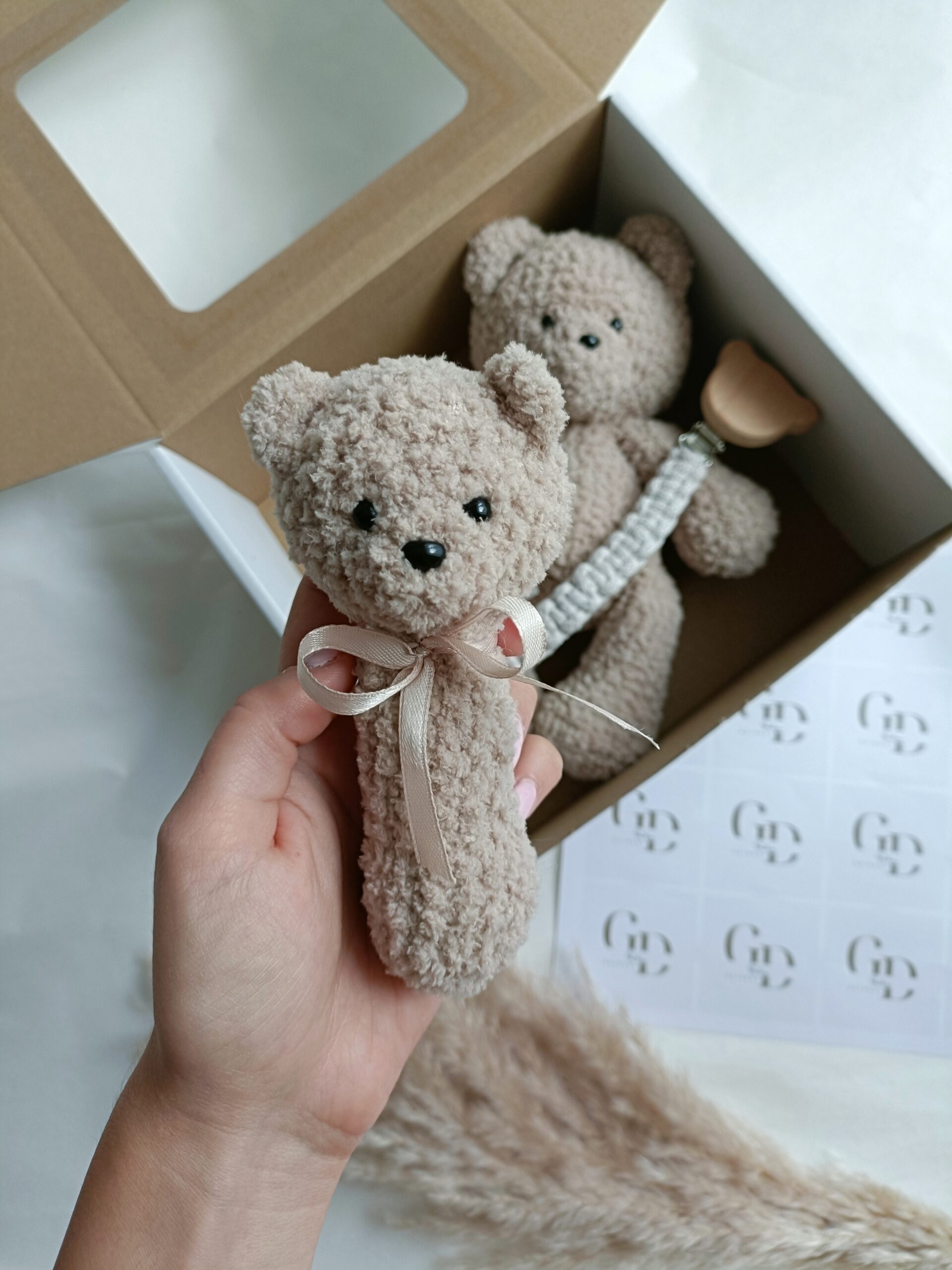 Miś i grzechotka wykonane na szydełku z wyjątkowo milutkiej włóczki posiadającej certyfikat jakości OEKO-TEX Standard 100, wypełnione specjalnym wypełnieniem do maskotek. Kolor beżowy nr 115.