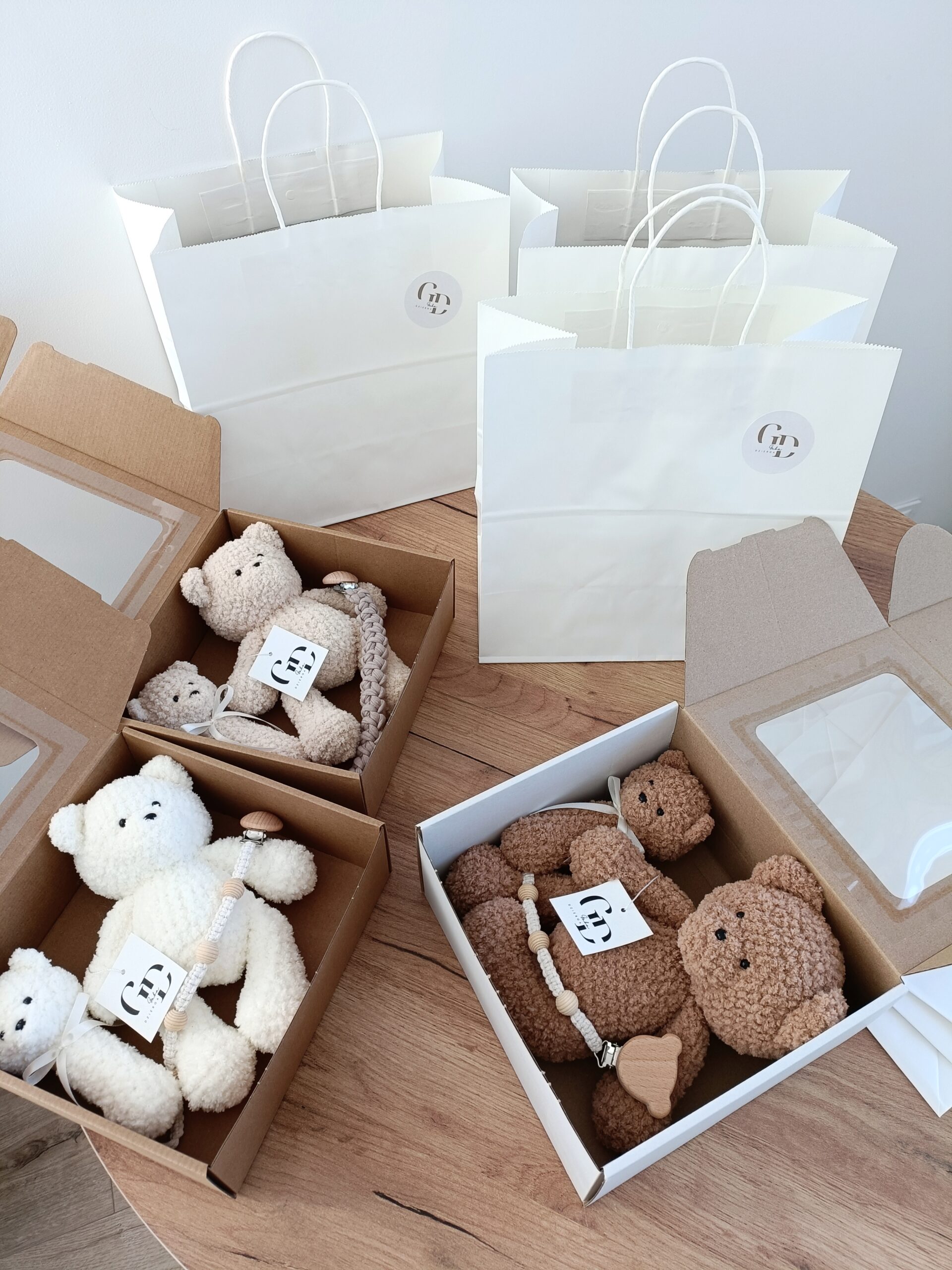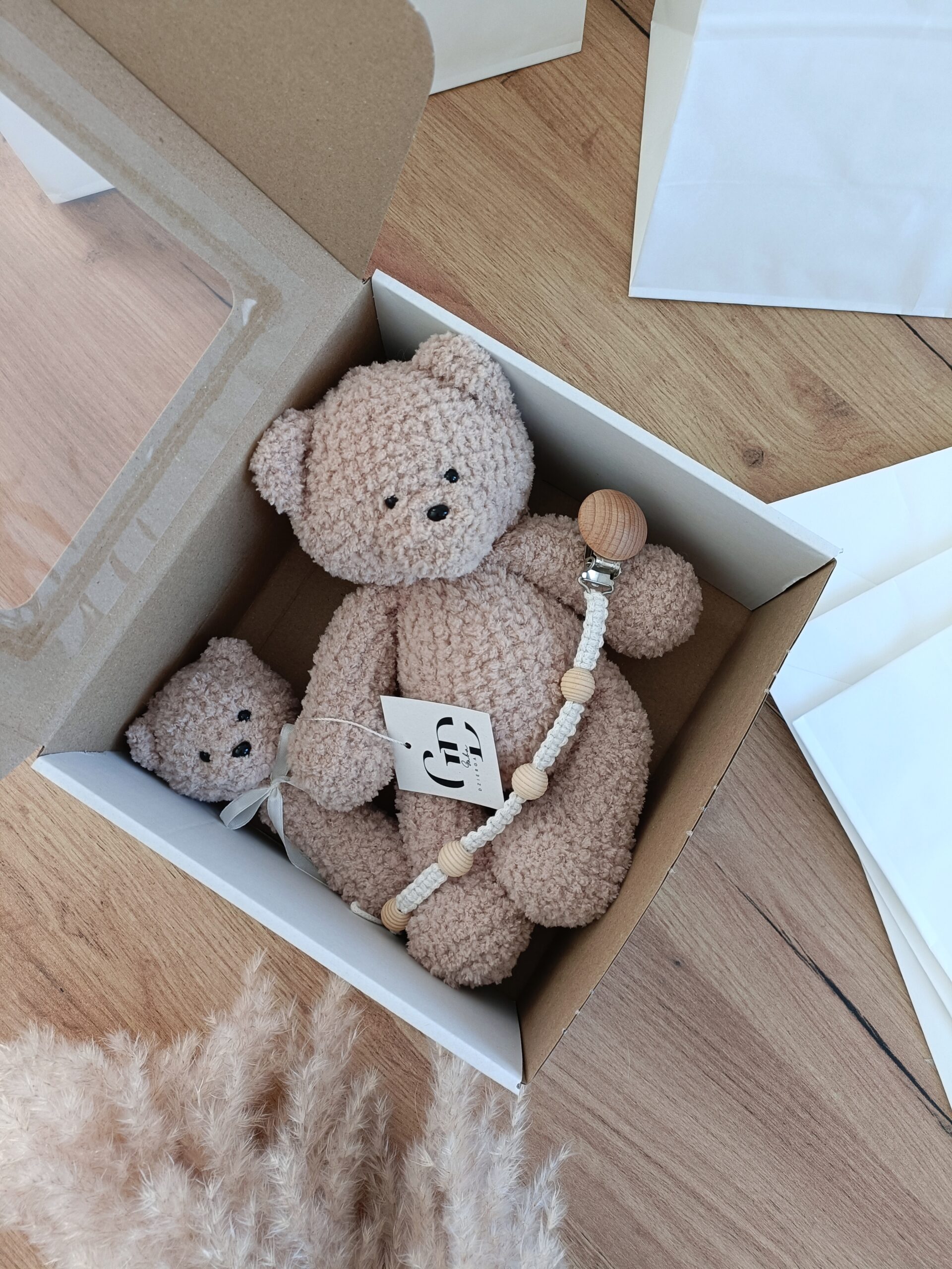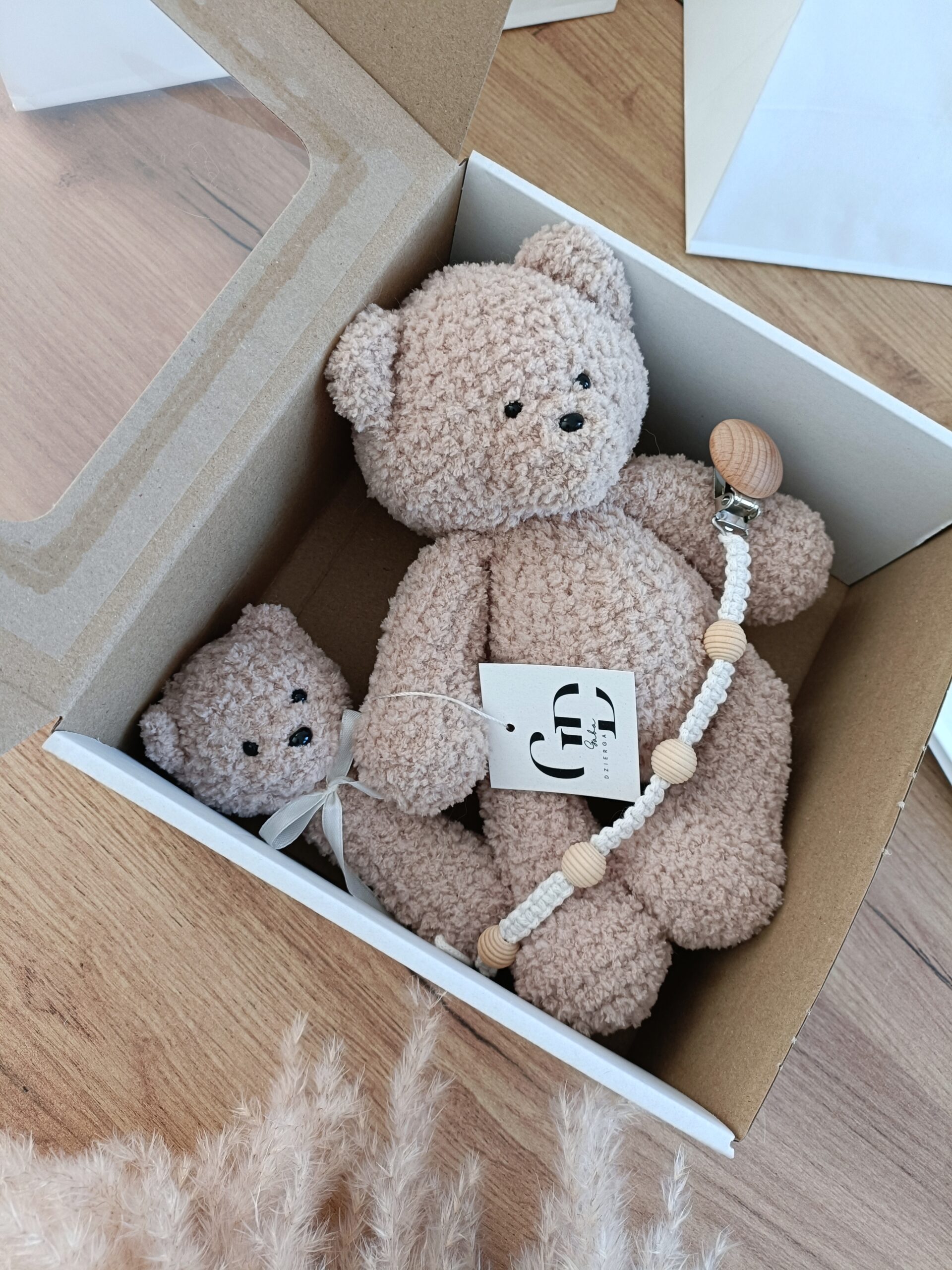 W eleganckim białym pudełku z okienkiem znajduje się miś mierzący ok. 24 cm, urocza grzechotka i zawieszka do smoczka.