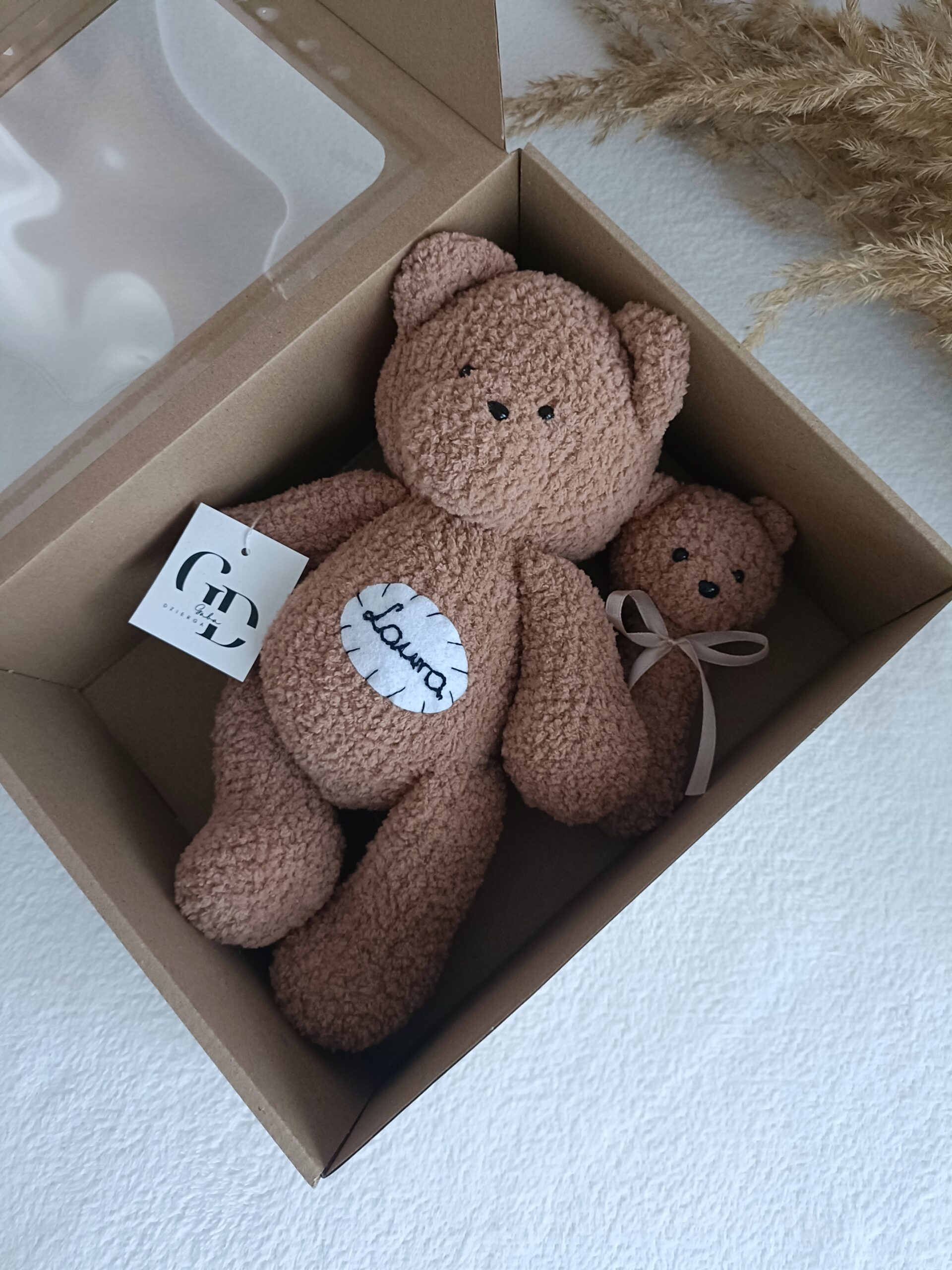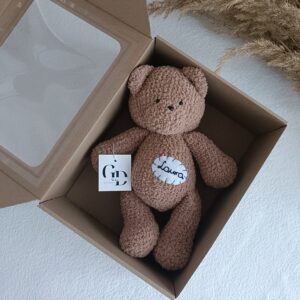 Personalizowany miś z kolekcji Boucle Bear wykonany na szydełku z wyjątkowo milutkiej włóczki posiadającej certyfikat jakości OEKO-TEX Standard 100. Wypełniony antyalergiczną kulką silikonową przeznaczoną do maskotek. Miś mierzy ok. 30 cm. Kolor brązowy nr 199.