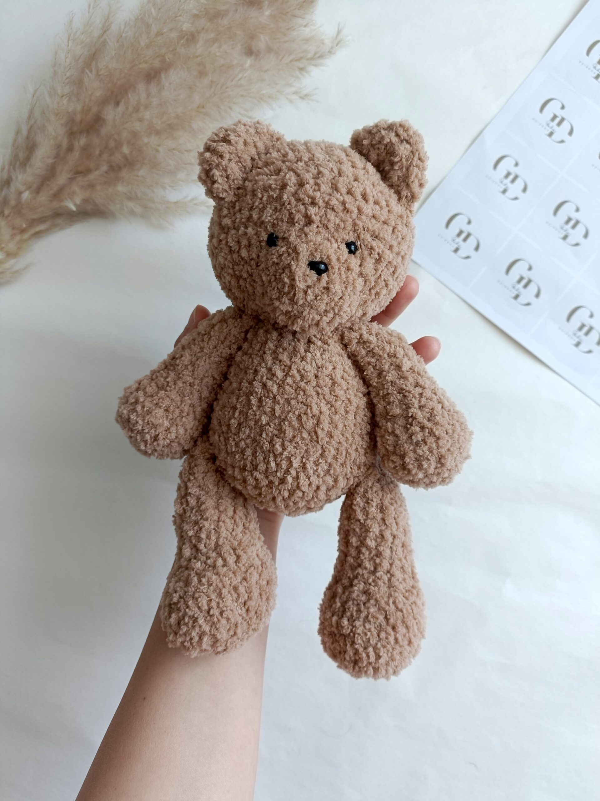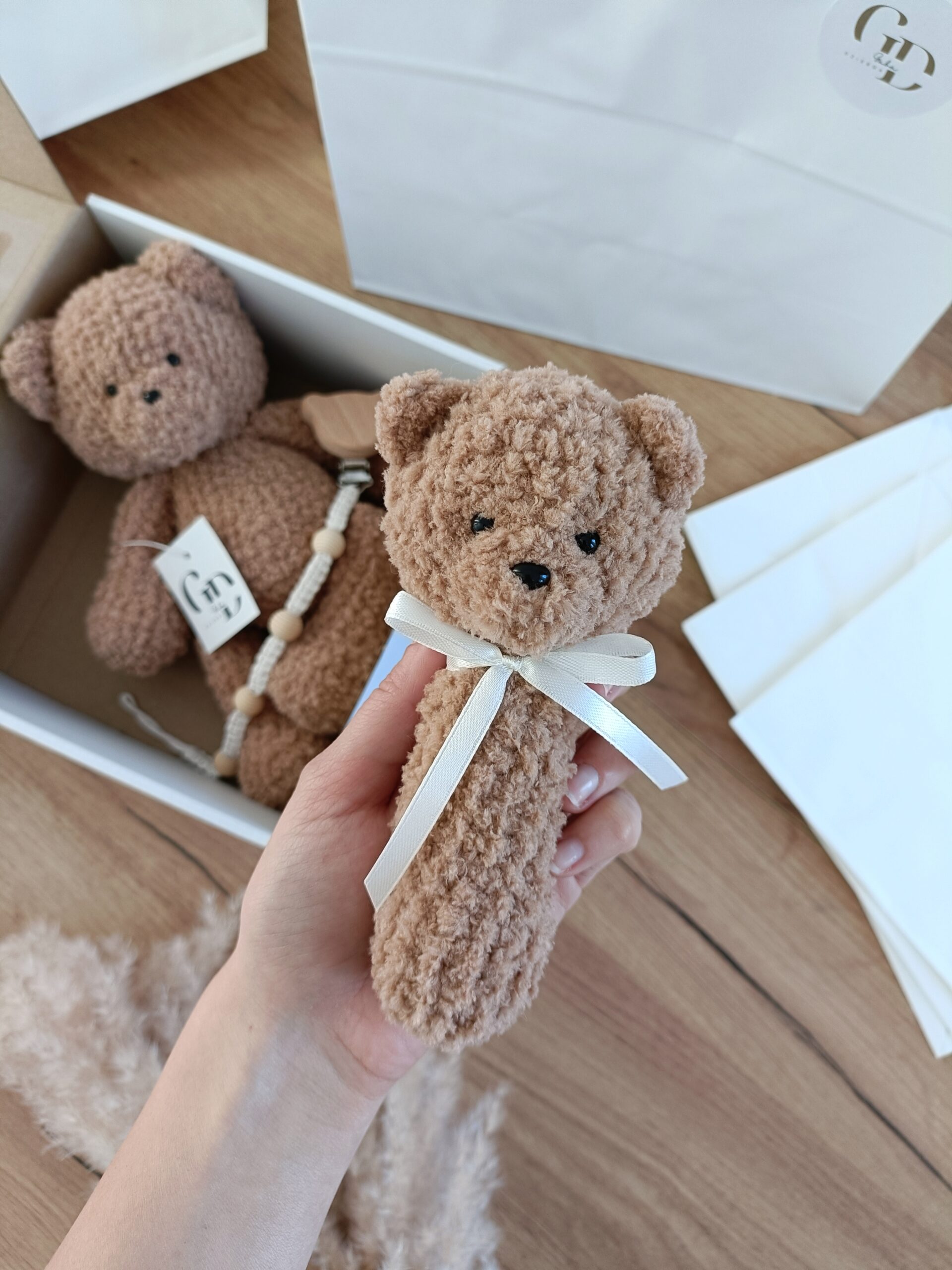 Miś i grzechotka wykonane na szydełku z wyjątkowo milutkiej włóczki posiadającej certyfikat jakości OEKO-TEX Standard 100, wypełnione specjalnym wypełnieniem do maskotek. Kolor brązowy nr 199.