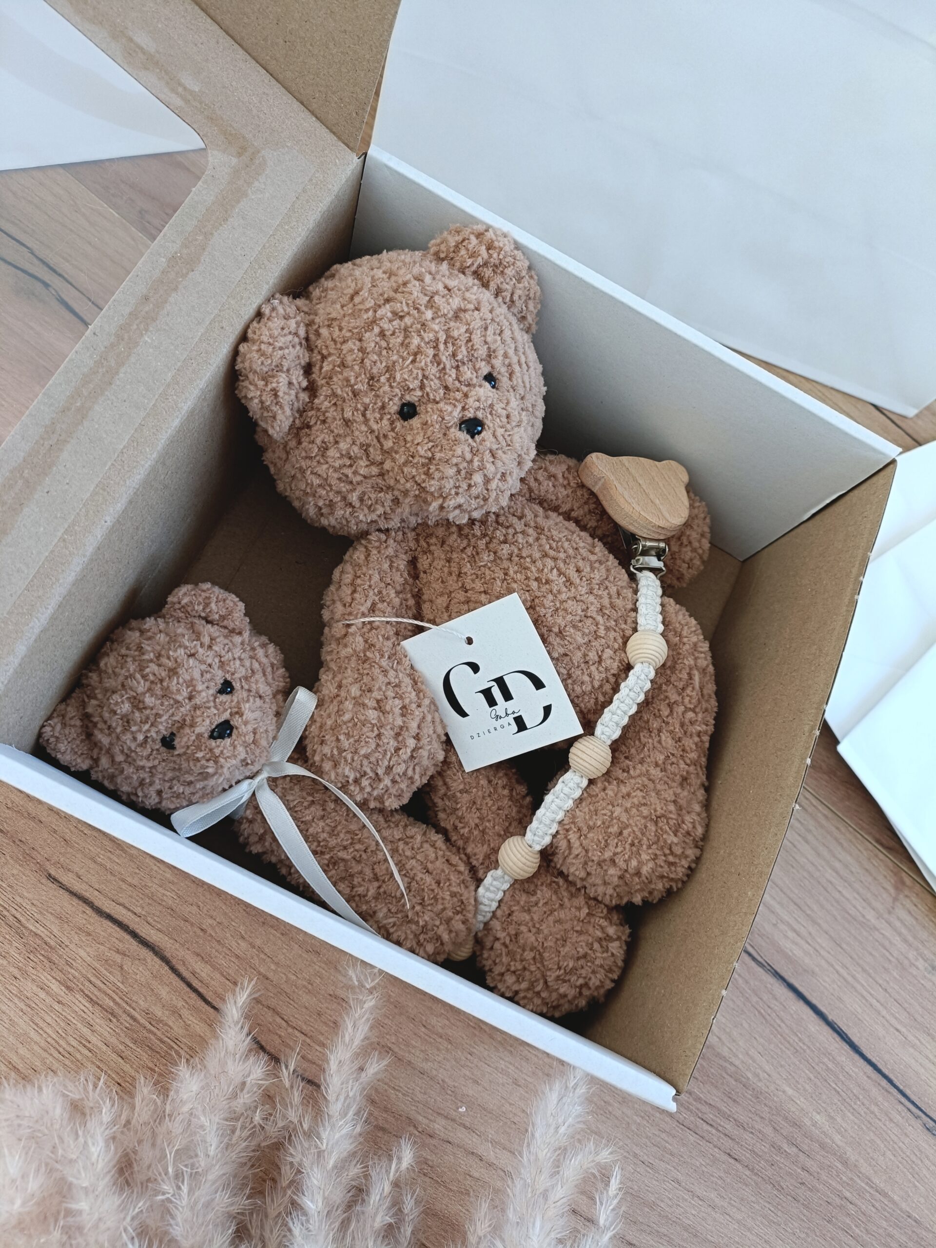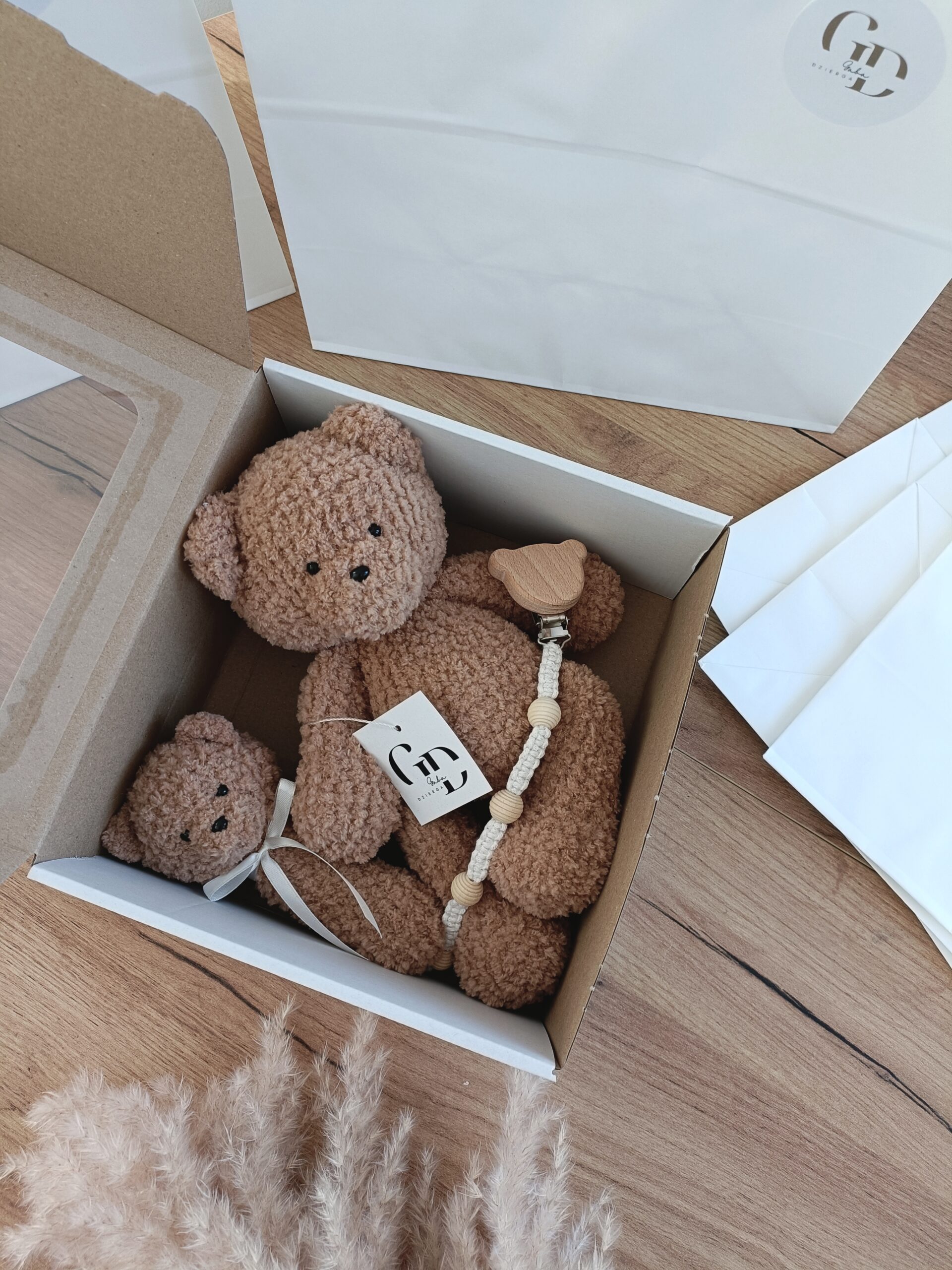 W eleganckim białym pudełku z okienkiem znajduje się miś mierzący ok. 24 cm, urocza grzechotka i zawieszka do smoczka.