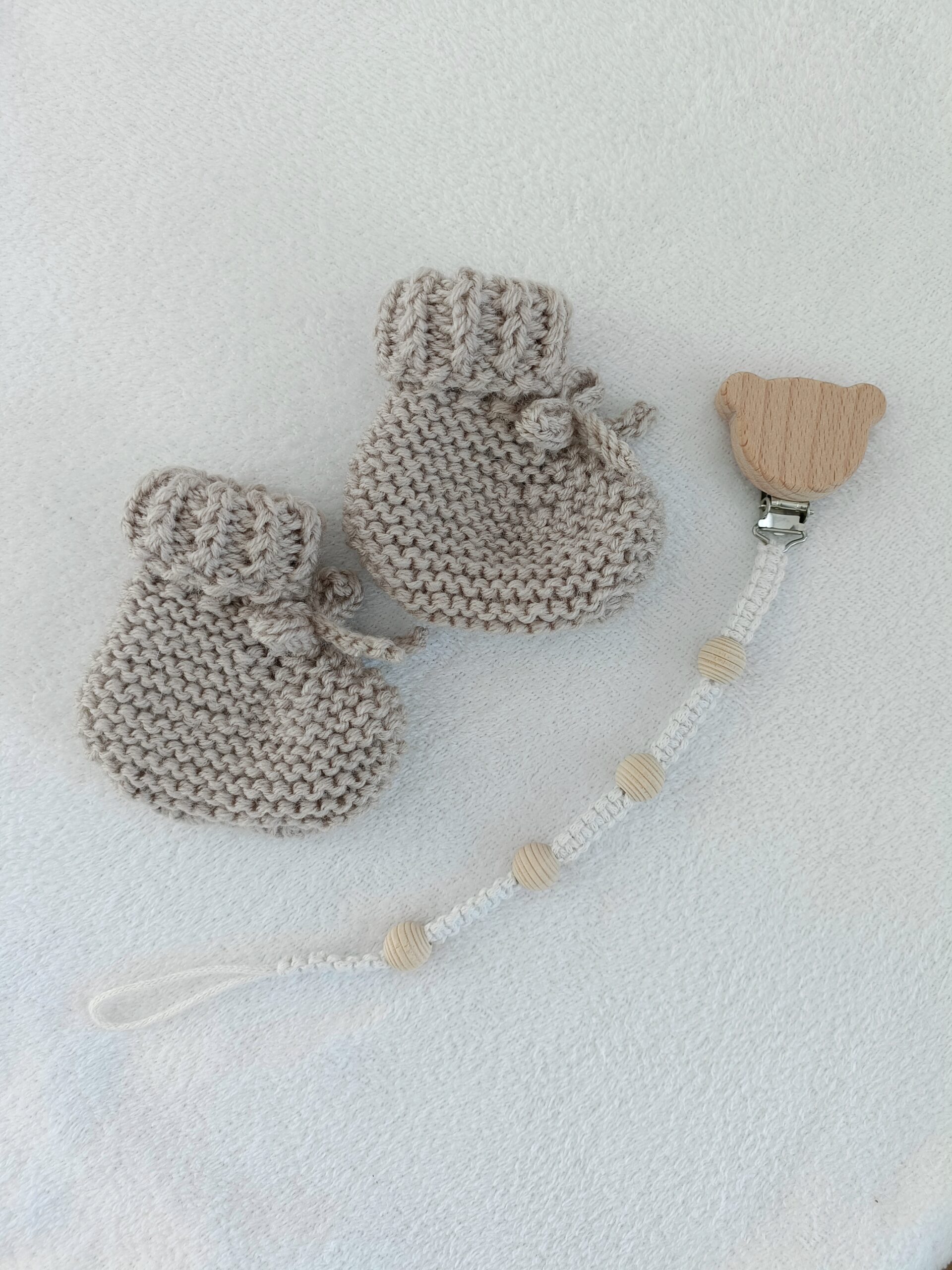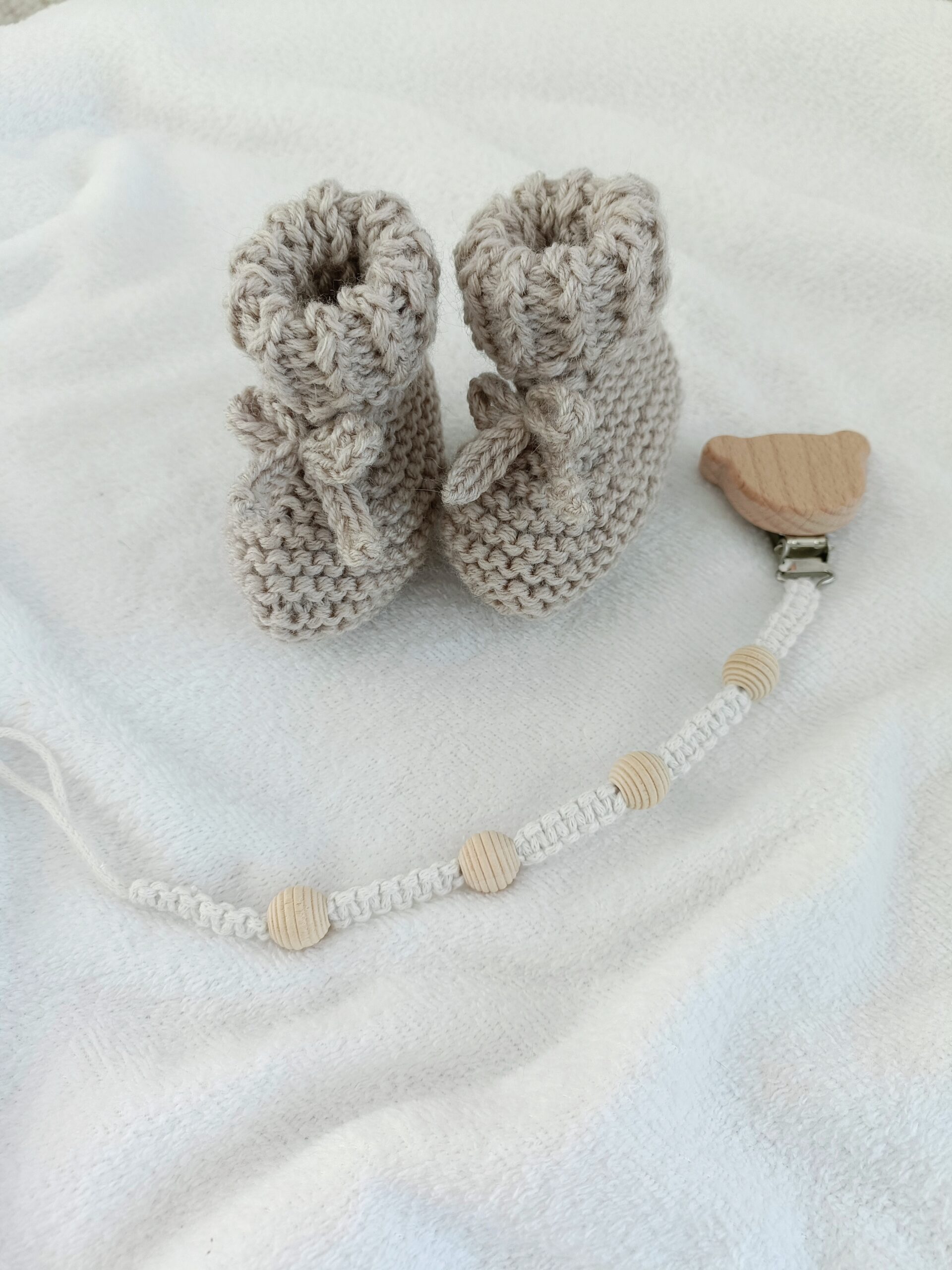Zestaw handmade dla noworodka – buciki i zawieszka do smoczka