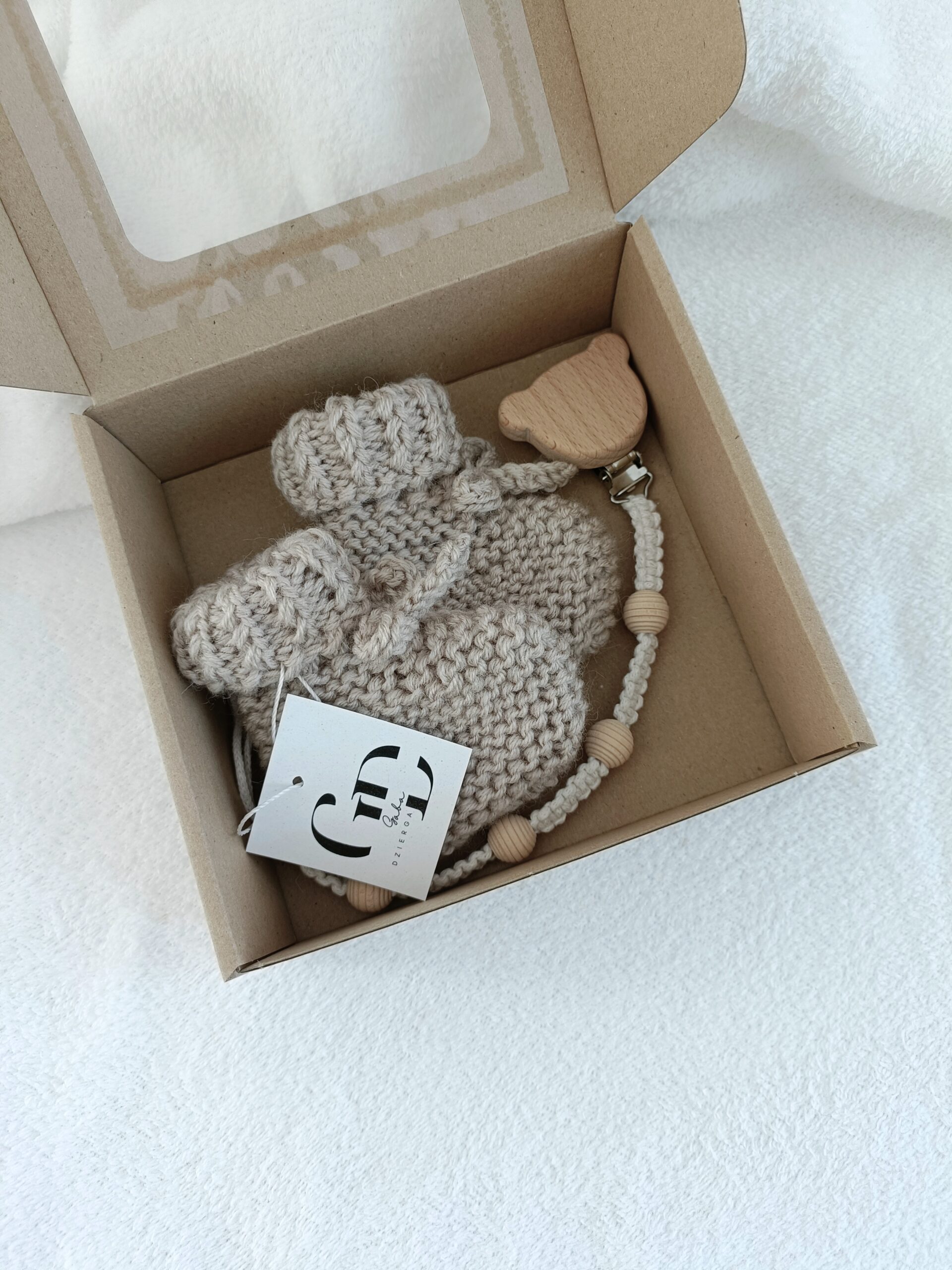 Podaruj swojemu maluszkowi komfort i styl od pierwszych dni życia dzięki ręcznie wykonanym produktom z naturalnych materiałów. Zestaw składa się z bucików wykonanych na drutach i praktycznej zawieszki do smoczka wykonanej metodą makramy. Każdy element został stworzony z dbałością o szczegóły.