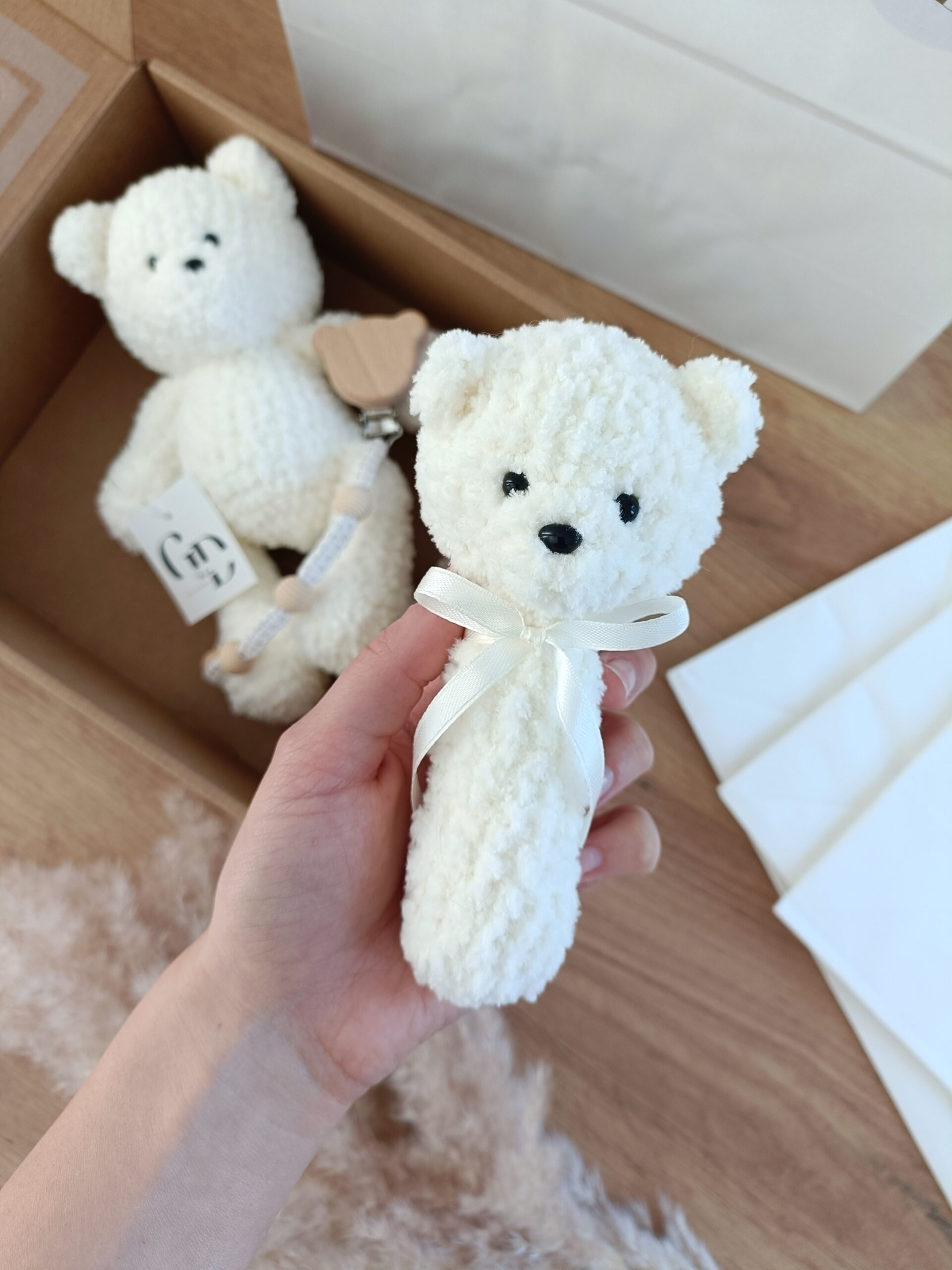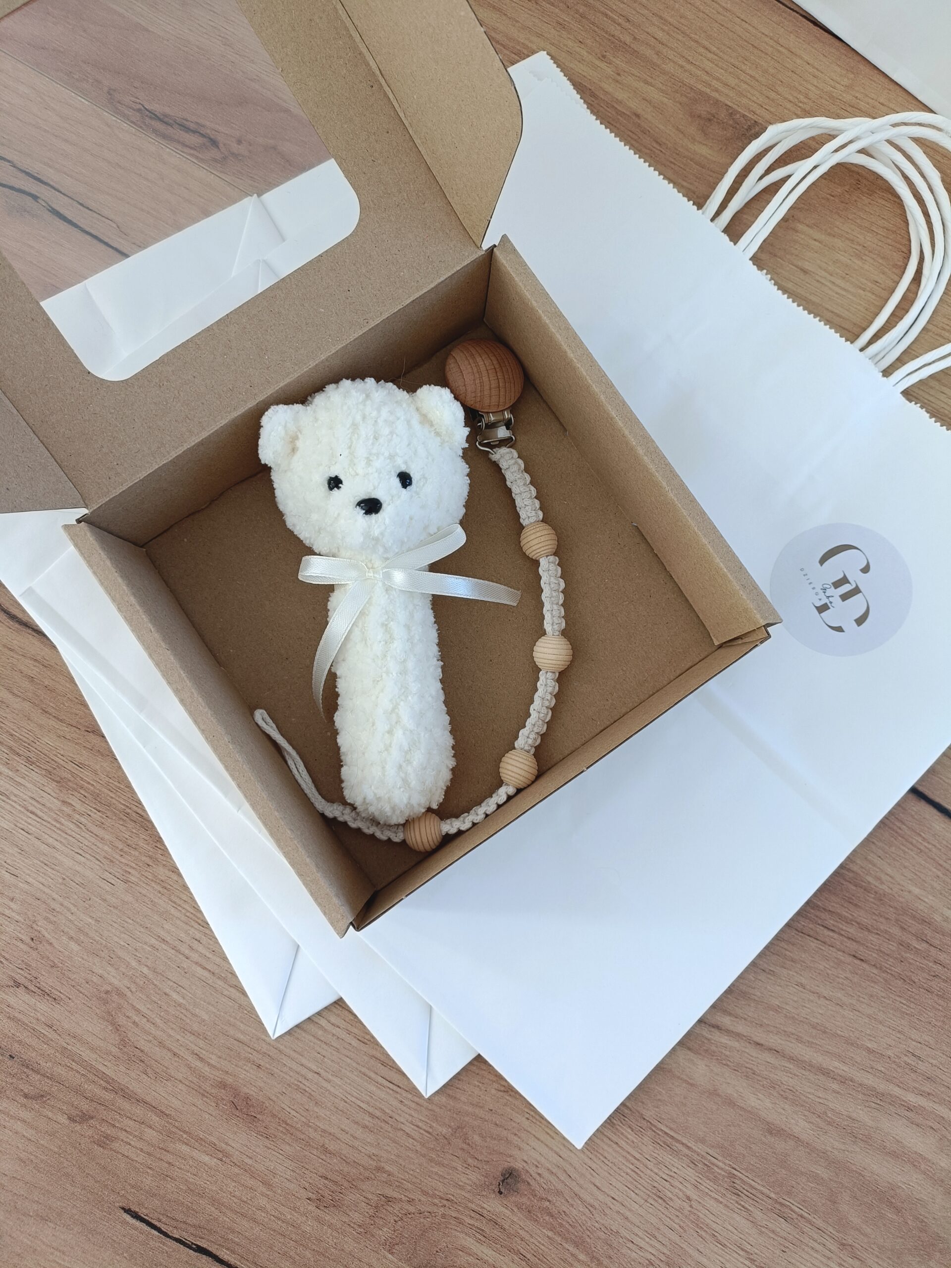 - Grzechotka miś wykonana na szydełku z certyfikowanych materiałów, wypełniona antyalergiczną kulką silikonową. Mierzy ok. 13 cm. Ozdobiona jest delikatną kokardką. Kolor ecru nr 62.