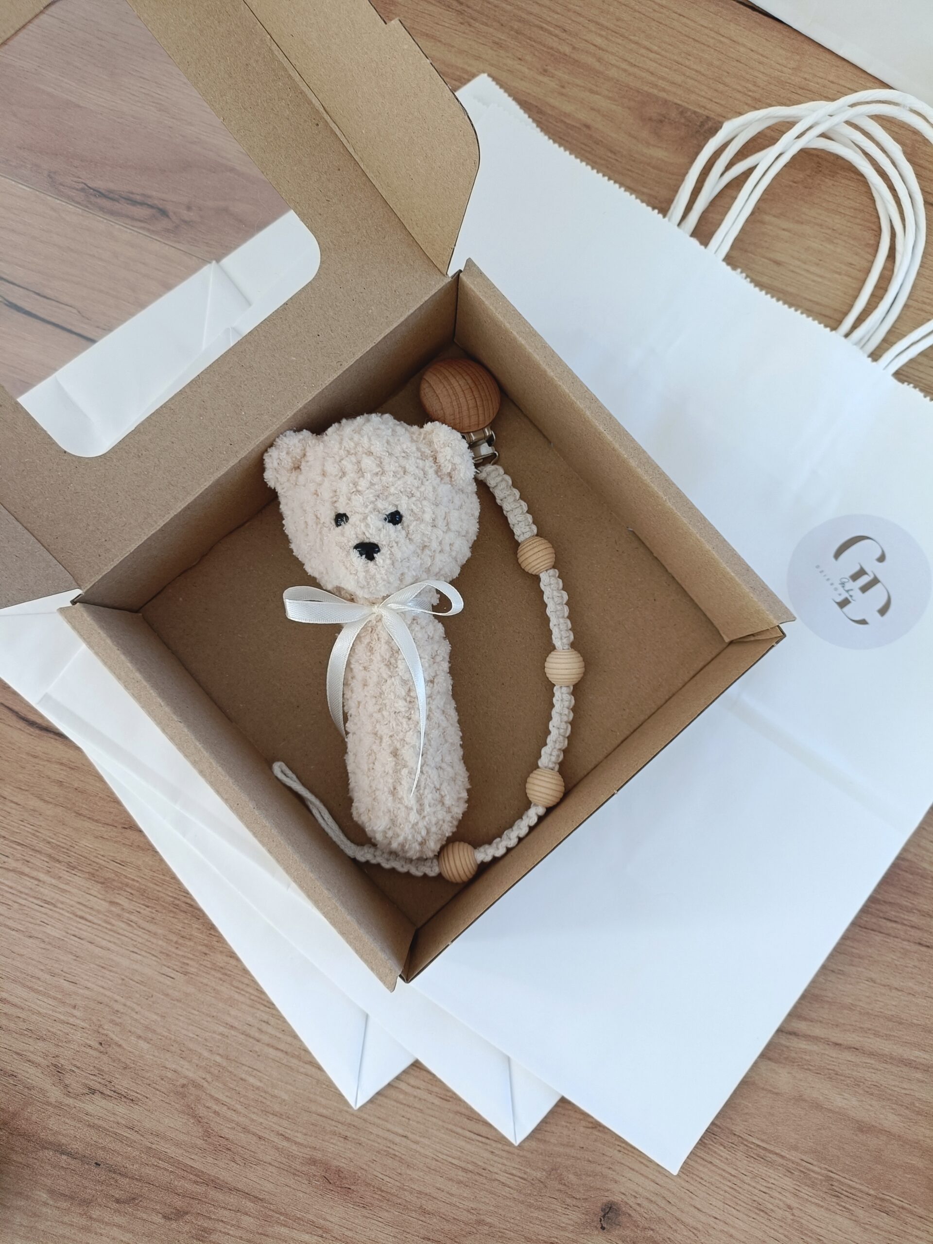 - Zawieszka do smoczka z drewnianym klipsem, wykonana ręcznie metodą makramy.