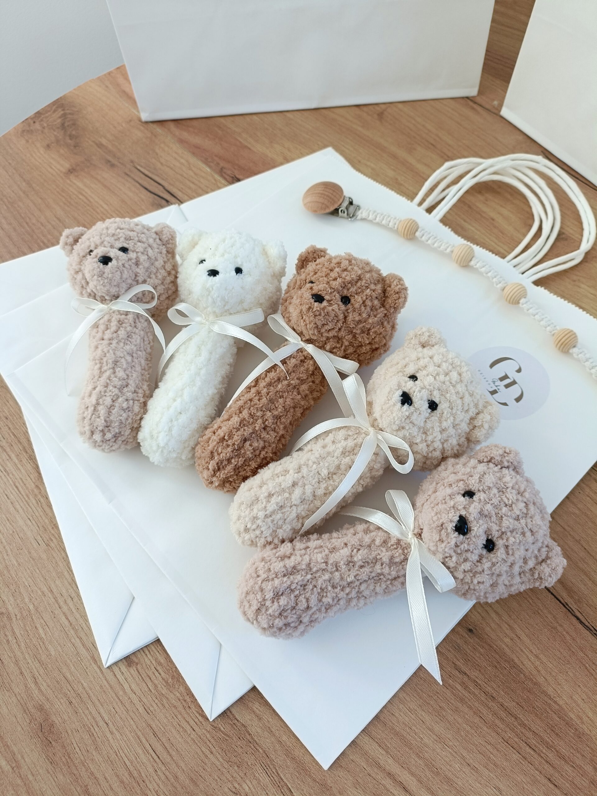 - Grzechotka miś wykonana na szydełku z certyfikowanych materiałów, wypełniona antyalergiczną kulką silikonową. Mierzy ok. 13 cm. Ozdobiona jest delikatną kokardką. Kolor jasny beż nr 310.