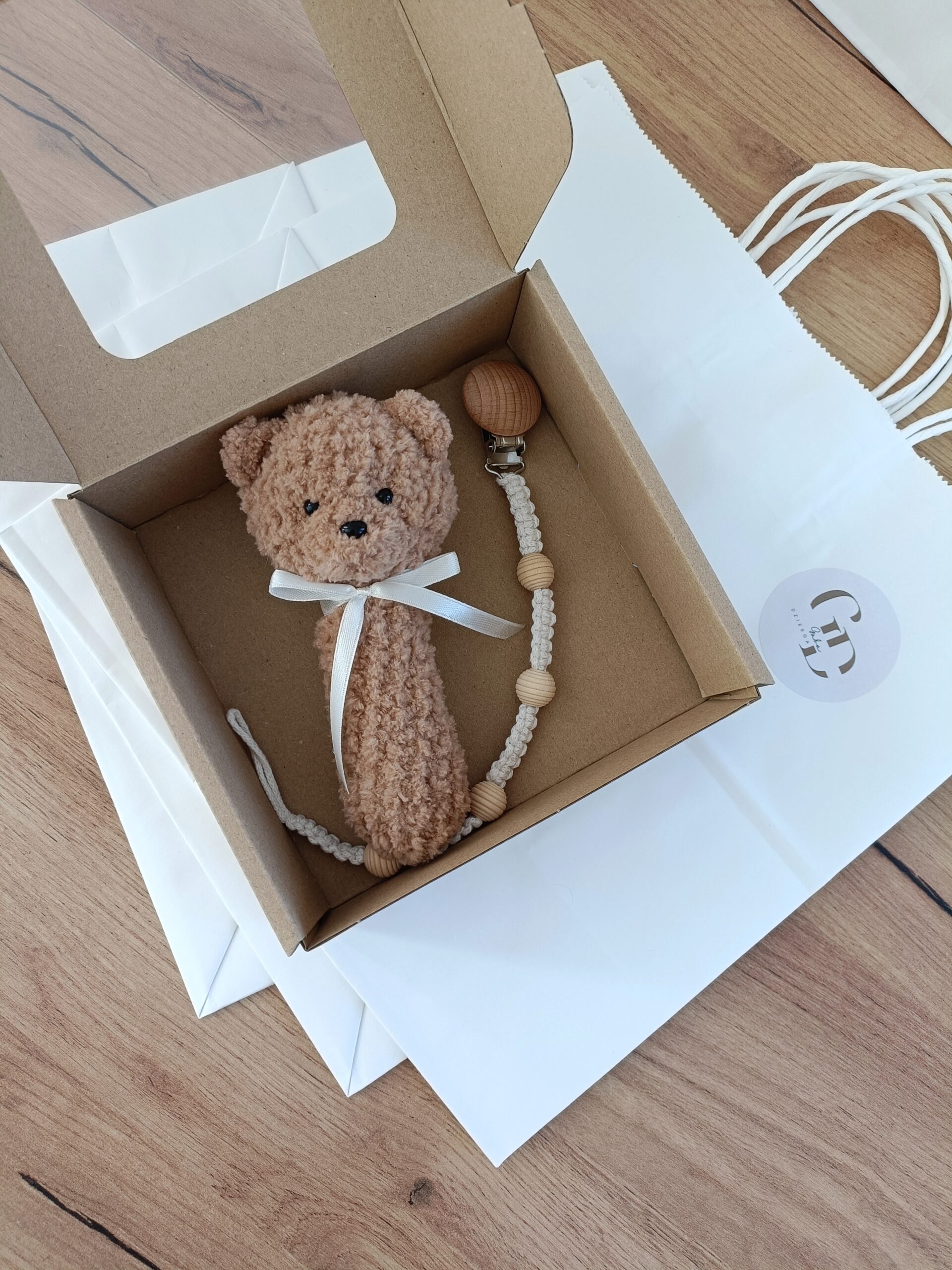 - Zawieszka do smoczka z drewnianym klipsem, wykonana ręcznie metodą makramy.