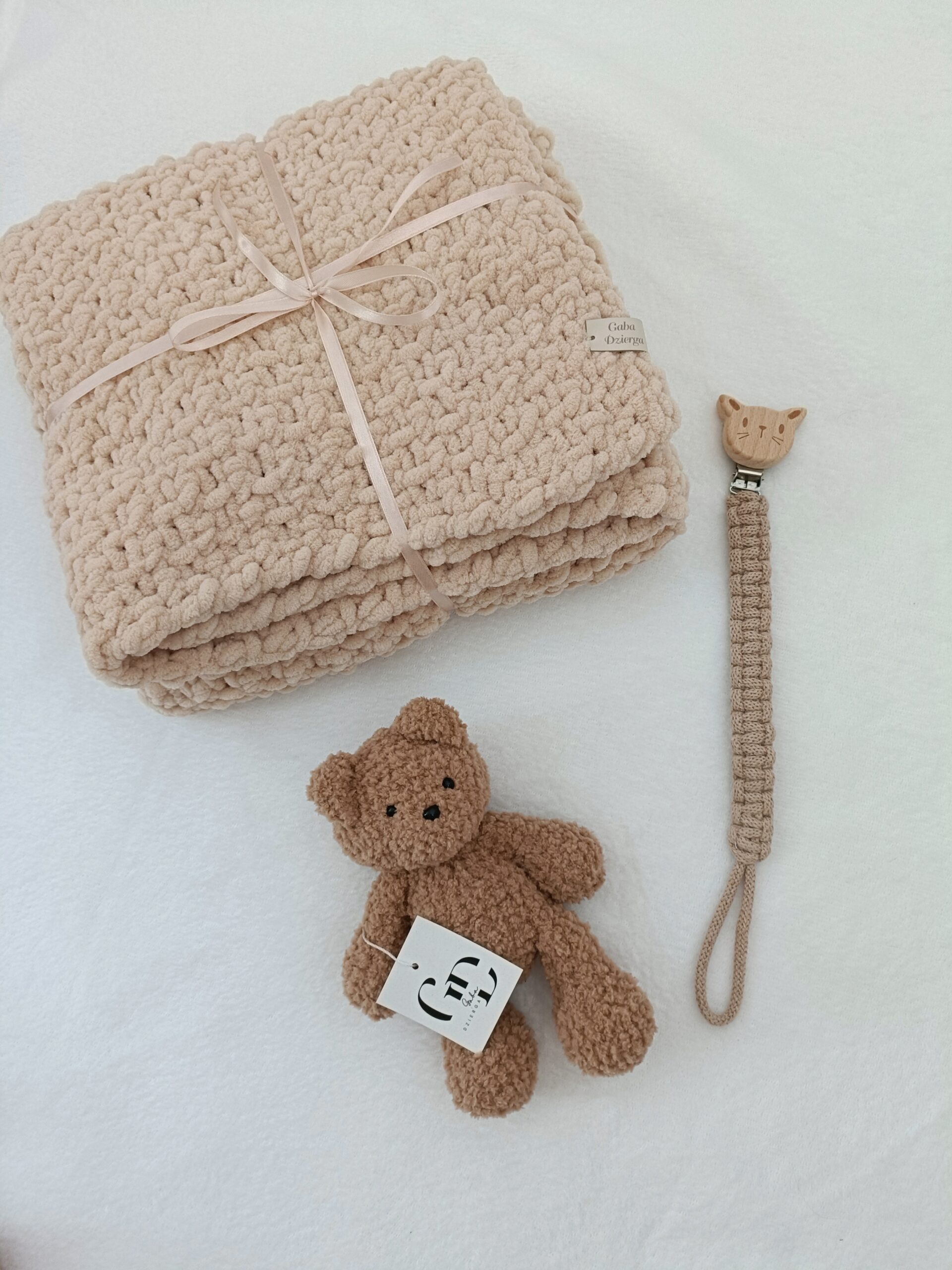 - Kocyk zrobiony na drutach o wymiarach ok. 70 × 80 cm, który zapewni maluszkowi ciepło i komfort podczas snu, spacerów czy odpoczynku. Dzięki swojej strukturze jest miękki i bardzo przyjemny w użytkowaniu.