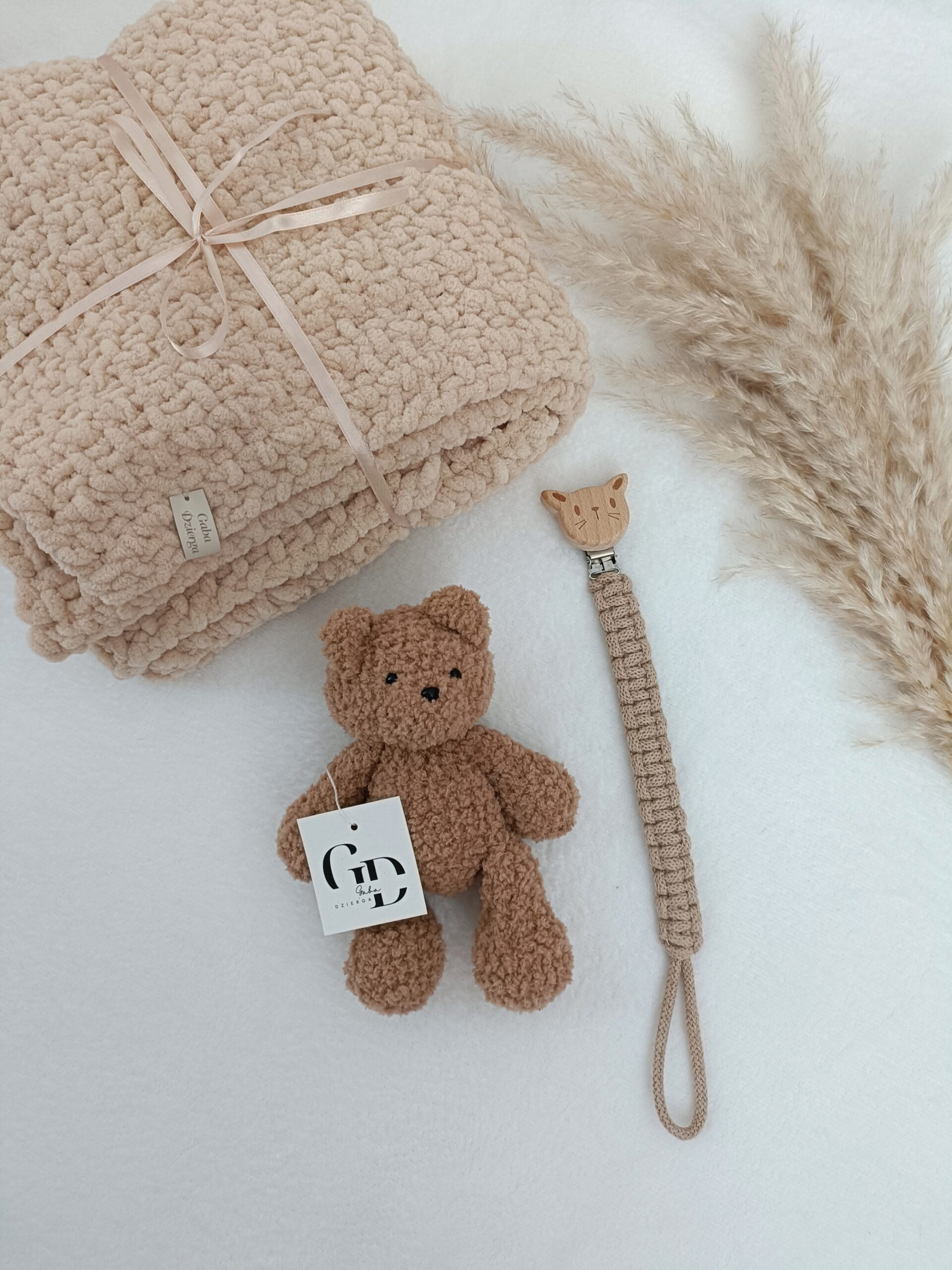 W skład zestawu wchodzą trzy starannie wykonane produkty z kolekcji Boucle Bear: