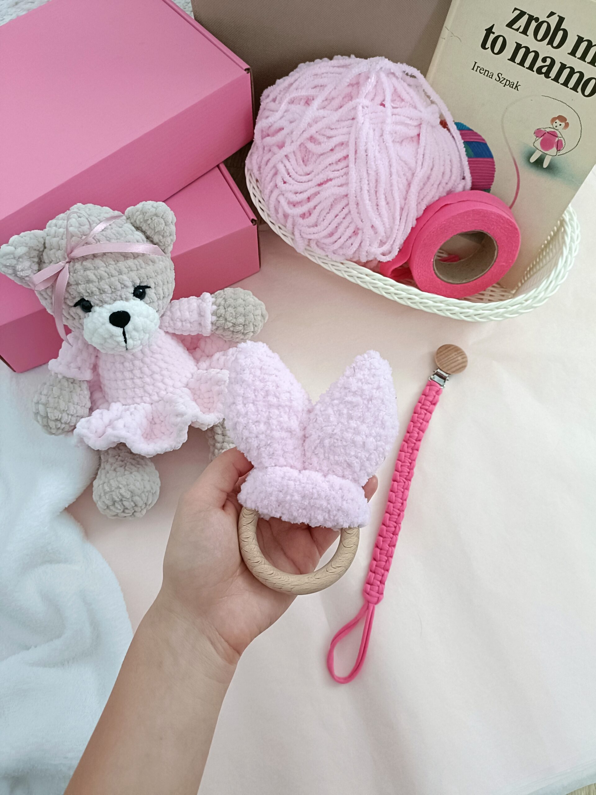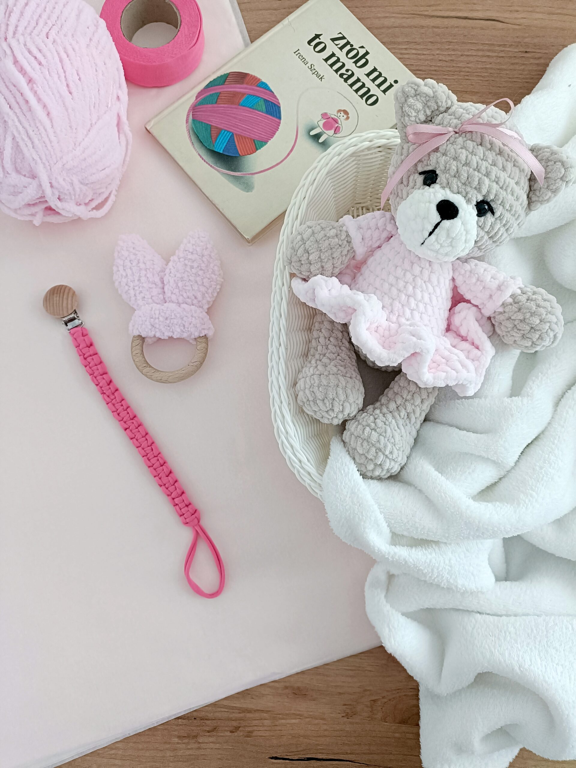 Zestaw handmade – szydełkowy miś, zawieszka do smoczka , szeleszczące uszy