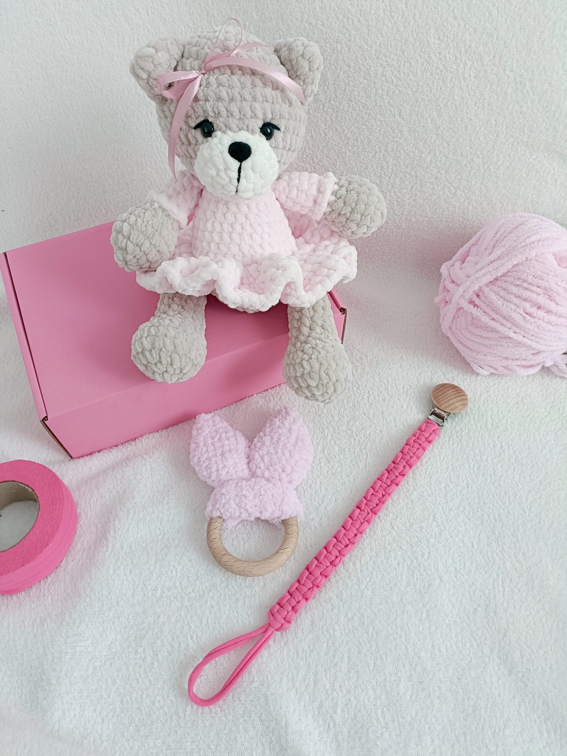 Ten wyjątkowy zestaw wykonany na szydełku to starannie przygotowane rękodzieło, które wyróżnia się estetyką i dopracowanymi detalami. W komplecie znajduje się uroczy miś w sukience mierzący ok. 26 cm, delikatnie szeleszczące uszy na drewnianym kółku oraz zawieszka do smoczka z drewnianym klipsem.